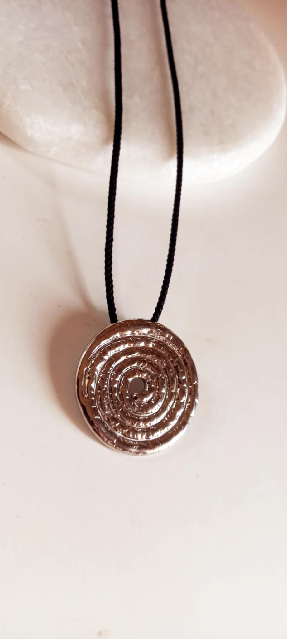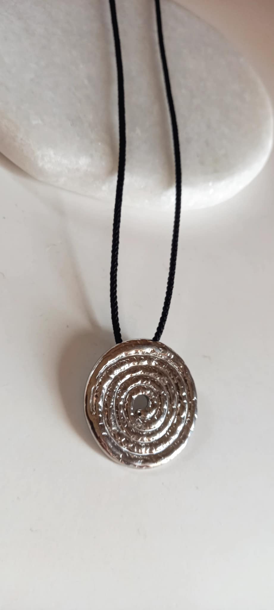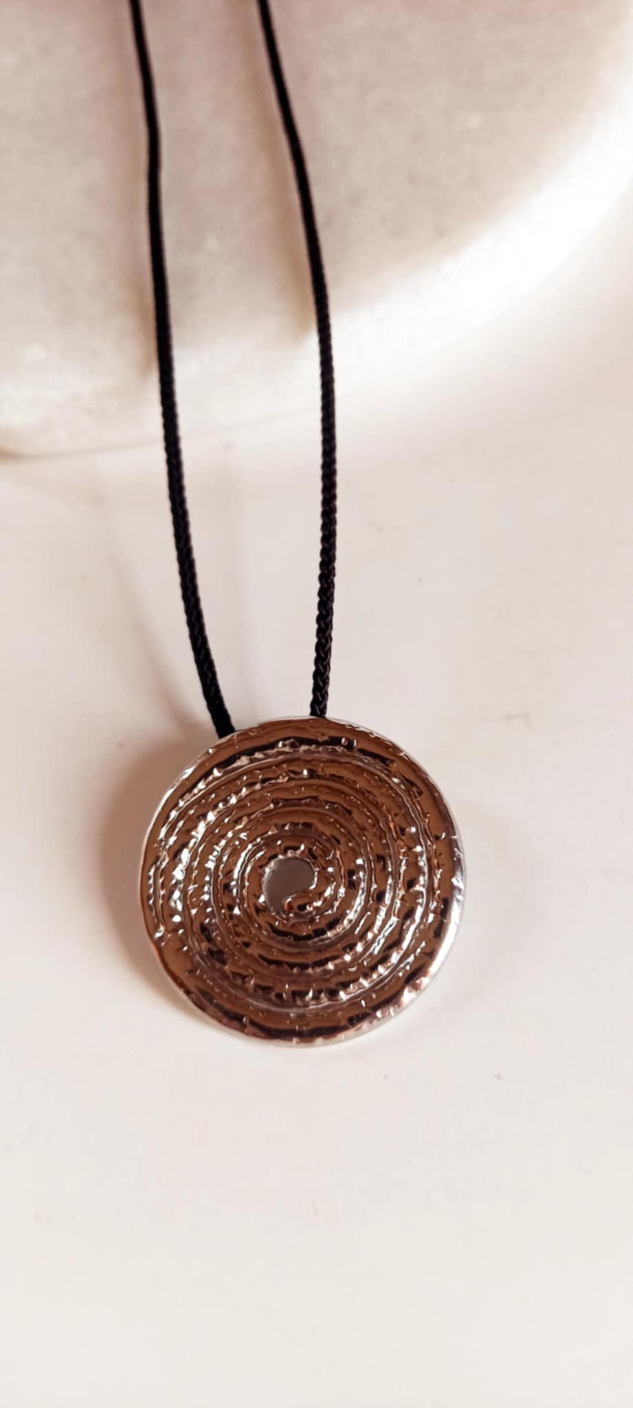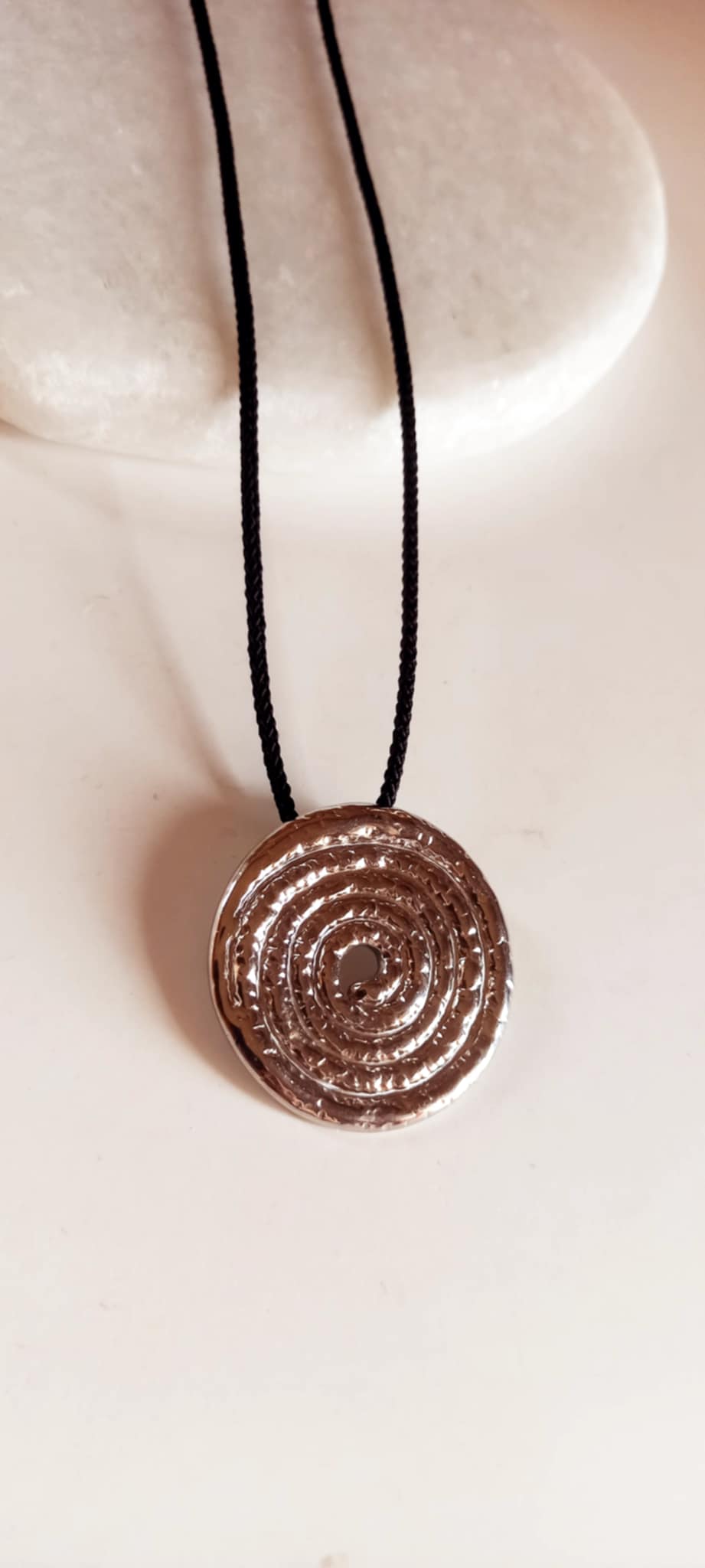 Εντυπωσιακό κολιέ με πολυτελές κορδόνι σε μαύρο χρώμα και στρογγυλό ανάγλυφο μοτίφ.