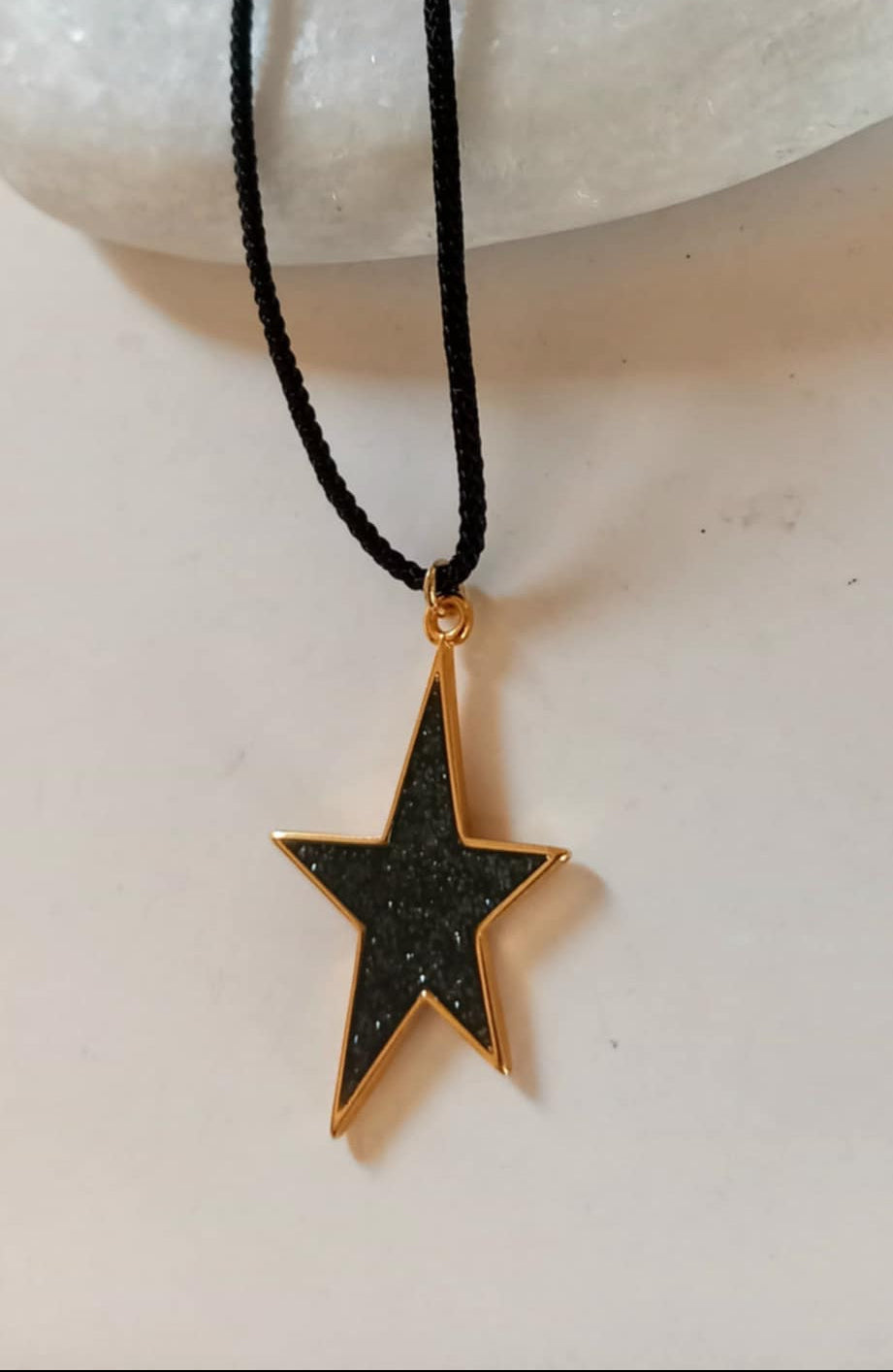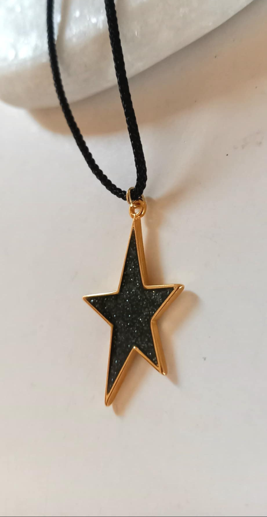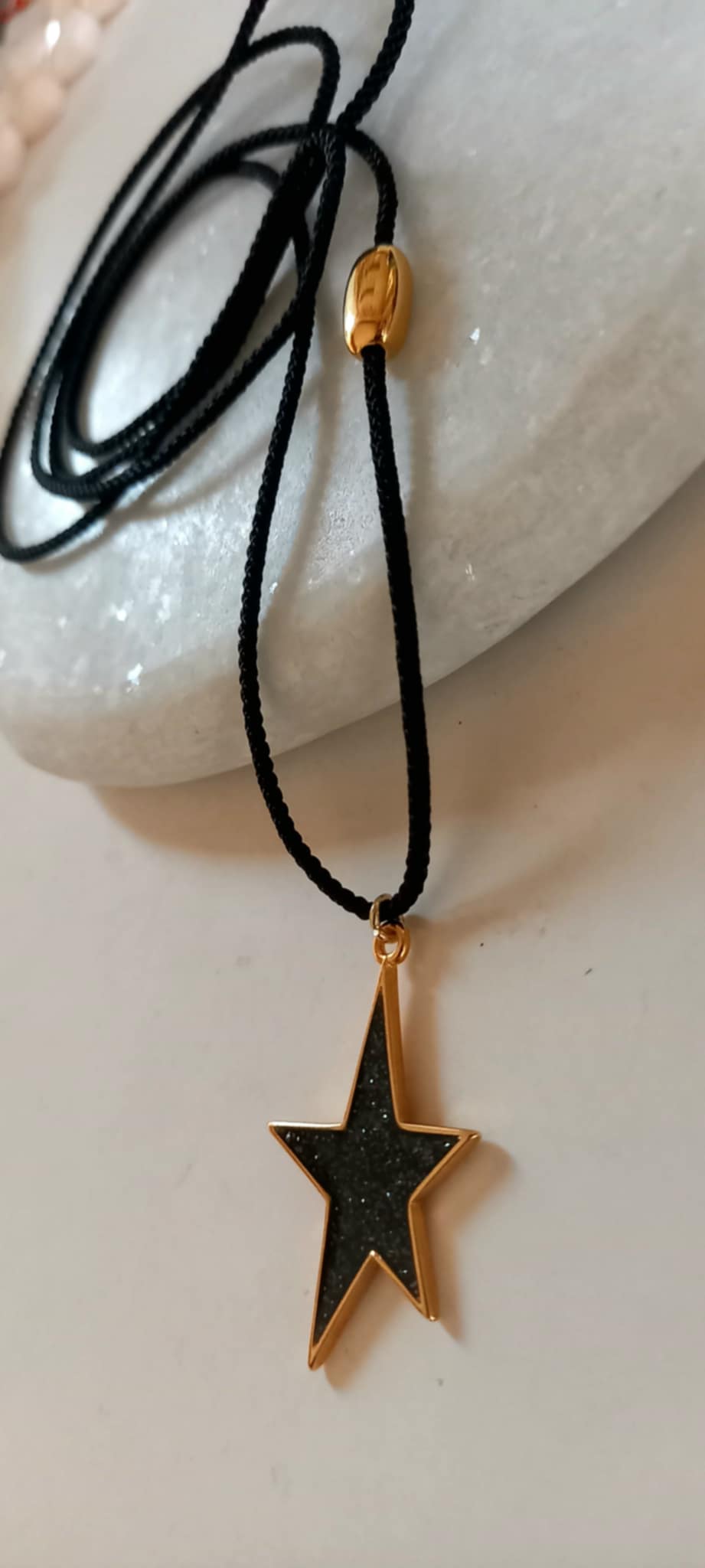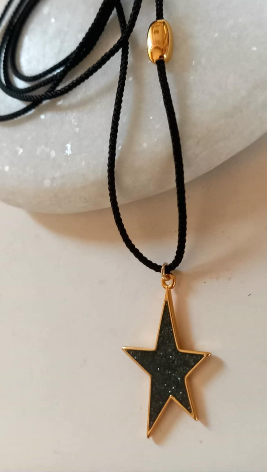 Εντυπωσιακό κολιέ με κορδόνι σε μαύρο χρώμα, ενωτικό επιχρυσωμένο στοιχείο και μοτίφ αστέρι με glitter σμάλτο σε μαύρο χρώμα.
