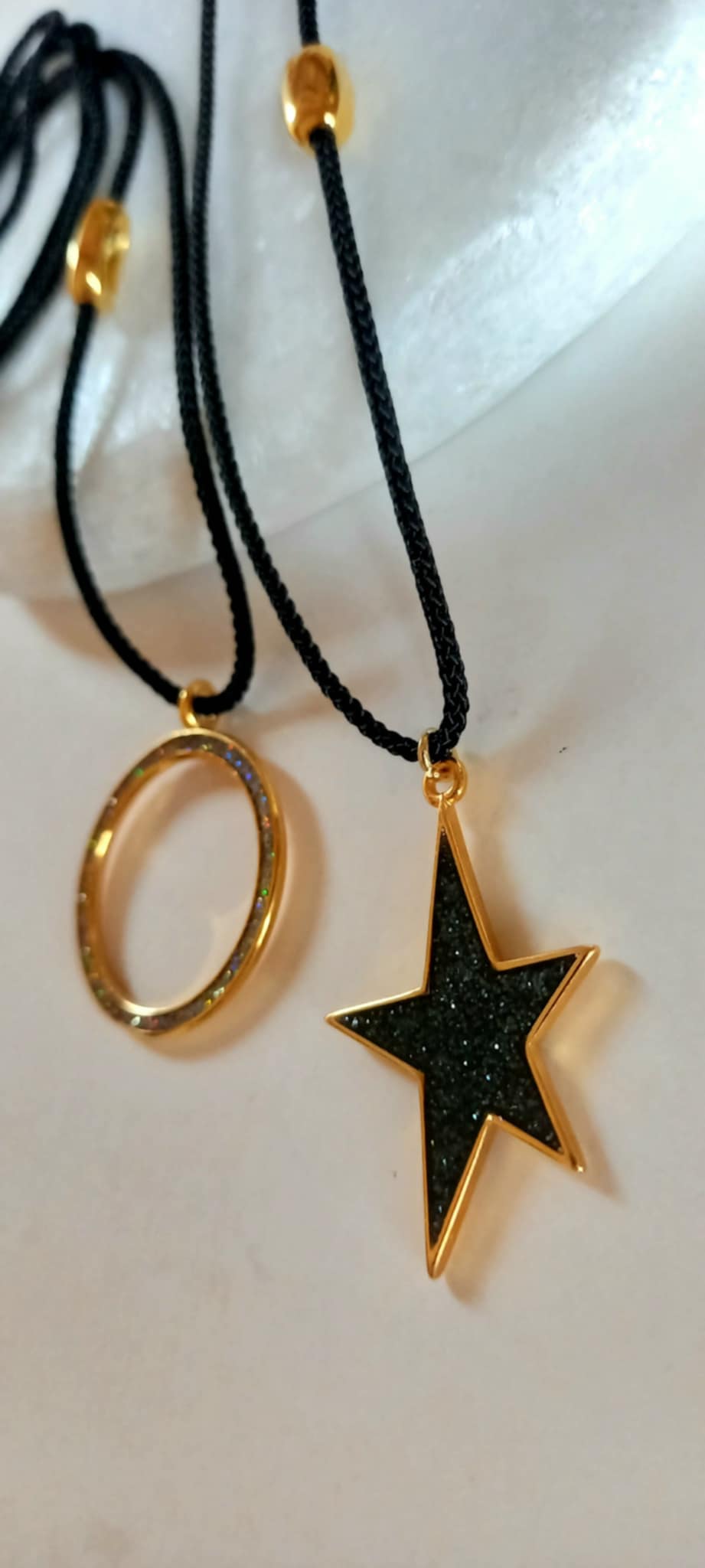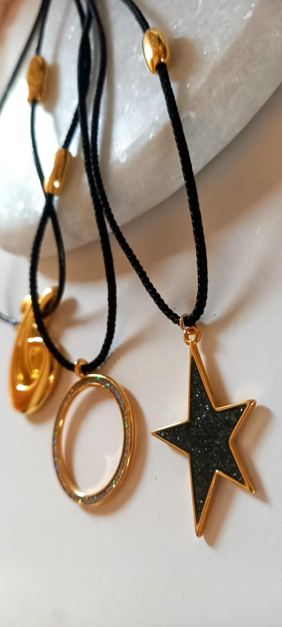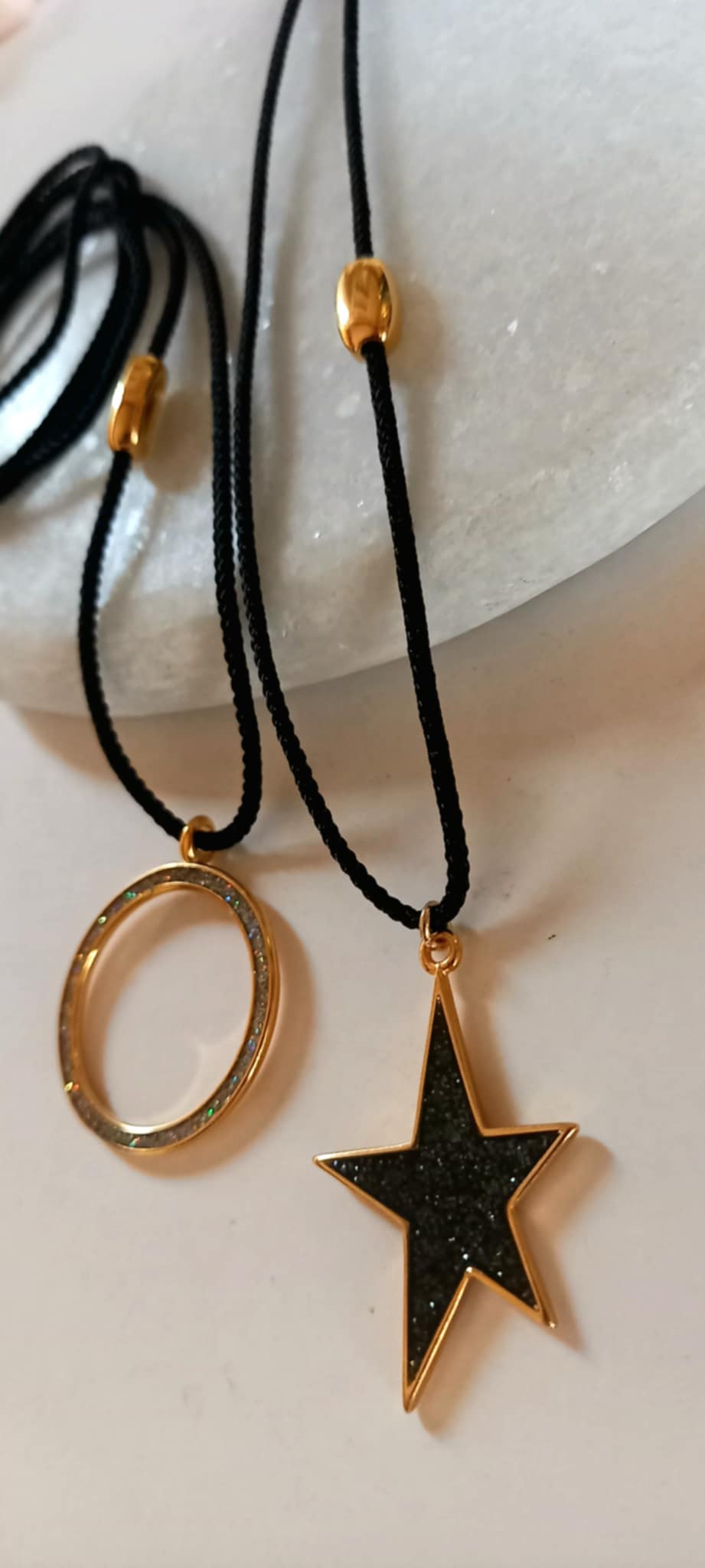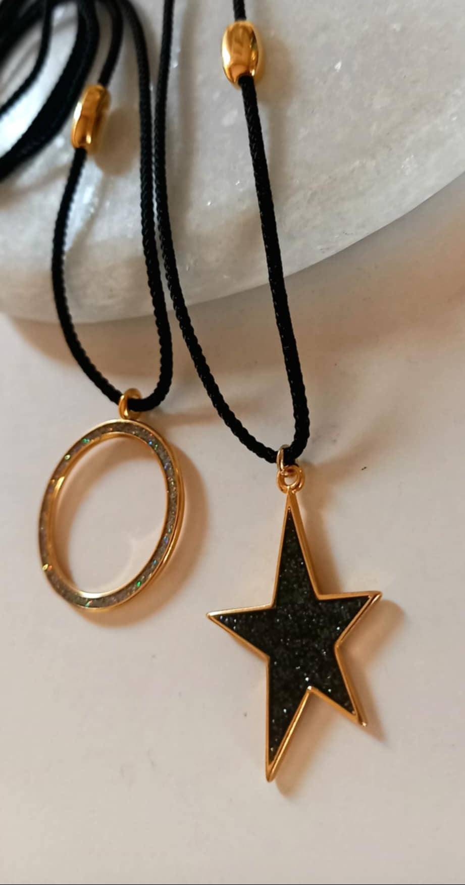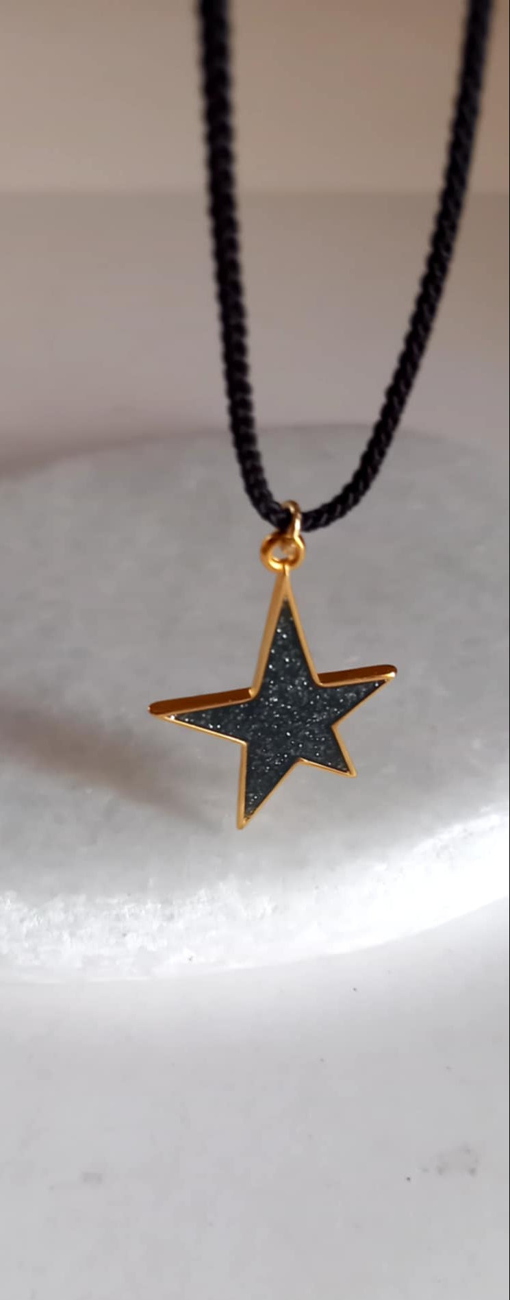 Εντυπωσιακό κολιέ με κορδόνι σε μαύρο χρώμα, ενωτικό επιχρυσωμένο στοιχείο και μοτίφ αστέρι με glitter σμάλτο σε μαύρο χρώμα.