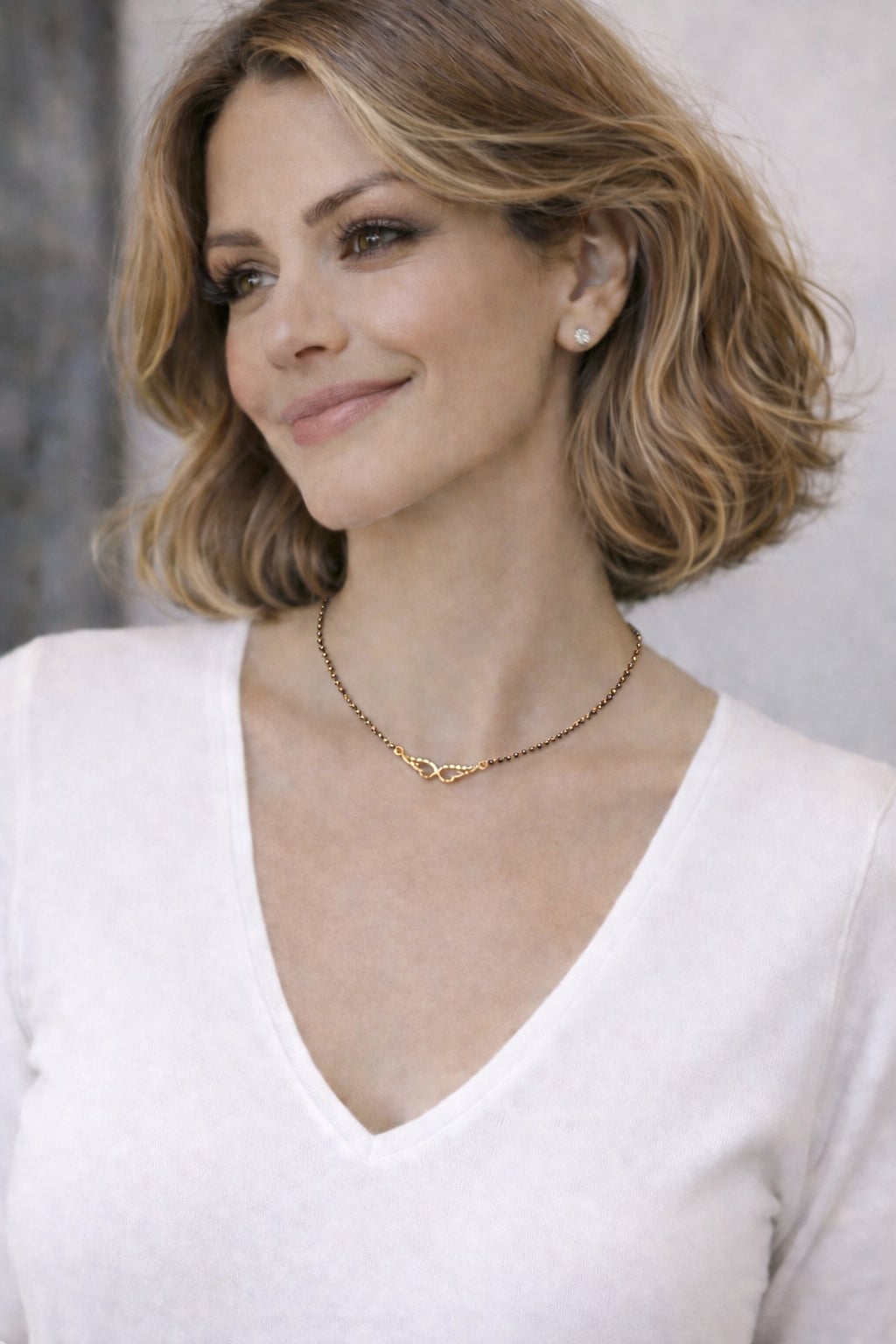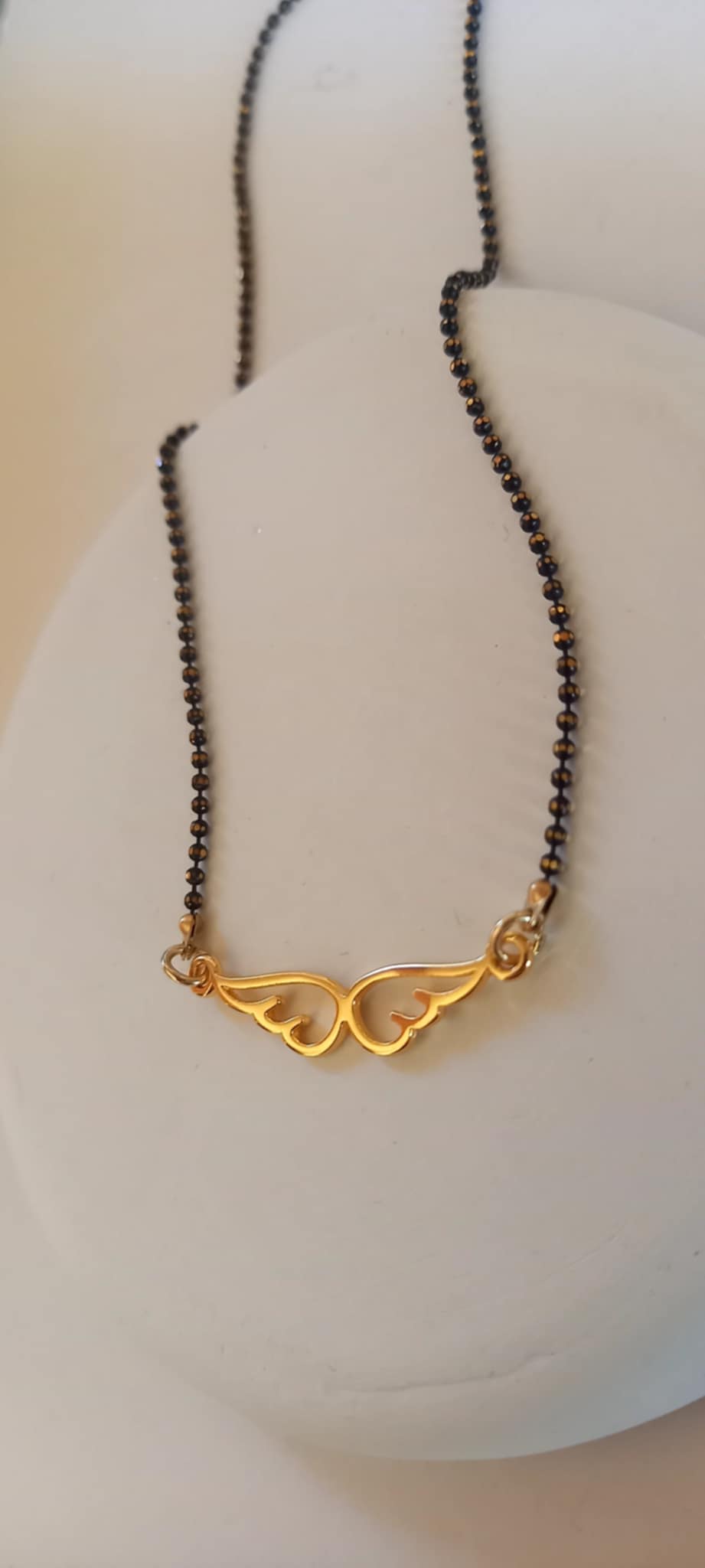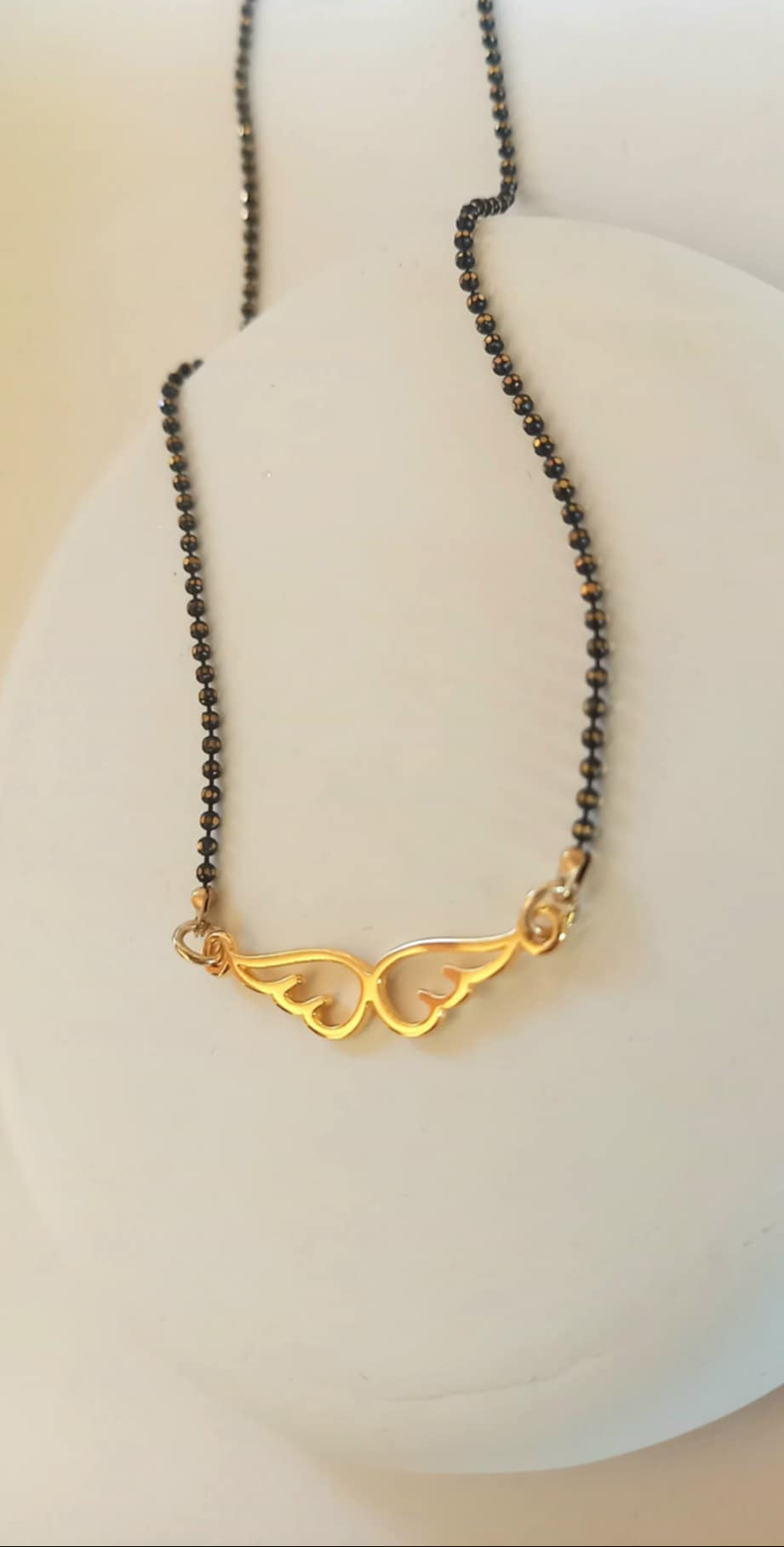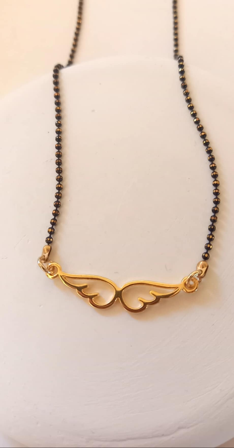 Κομψό κολιέ με αλυσίδα σε μαύρο διαμαντέ χρώμα και επιχρυσωμένο μοτίφ φτερά αγγέλου.
