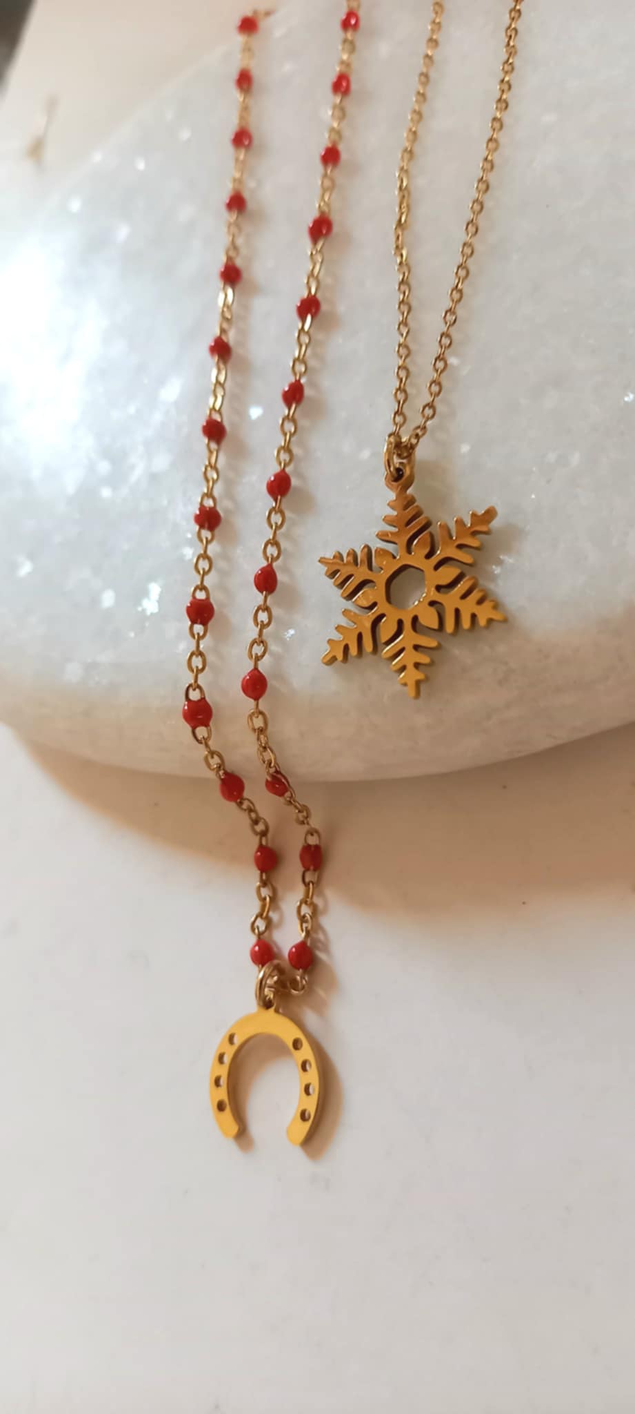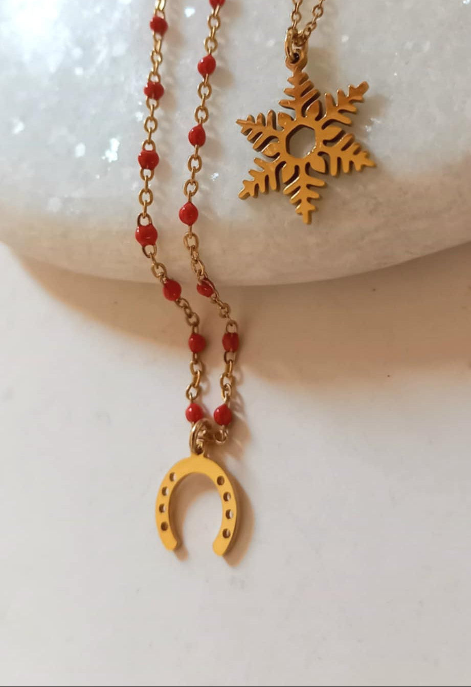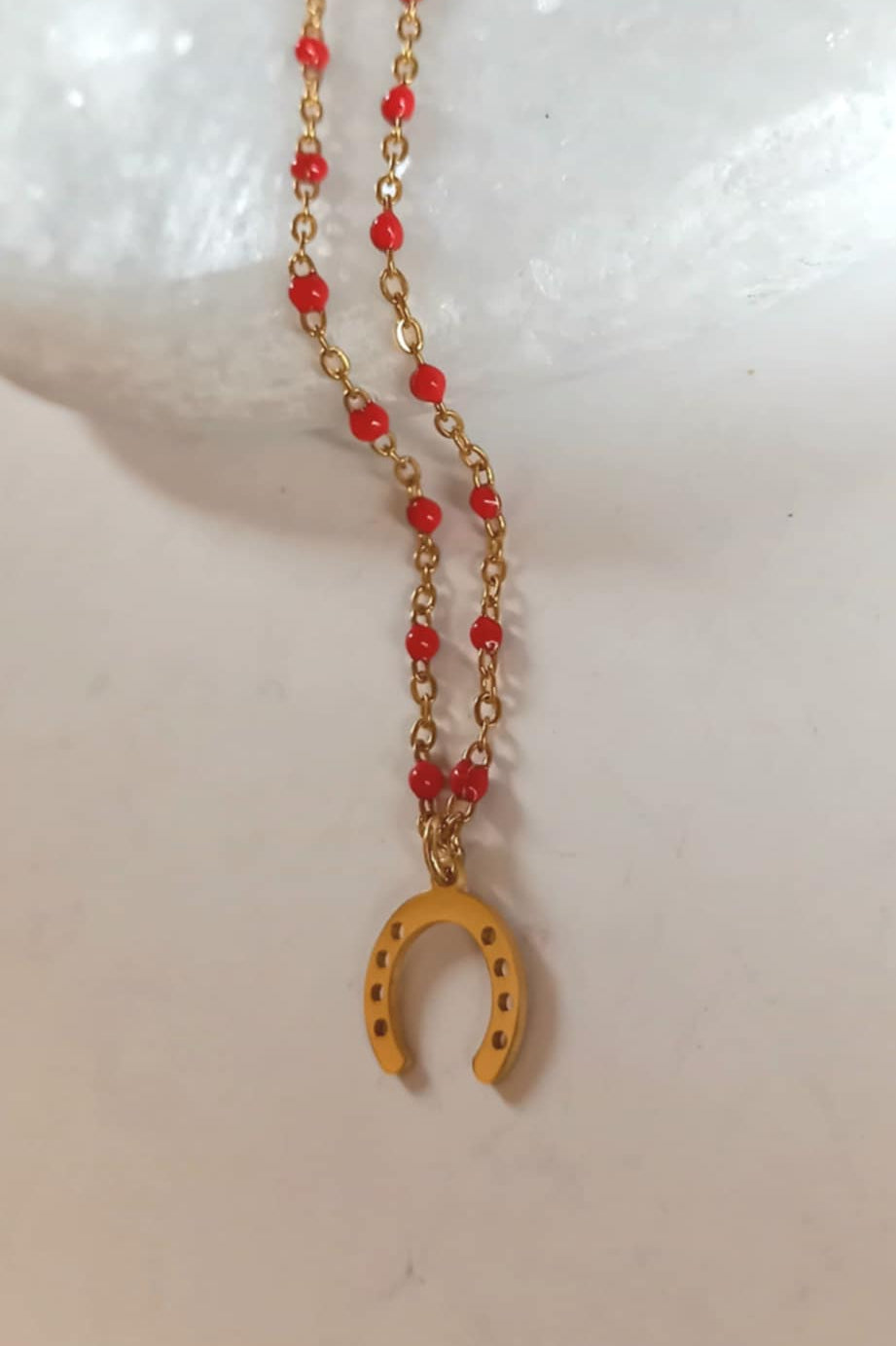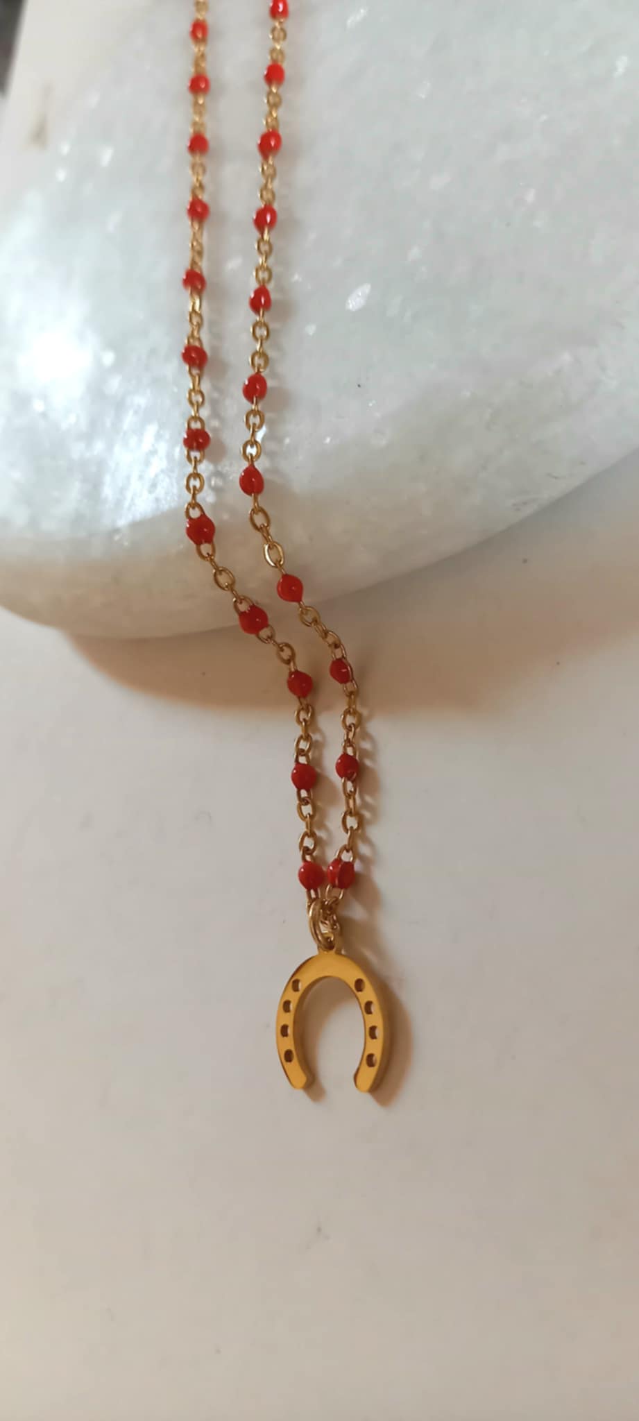 Κολιέ ατσάλινο ροζάριο με σμάλτο σε φωτεινό κόκκινο χρώμα με μοτίφ πέταλο από ατσάλι.