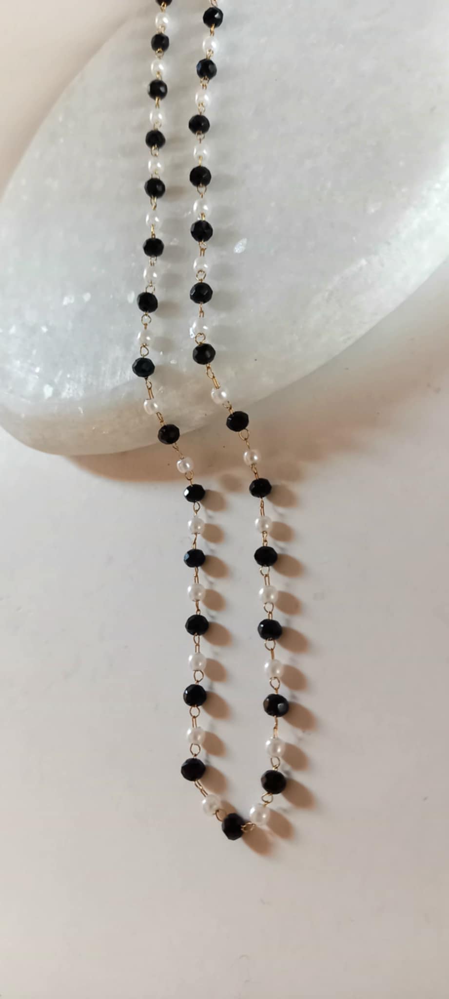Κομψό ροζάριο με μαύρα κρύσταλλα και πέρλες.