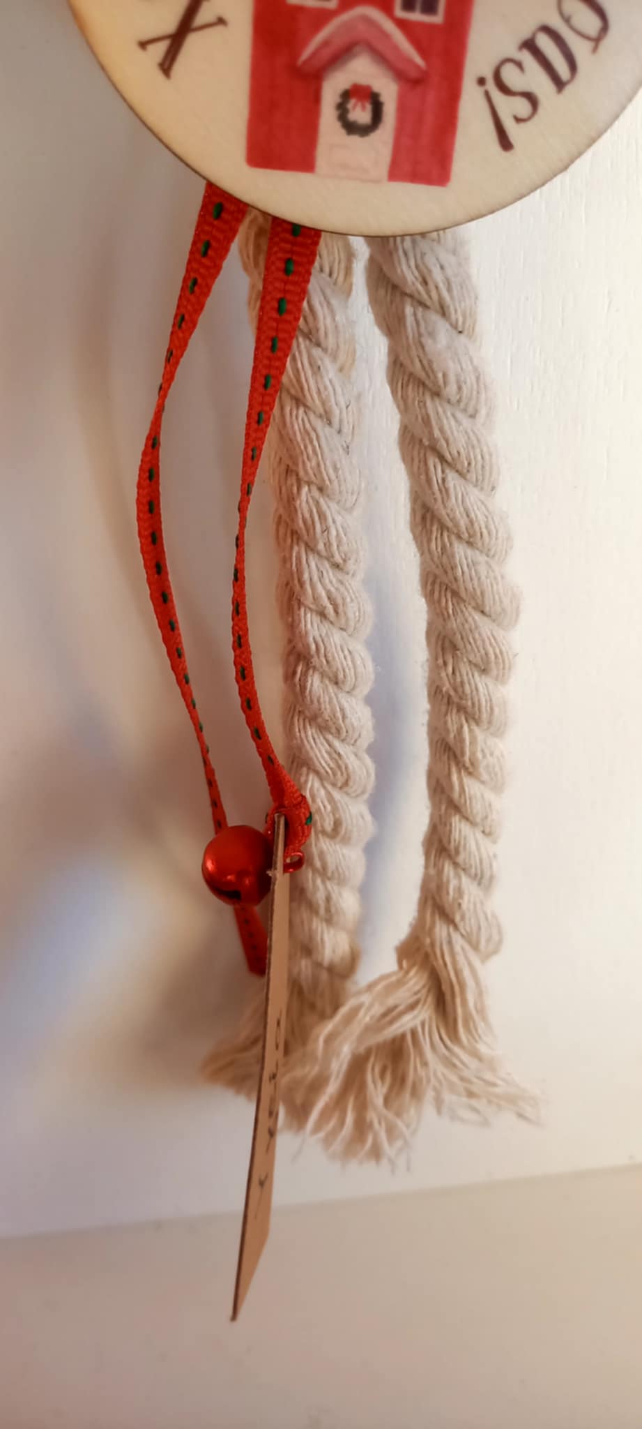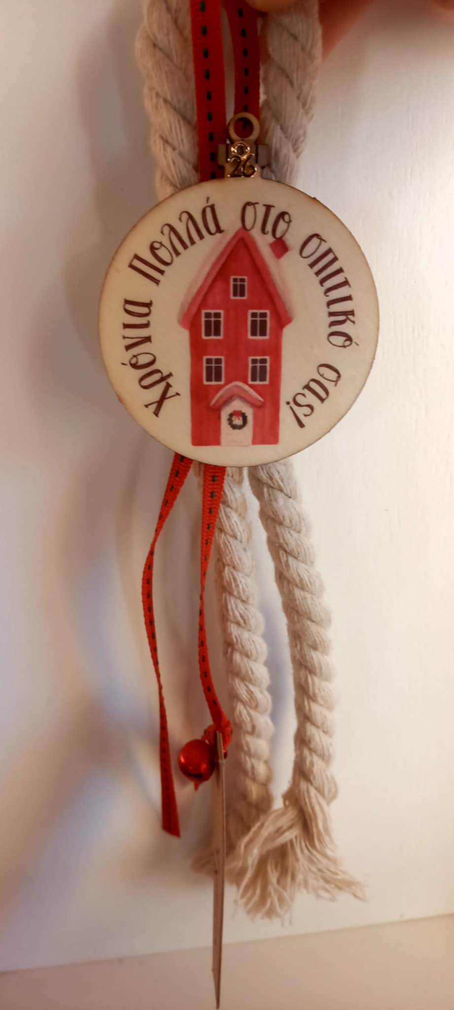 Κρεμαστό χειροποίητο γούρι με βαμβακερό σχοινί σε ιβουάρ χρώμα, ξύλινο στρογγυλό στοιχείο με σπιτάκι, ευχή "υγεία", μεταλλικό κουδουνάκι σε κόκκινο χρώμα και επιχρυσωμένο μοτίφ "26".