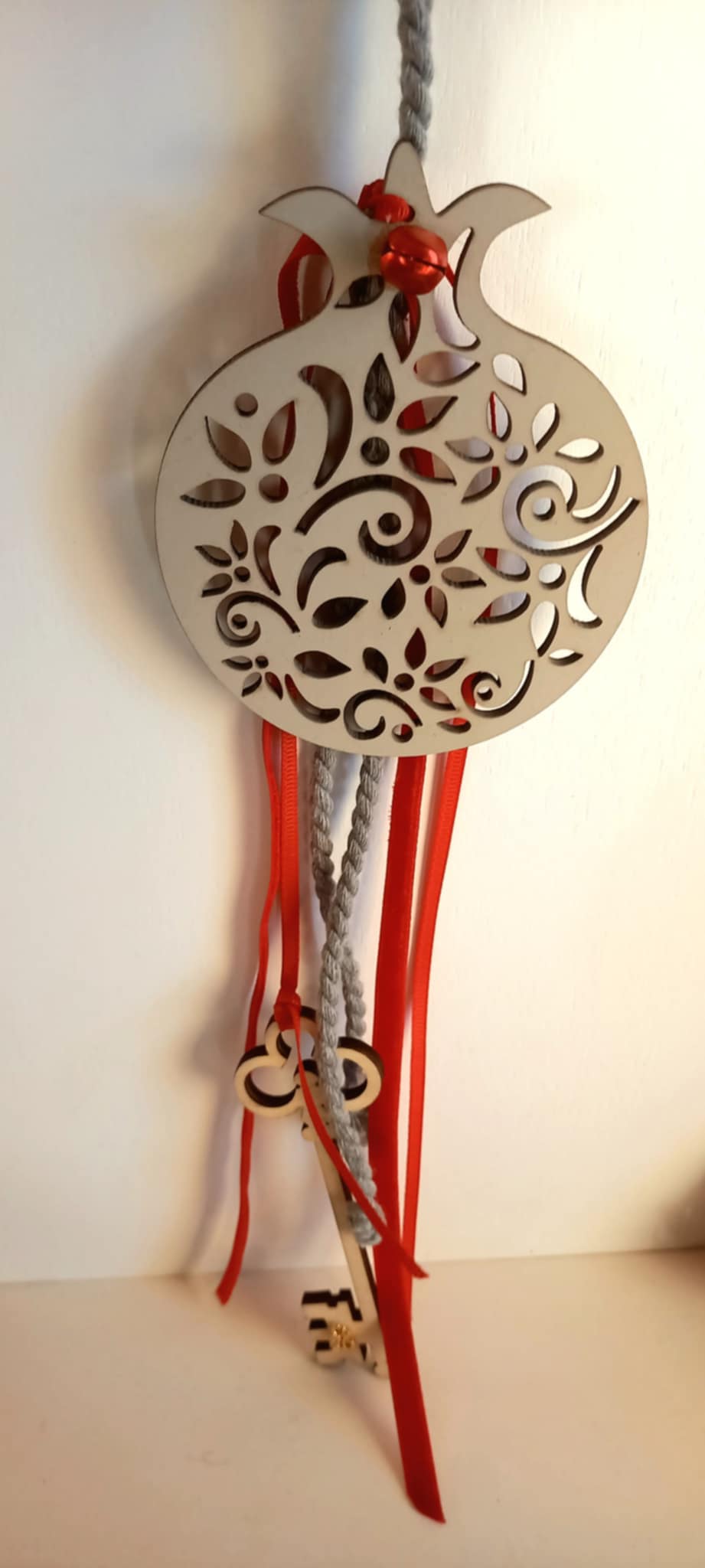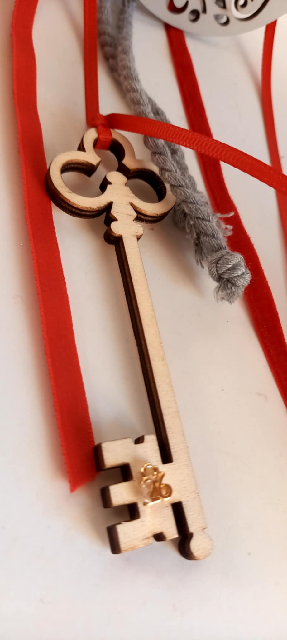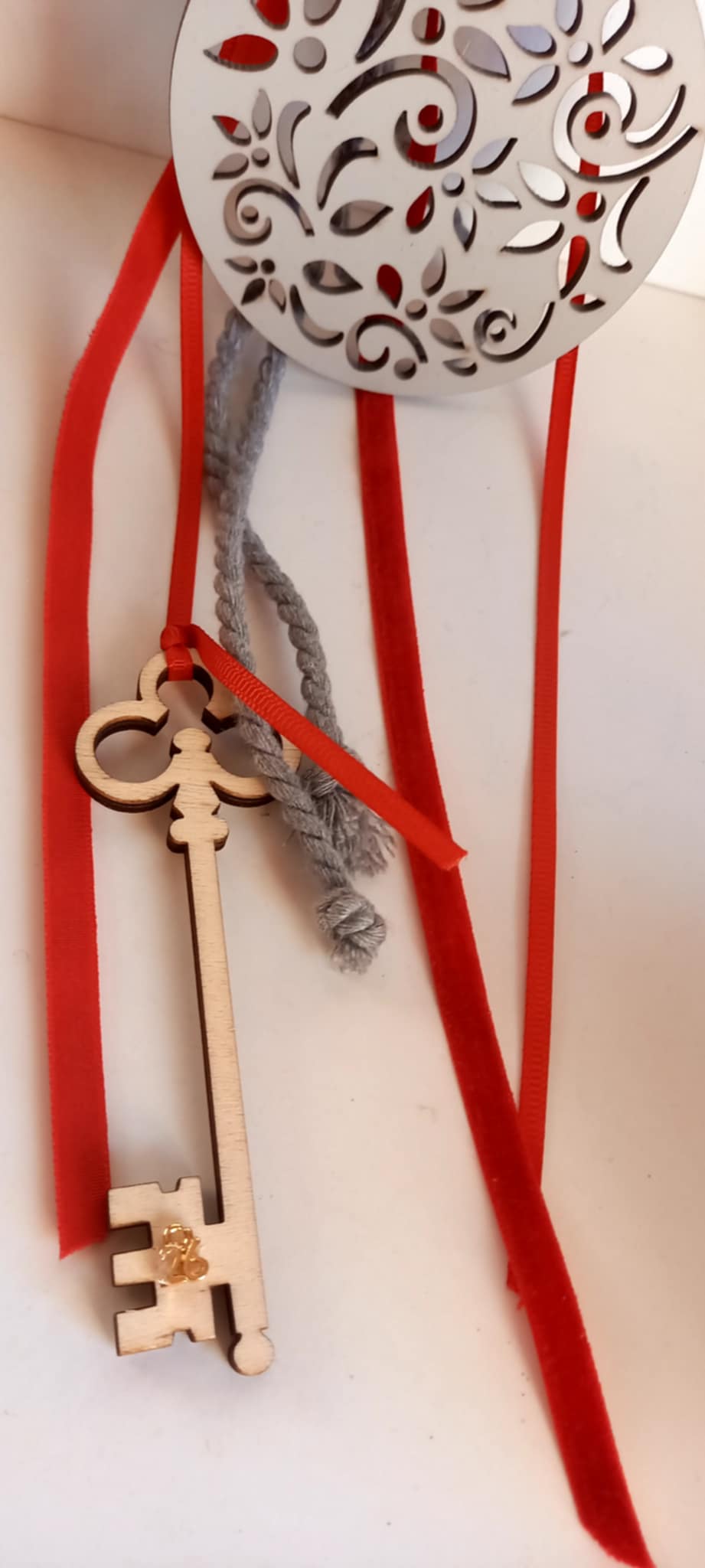 Κρεμαστό γούρι 20260 ξύλινο ρόδι στο χρώμα του πάγου με μεταλλικό κουδουνάκι, ξύλινο κλειδί και στοιχείο "26", με κορδέλες σε αποχρώσεις γκρι και κόκκινου.