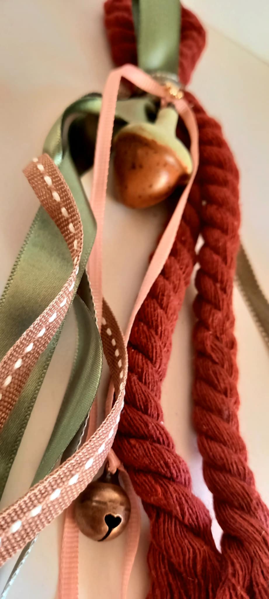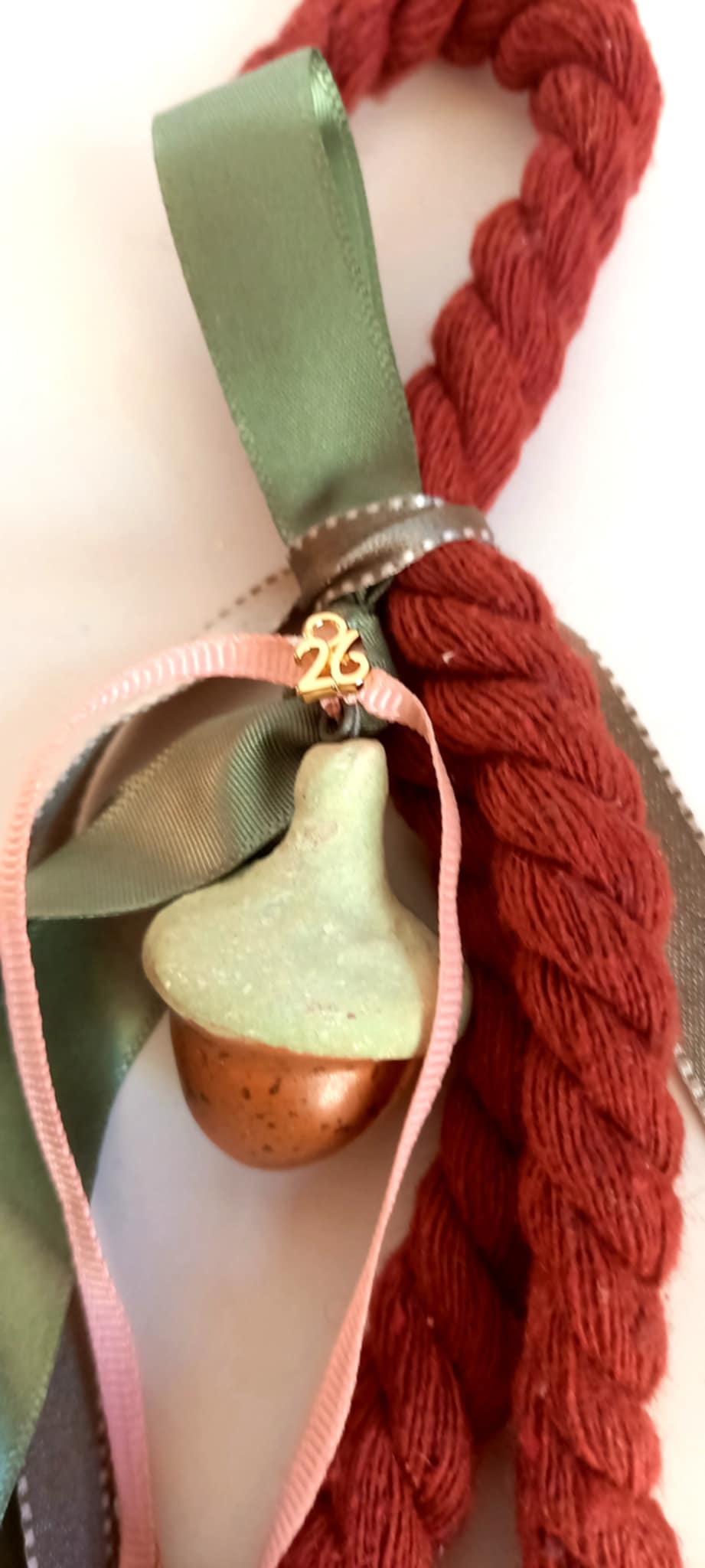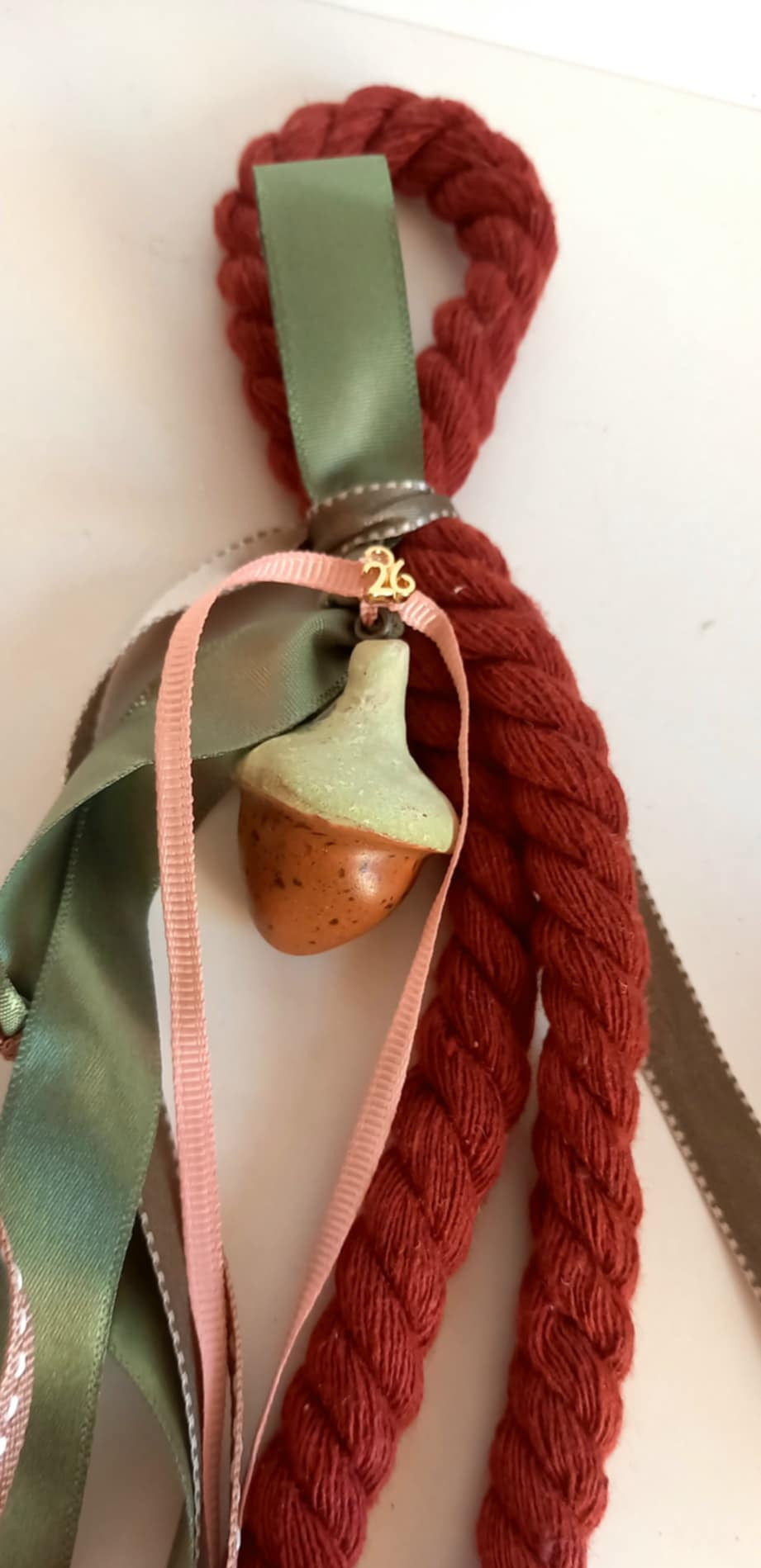 Κρεμαστό γούρι 2026 με βαμβακερό σχοινί σε μπορντώ χρώμα, κεραμικό βελανίδι, επιχρυσωμένο στοιχείο "26", μεταλλικό μπρονζέ κουδουνάκι και κορδέλες σε πράσινες αποχρώσεις.