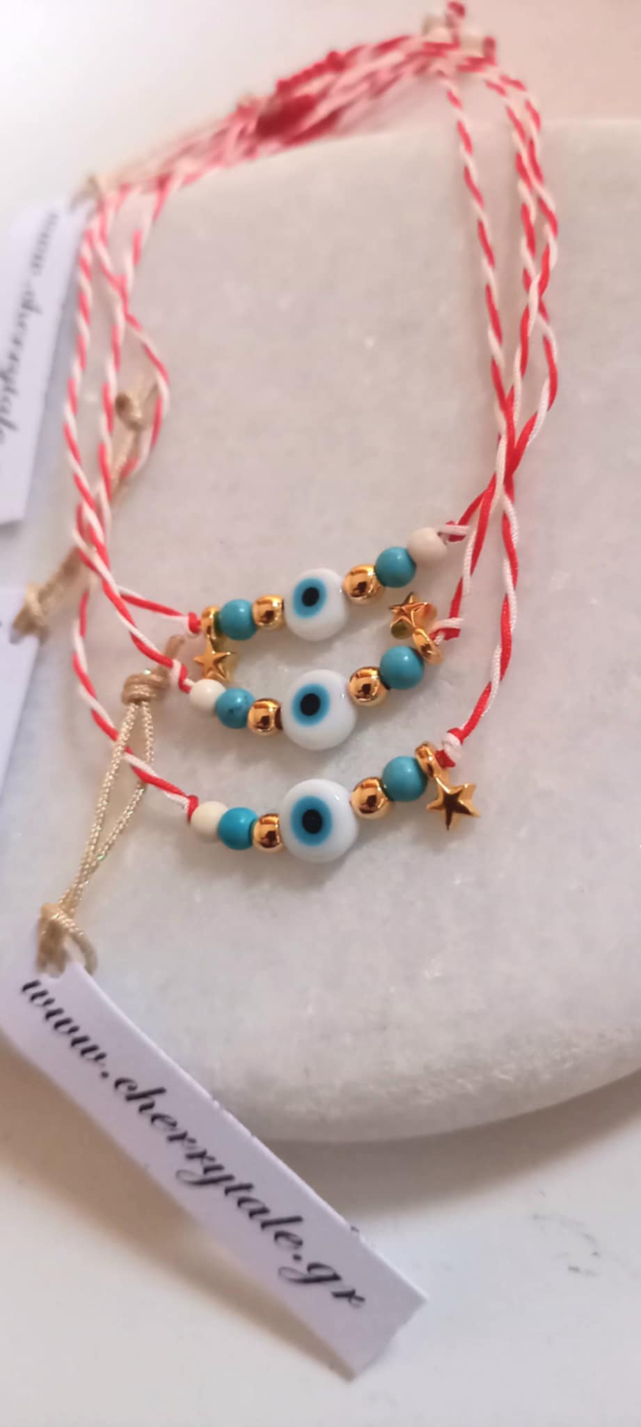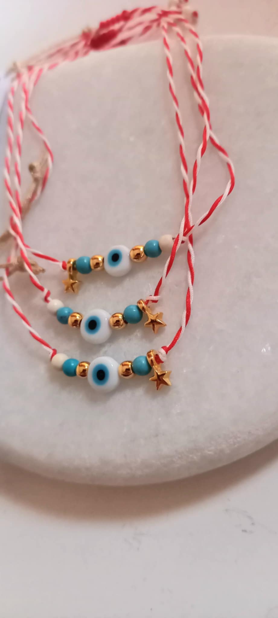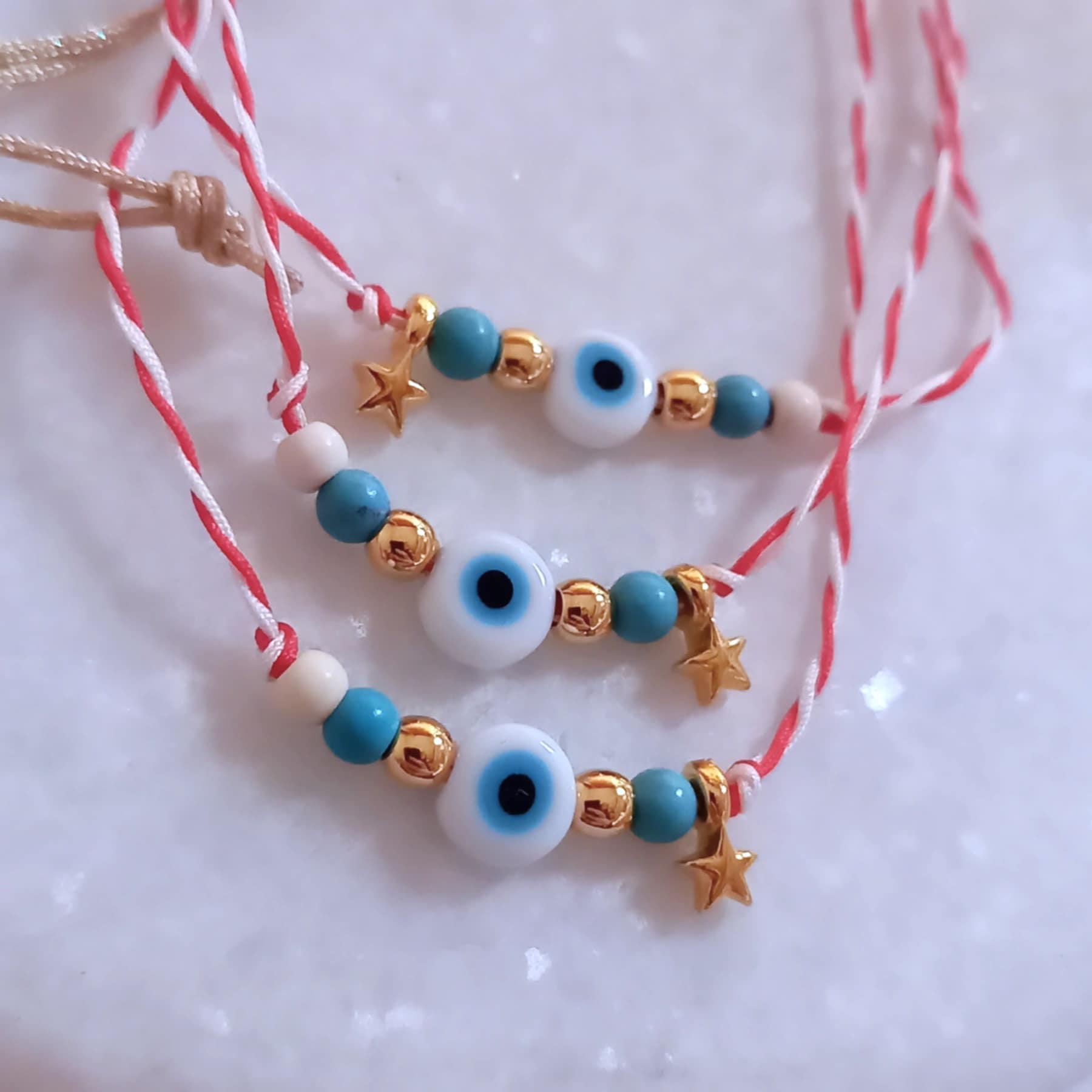 Χειροποίητο μαρτάκι με λευκό-κόκκινο κορδόνι, μάτι, επιχρυσωμένο αστεράκι, ημιπολύτιμες πέτρες χαολίτη σε λευκό και τυρκουάζ χρώμα και χρυσές λεπτομέρειες.