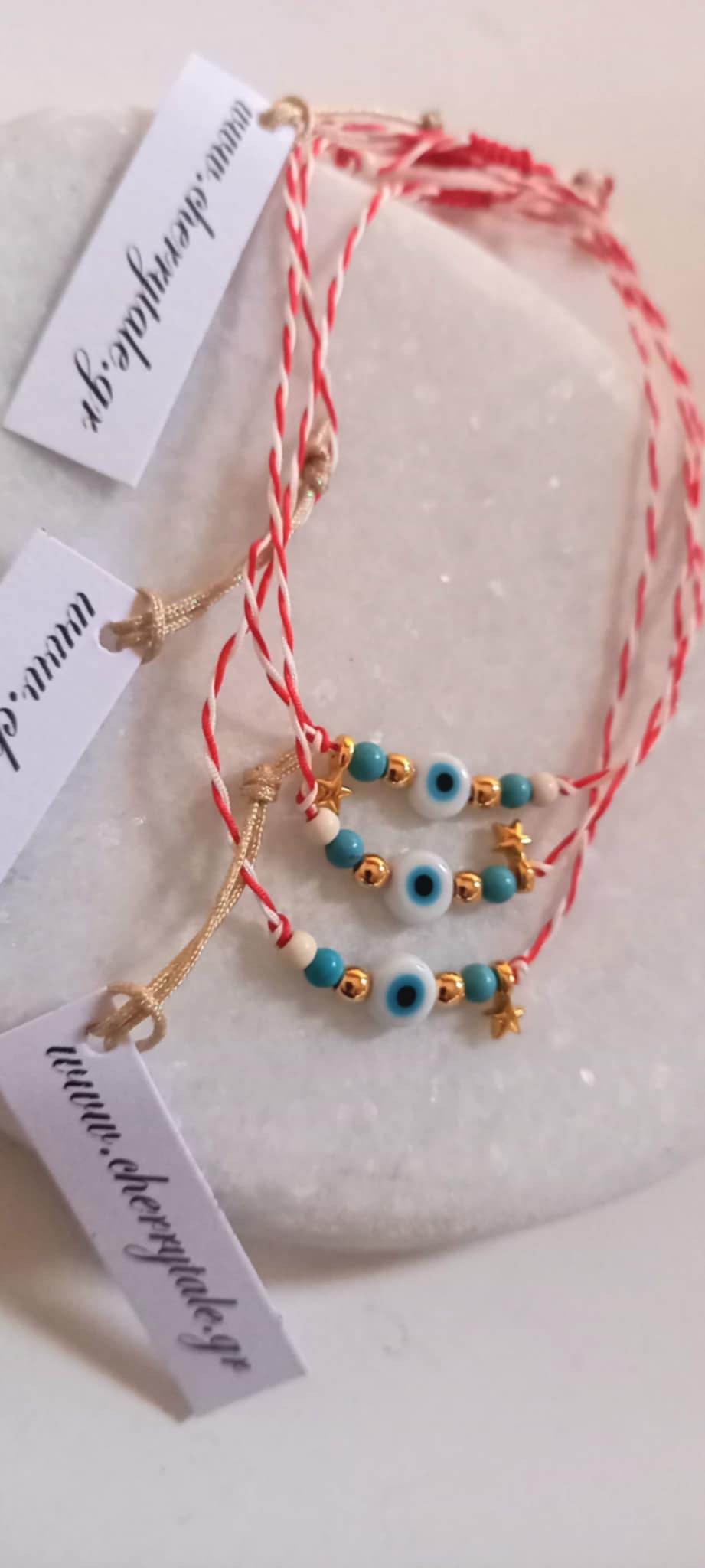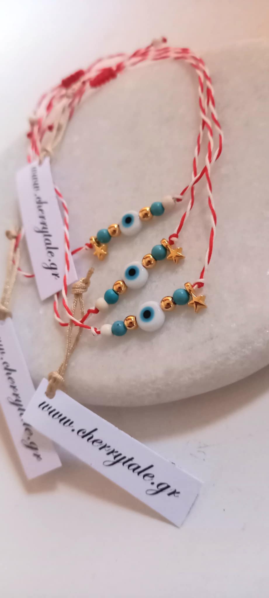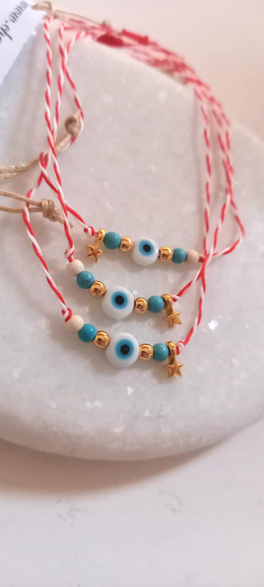 Χειροποίητο μαρτάκι με λευκό-κόκκινο κορδόνι, μάτι, επιχρυσωμένο αστεράκι, ημιπολύτιμες πέτρες χαολίτη σε λευκό και τυρκουάζ χρώμα και χρυσές λεπτομέρειες.