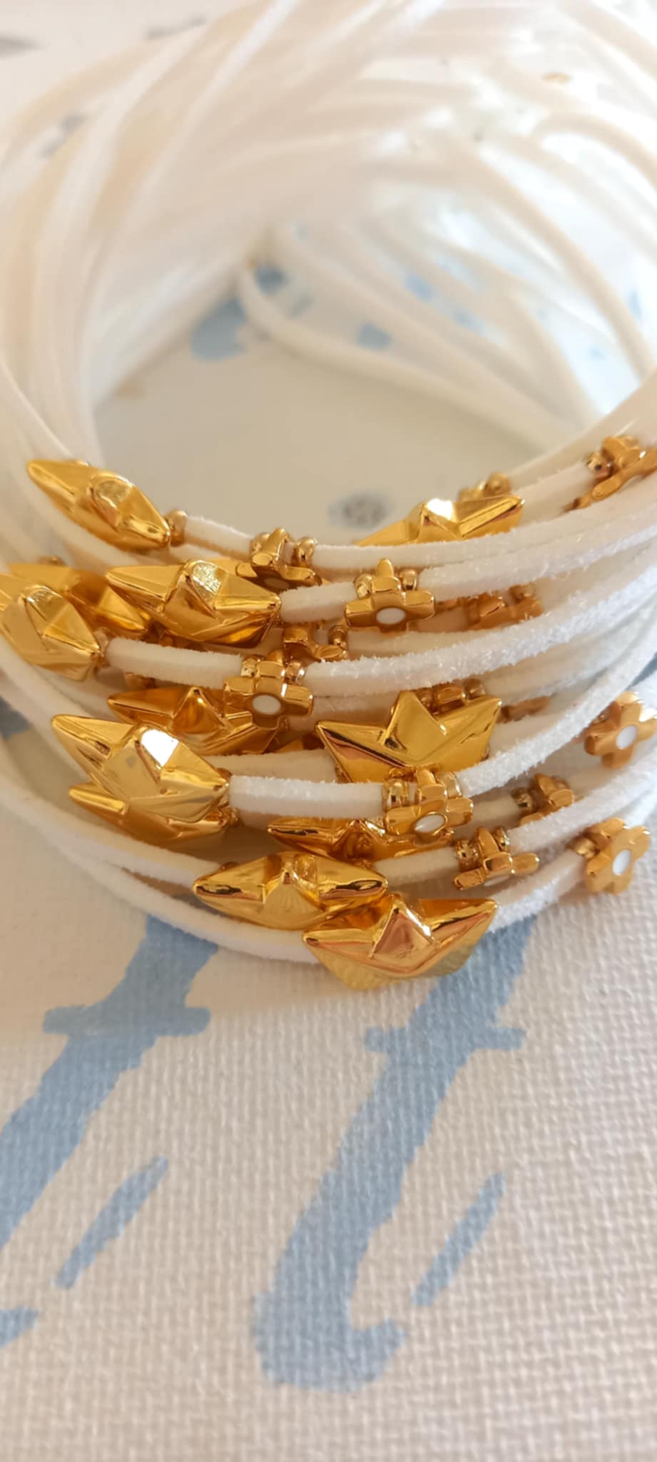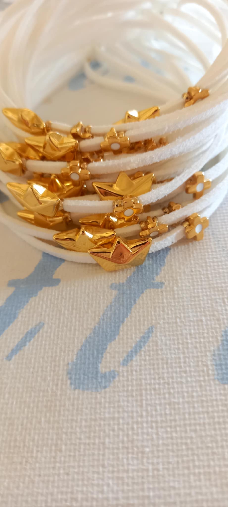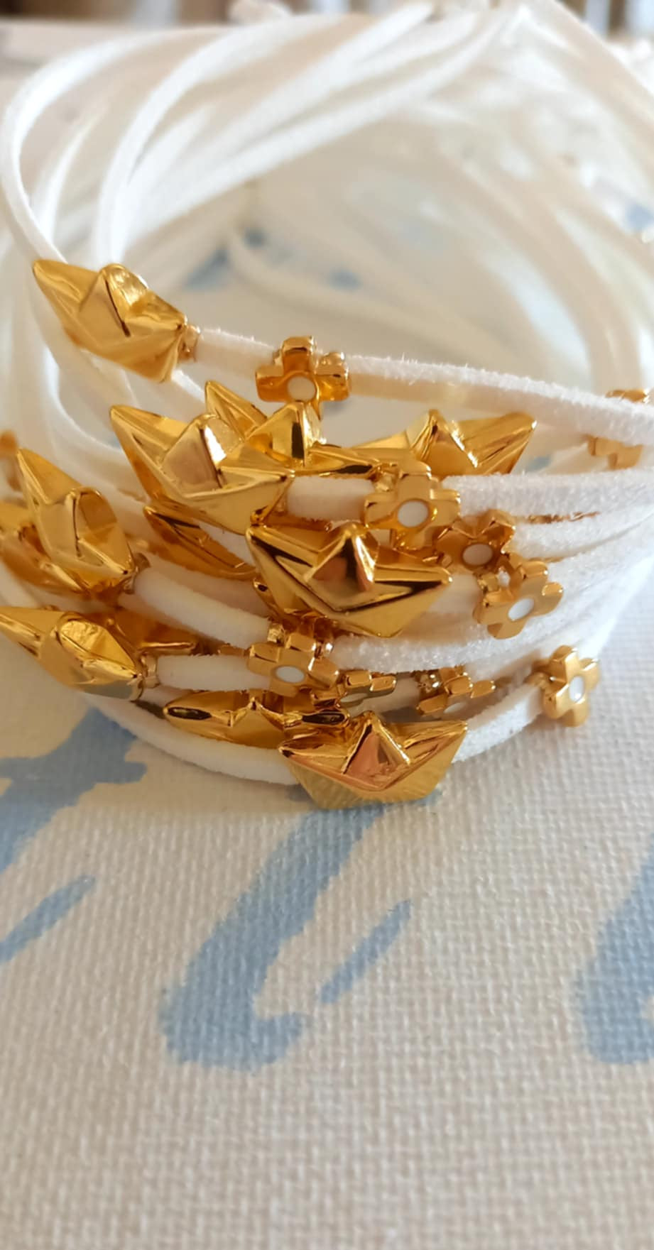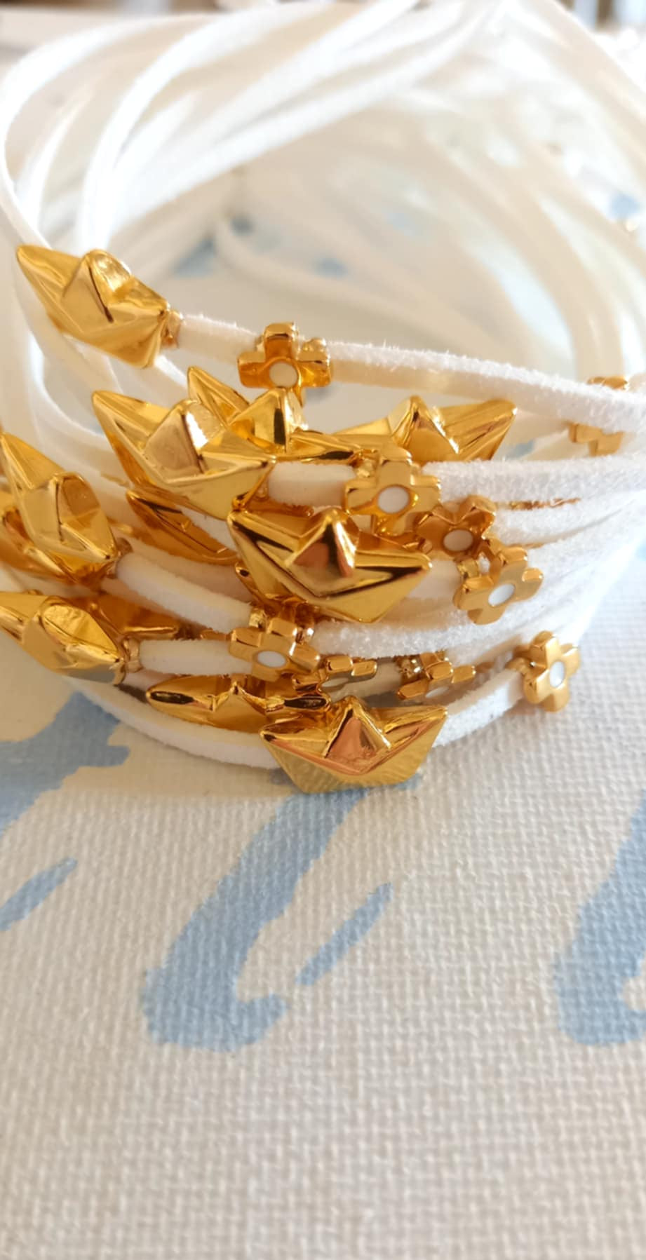 Μαρτυρικό βάπτισης βραχιόλι με καστόρι σε λευκό χρώμα με επιχρυσωμένο καραβάκι και σταυρουδάκι με σμάλτο.