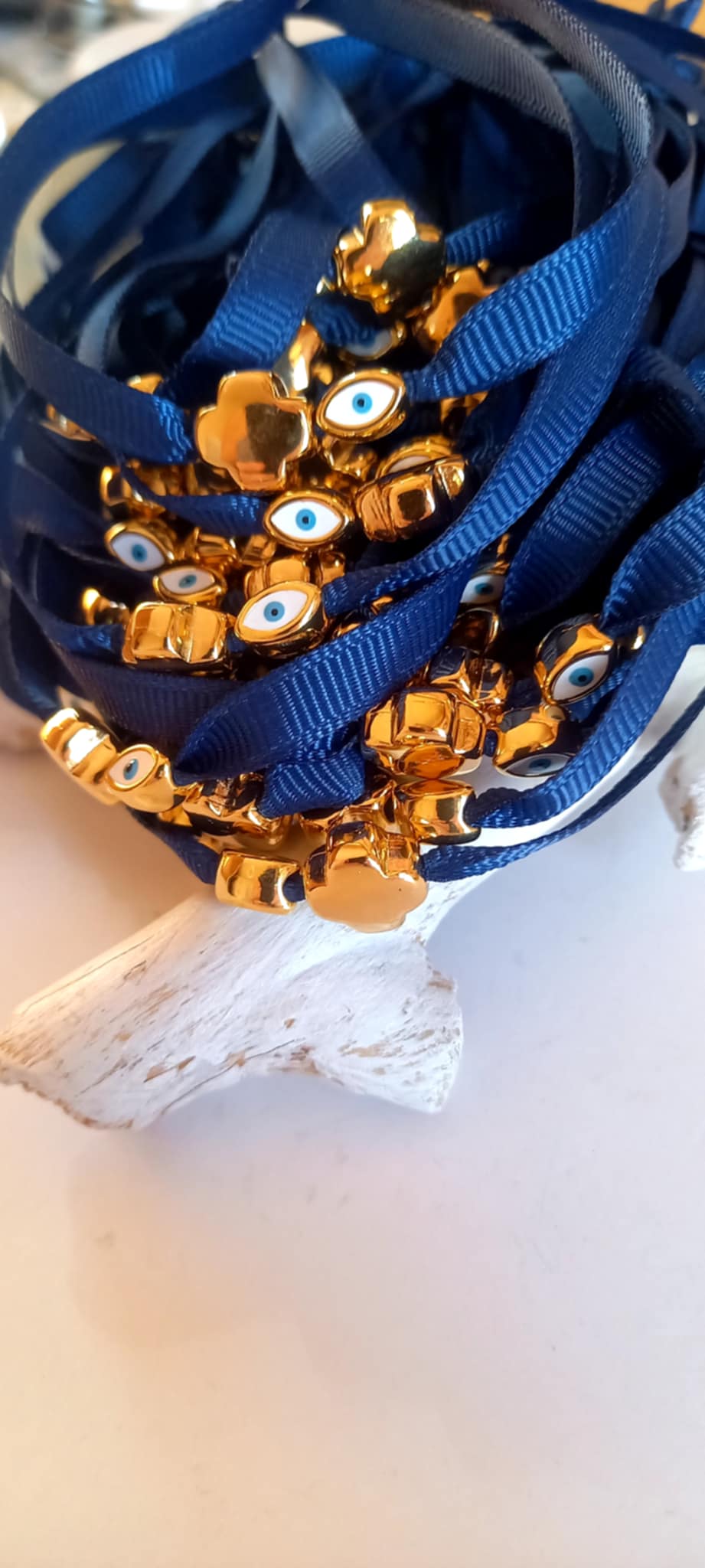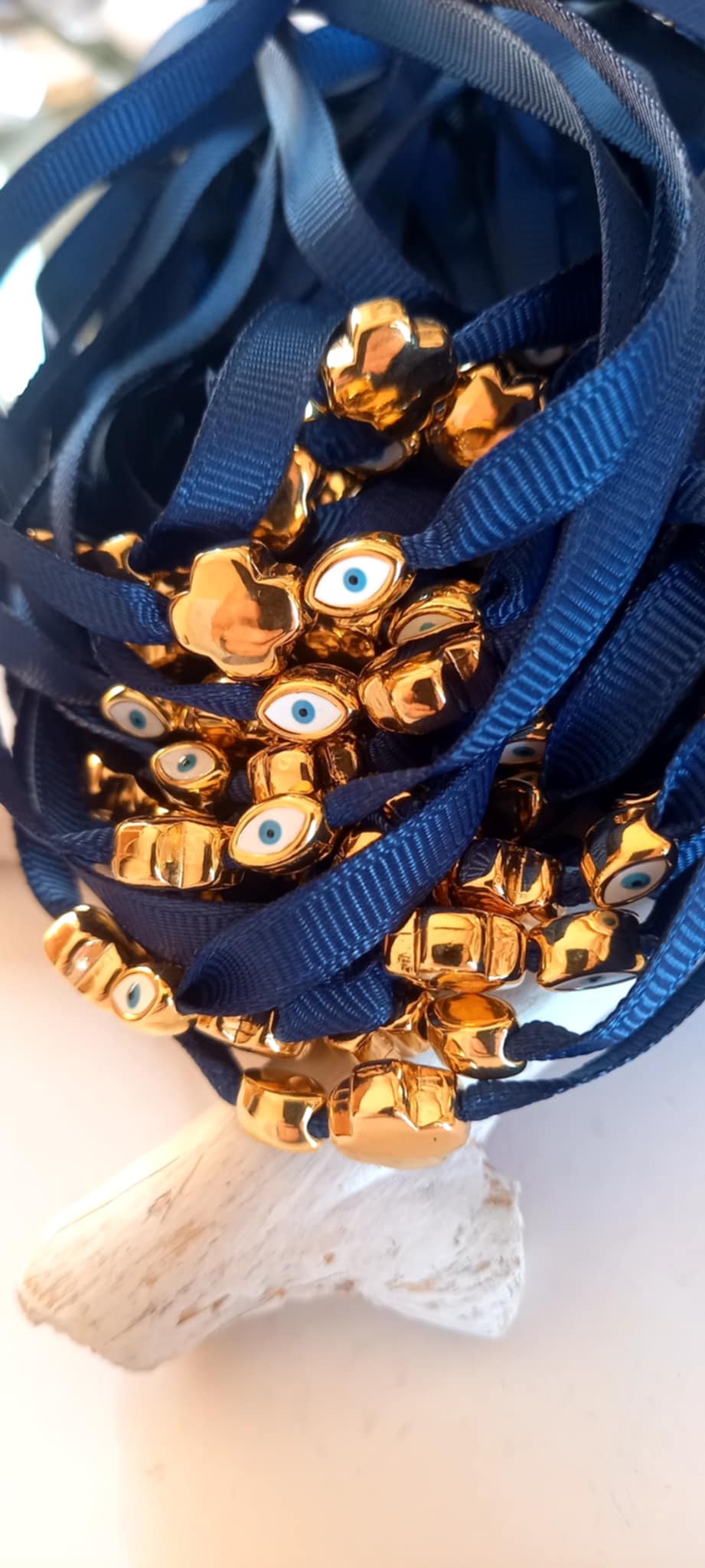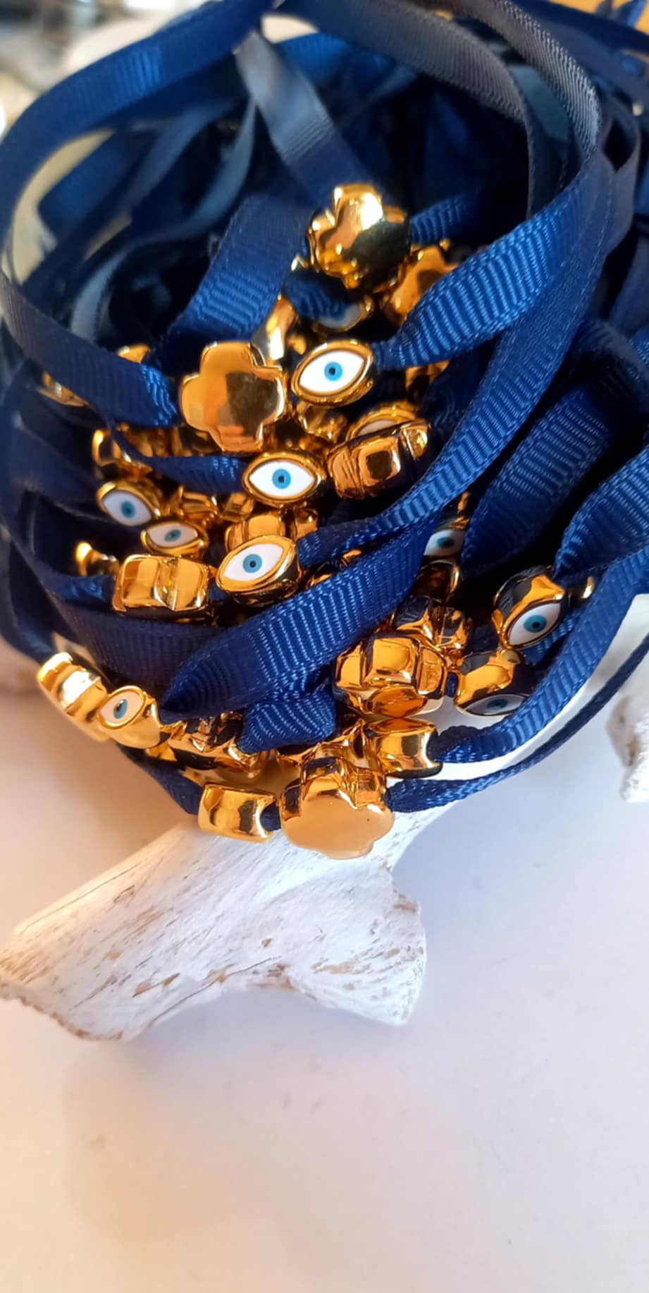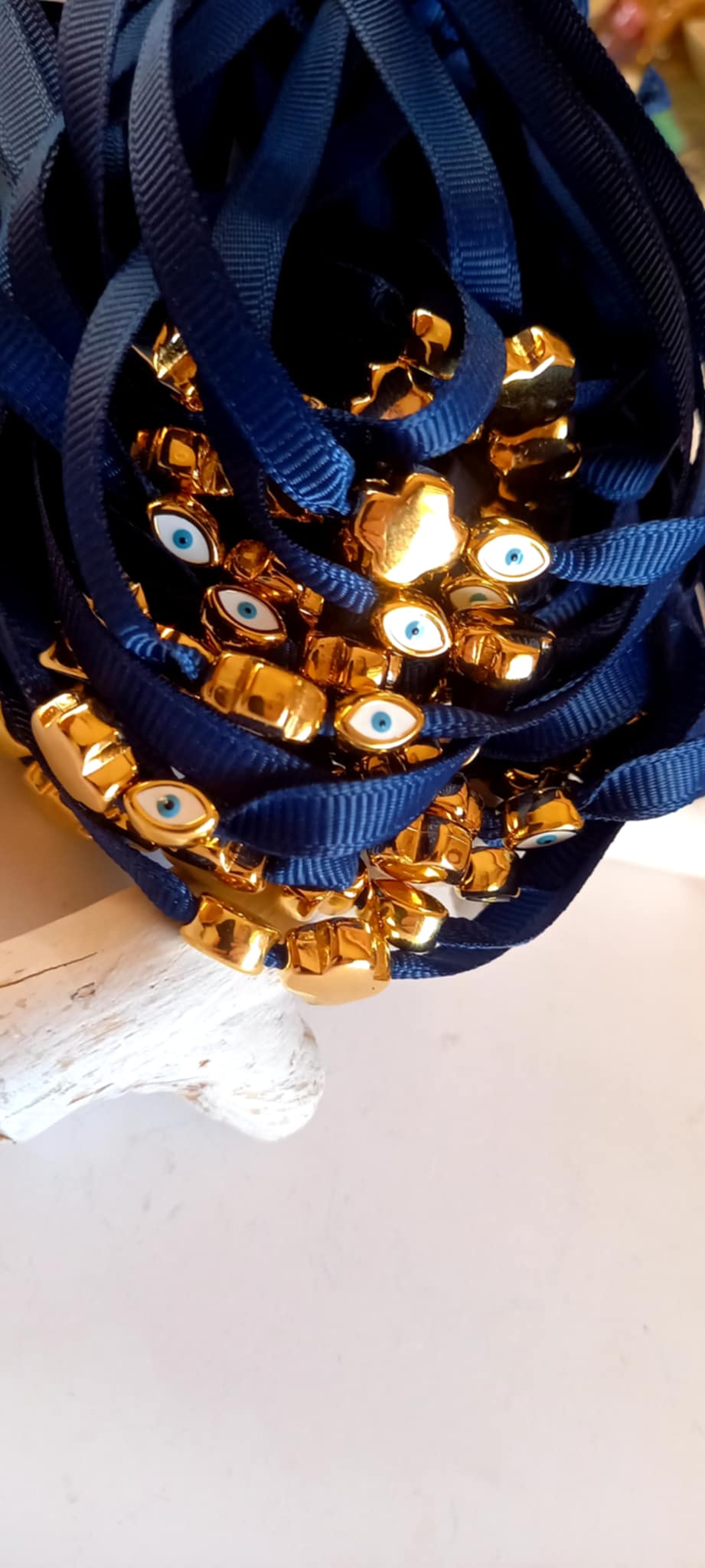 Μαρτυρικό βάπτισης βραχιόλι με γκρο κορδέλα σε απόχρωση navy blue, επιχρυσωμένο σταυρουδάκι και επιχρυσωμένο μάτι με σμάλτο.