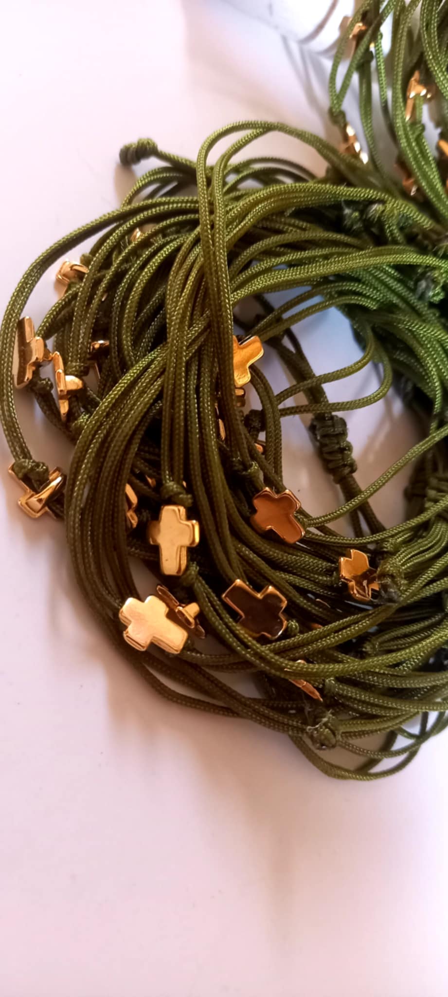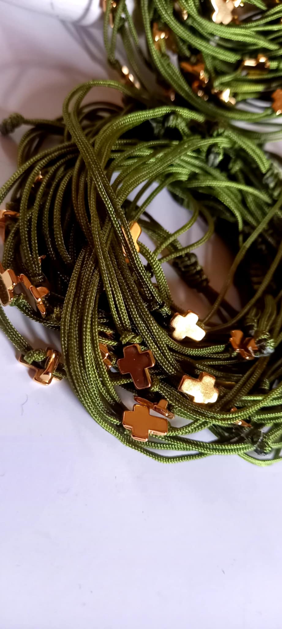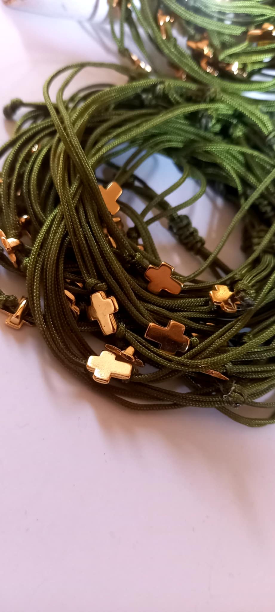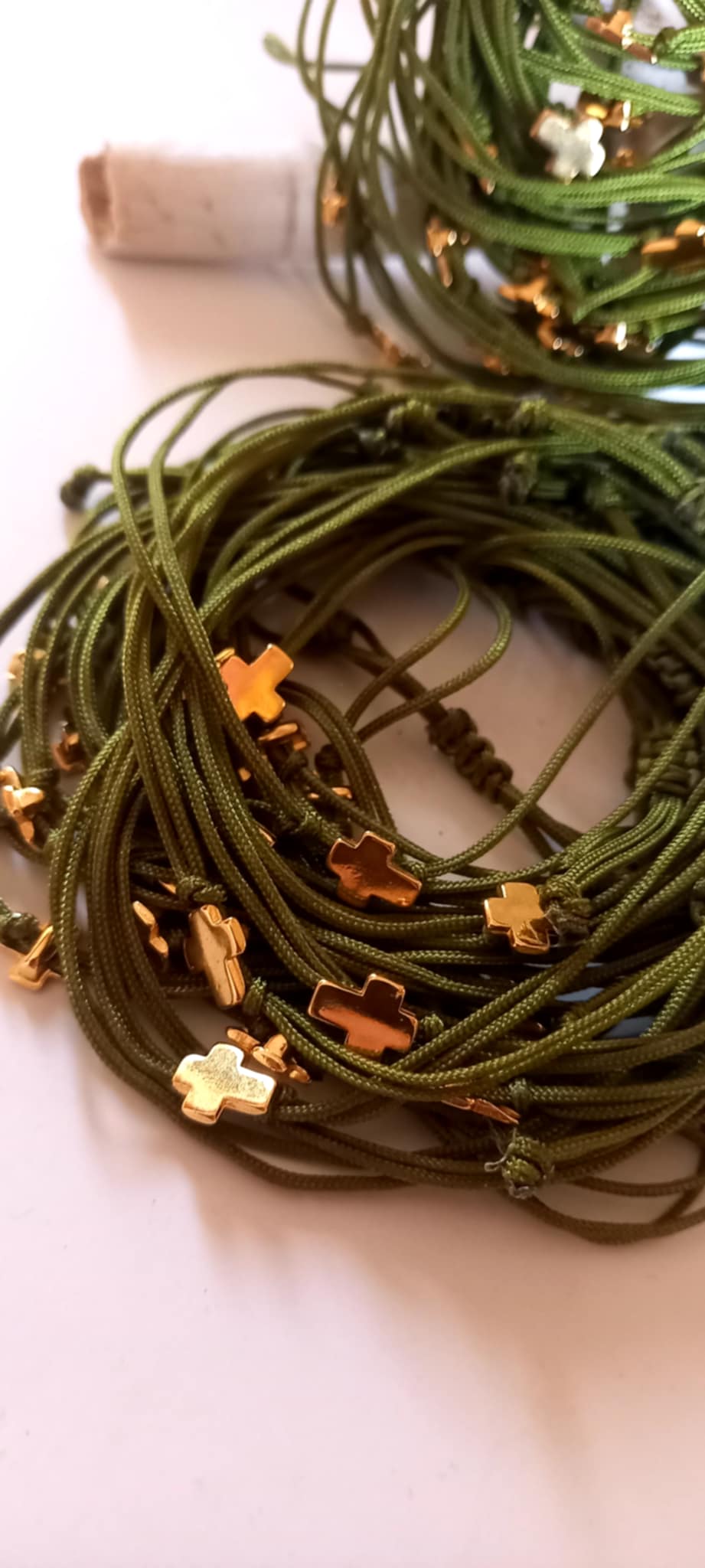 Μαρτυρικό βάπτισης βραχιόλι με χοντρό κορδόνι σε φωτεινό λαδί χρώμα και επιχρυσωμένο περαστό σταυρουδάκι.