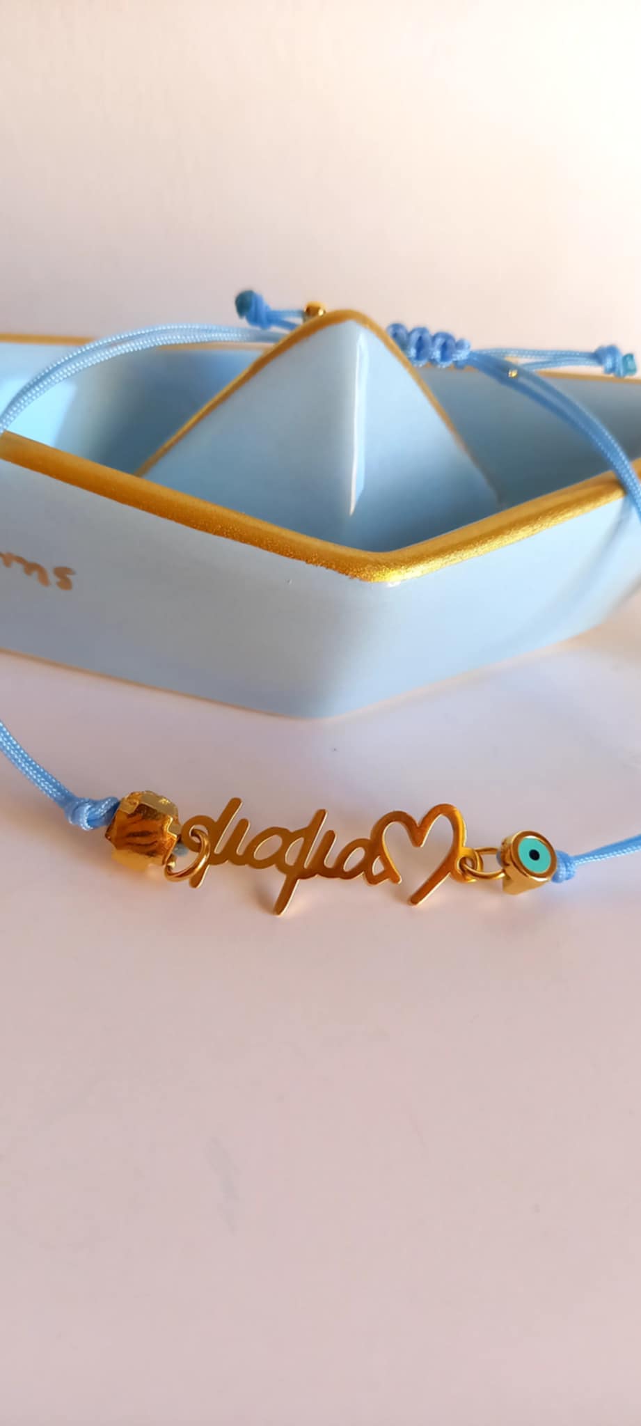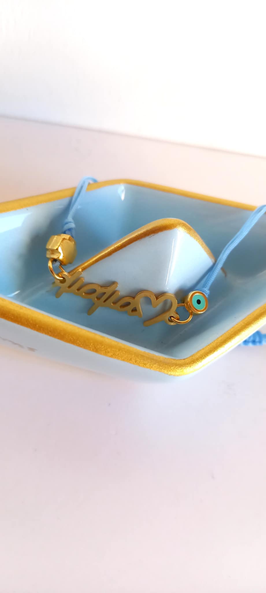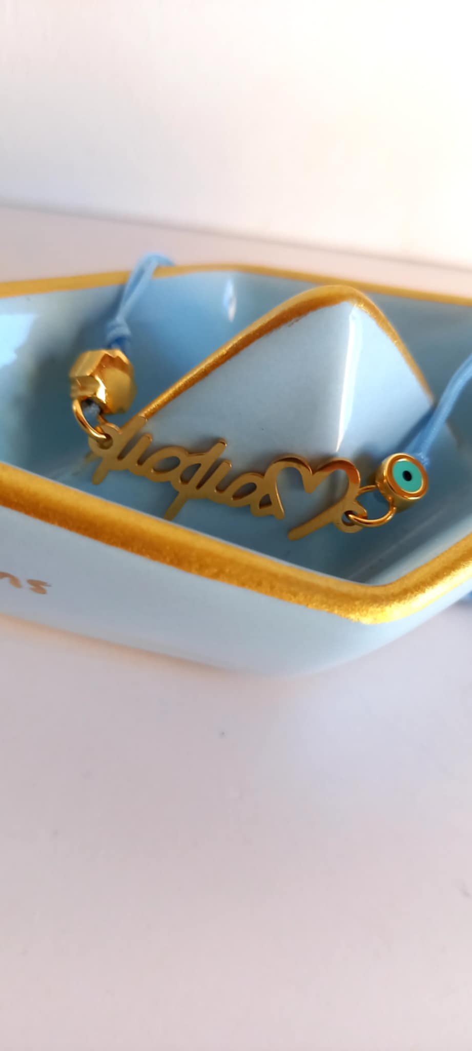 Μαρτυρικό βραχιόλι βάπτισης για τη μαμά με κορδόνι σε απόχρωση baby blue, ατσάλινο στοιχείο "μαμά", επιχρυσωμένο σταυρουδάκι και ματάκι με σμάλτο.