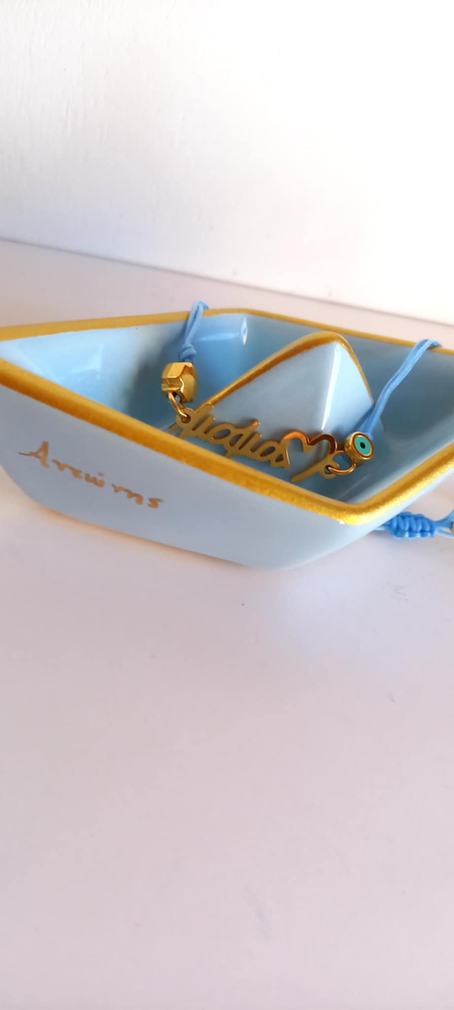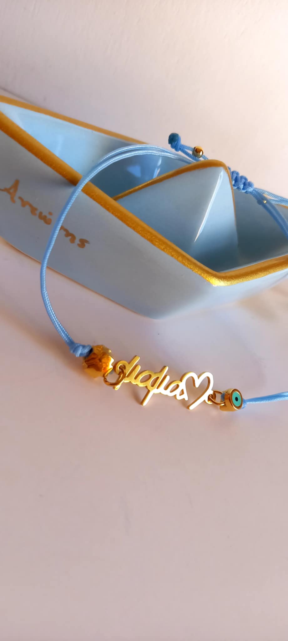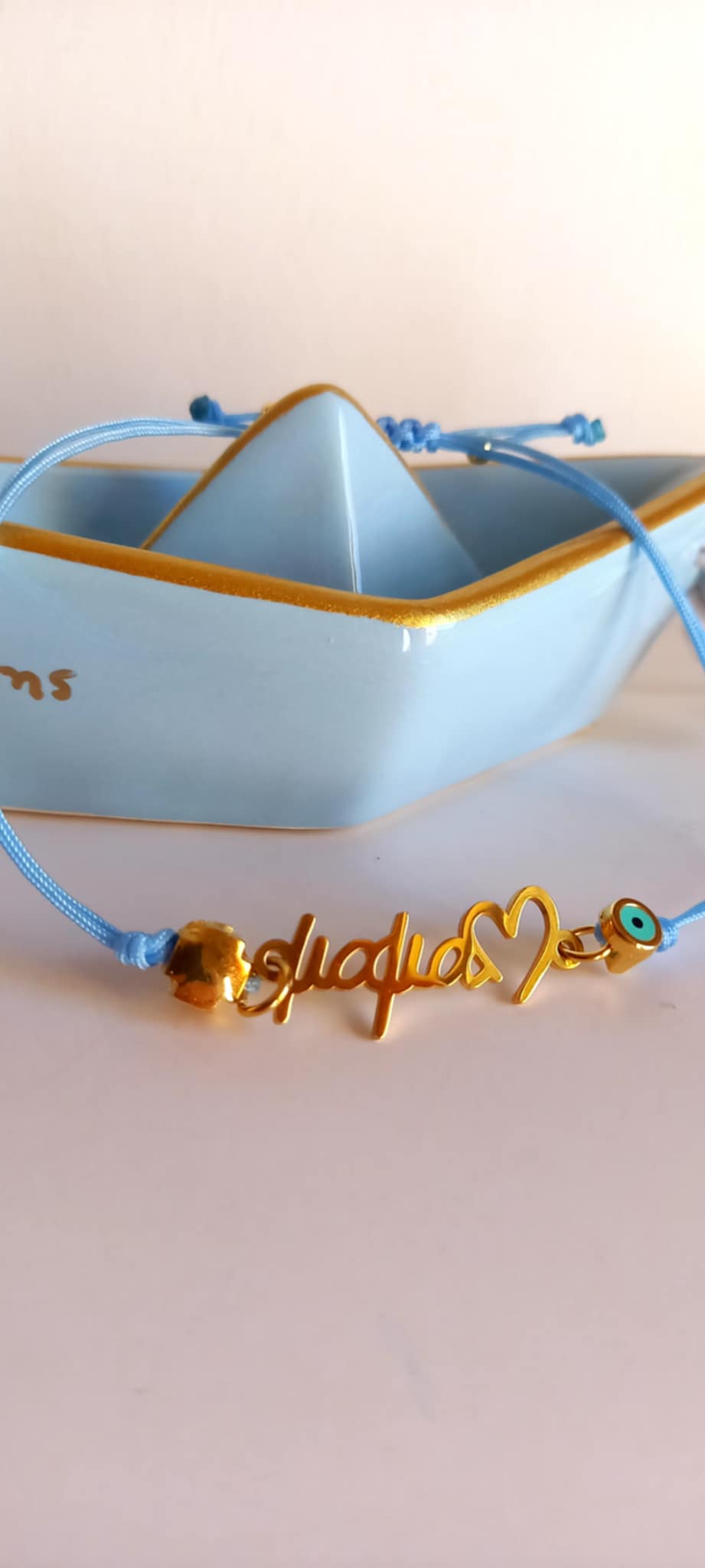 Μαρτυρικό βραχιόλι βάπτισης για τη μαμά με κορδόνι σε απόχρωση baby blue, ατσάλινο στοιχείο "μαμά", επιχρυσωμένο σταυρουδάκι και ματάκι με σμάλτο.