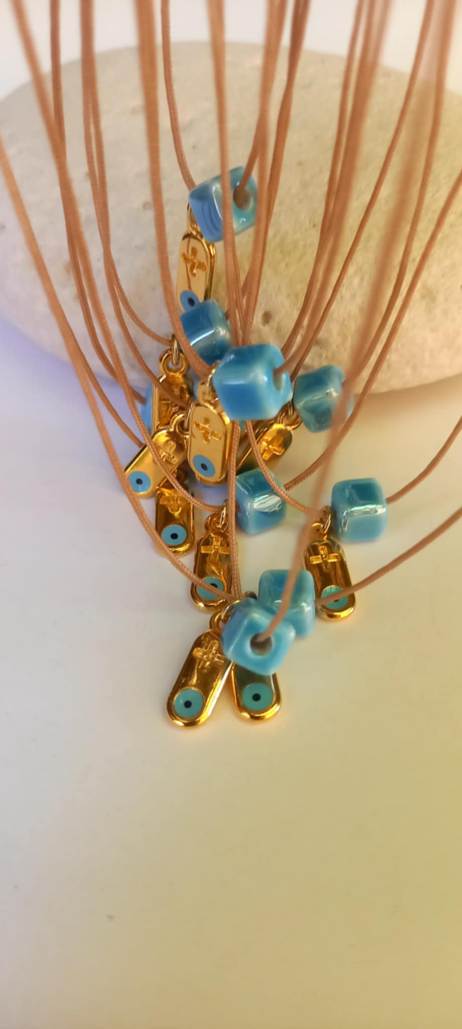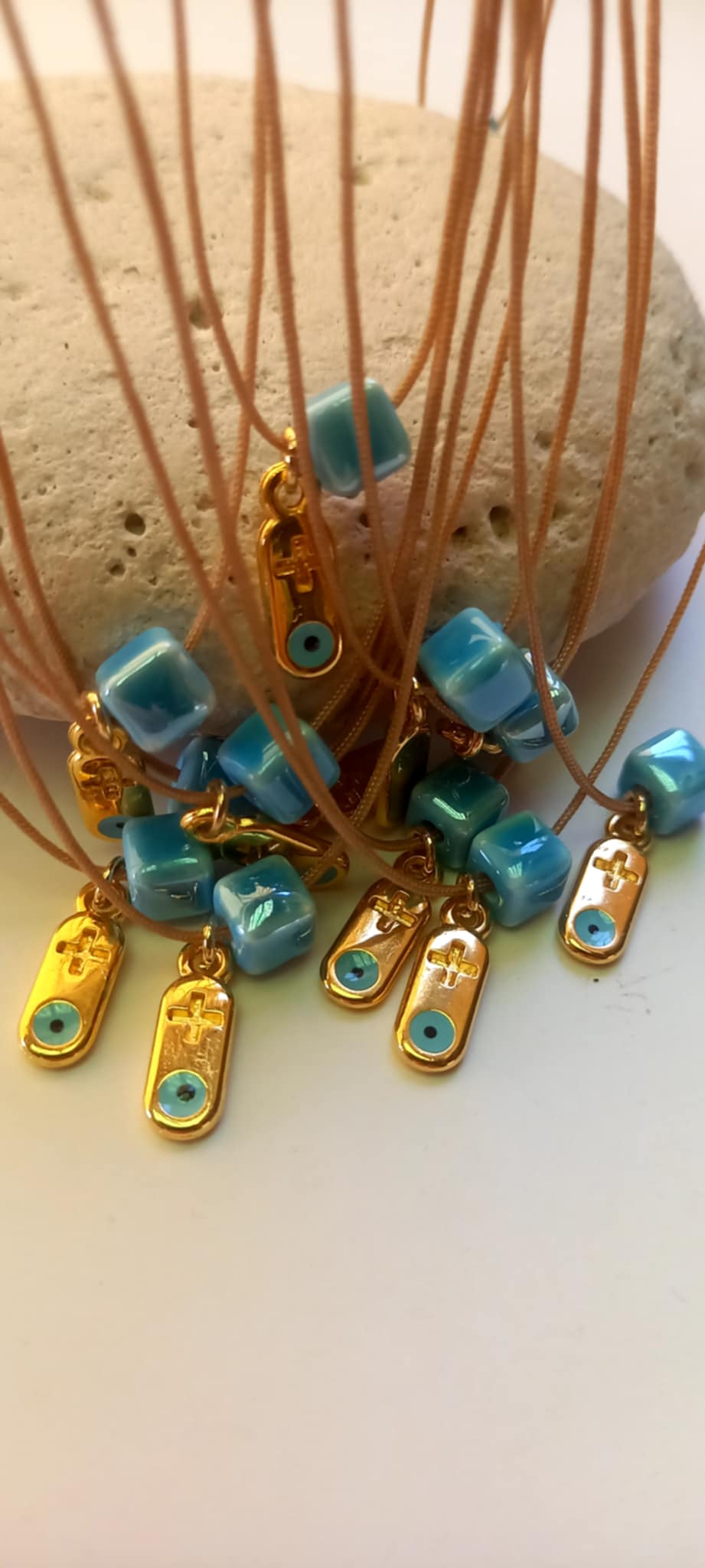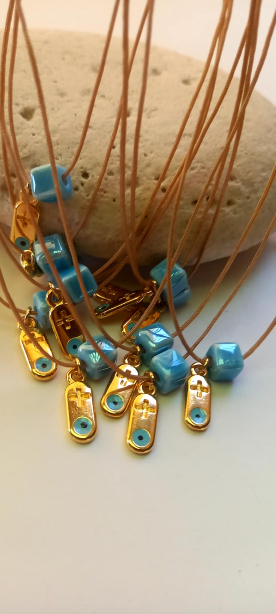 Χειροποίητο μαρτυρικό βάπτισης για το λαιμό με κορδόνι σε λευκό χρώμα, κεραμικό κύβο σε τυρκουάζ απόχρωση και επιχρυσωμένο κομψό σταυρουδάκι με μάτι.