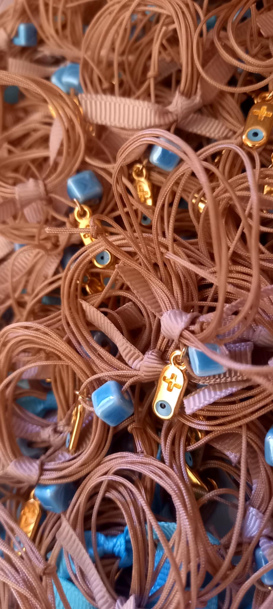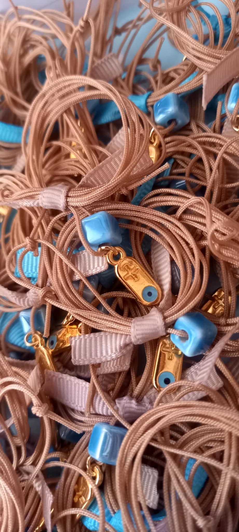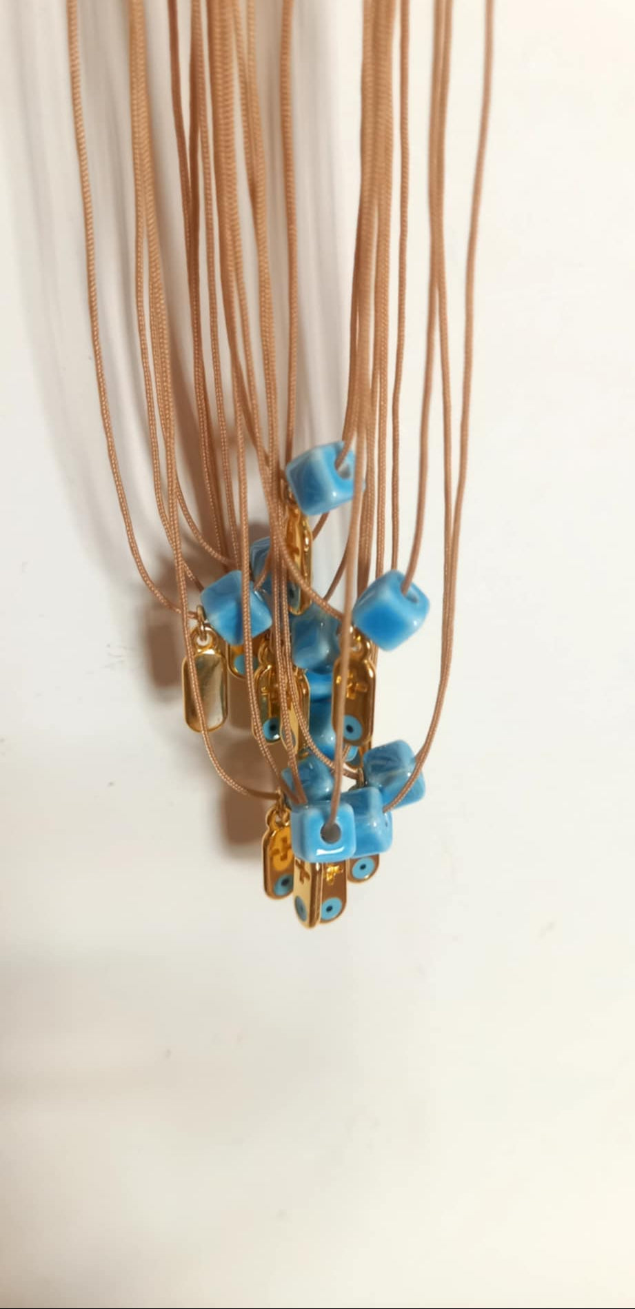 Χειροποίητο μαρτυρικό βάπτισης για το λαιμό με κορδόνι σε λευκό χρώμα, κεραμικό κύβο σε τυρκουάζ απόχρωση και επιχρυσωμένο κομψό σταυρουδάκι με μάτι.