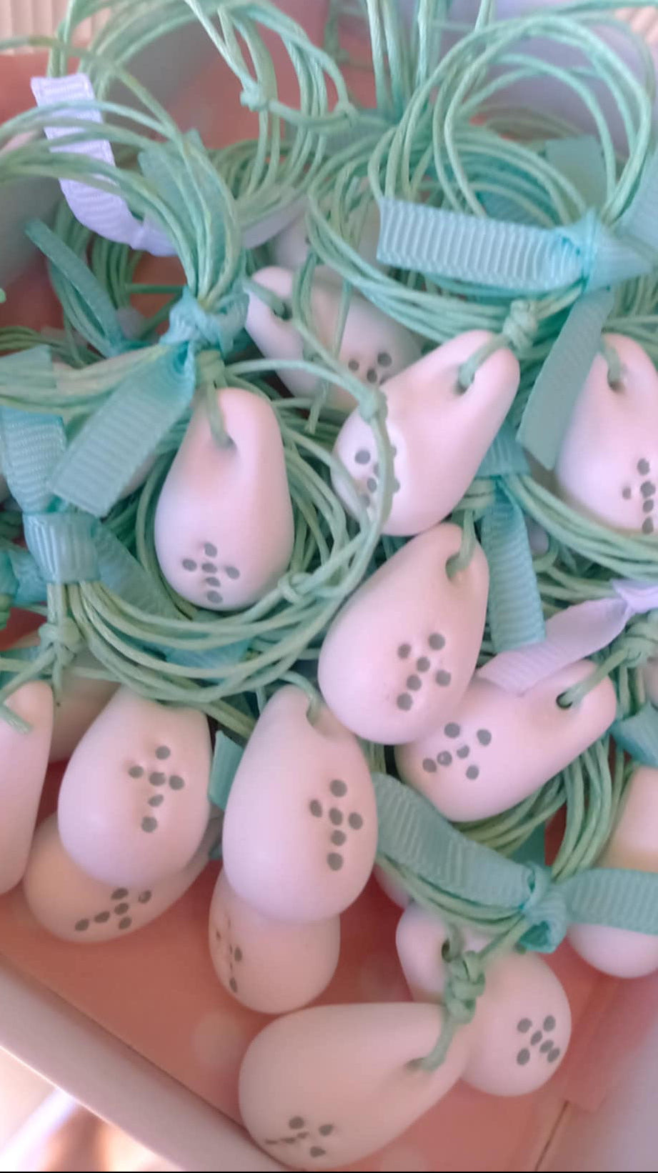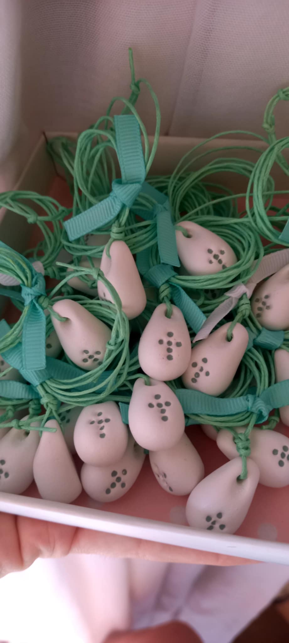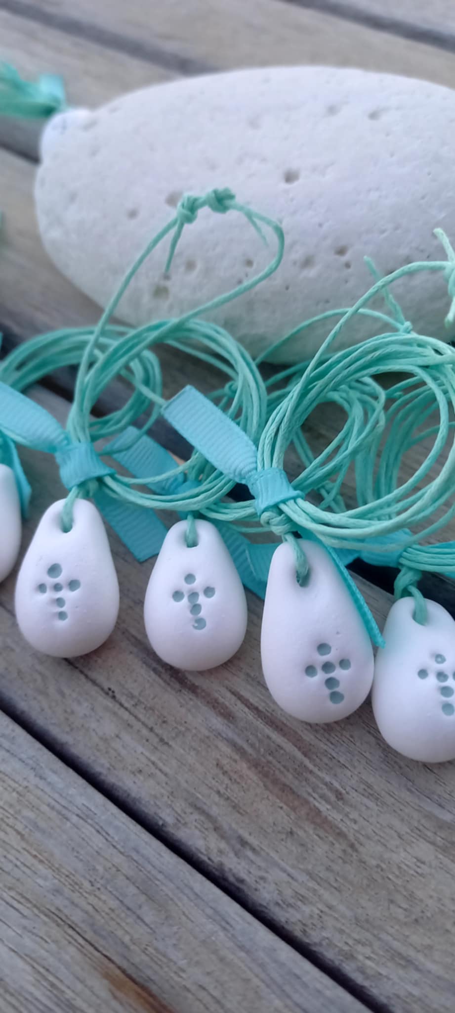 Μαρτυρικό βάπτισης για το λαιμό με κορδόνι σε χρώμα μέντας και λευκό στοιχείο με σταυρό στην ίδια απόχρωση με υφή πορσελάνης.