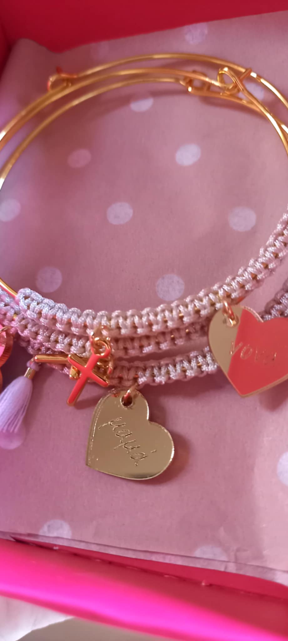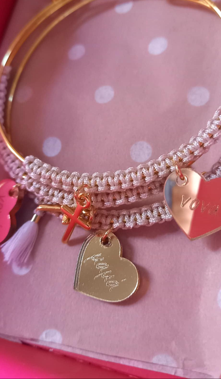 Μαρτυρικό βραχιόλι βάπτισης βέργα για μαμά και νονά με μακραμέ σε μπεζ χρώμα, επιχρυσωμένο σταυρουδάκι, plexi καρδιά και λευκή φουντίτσα.