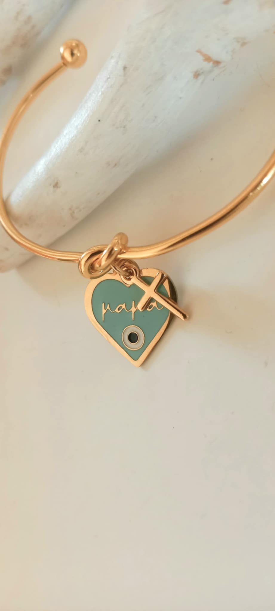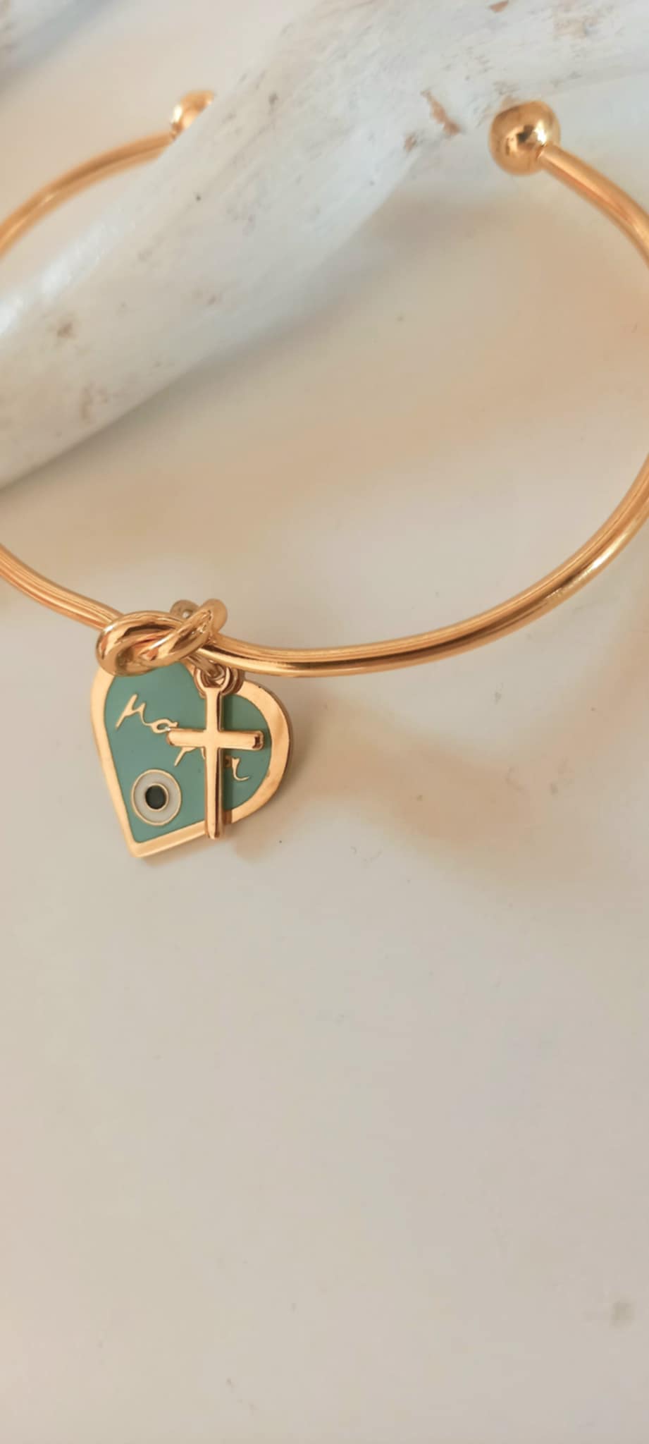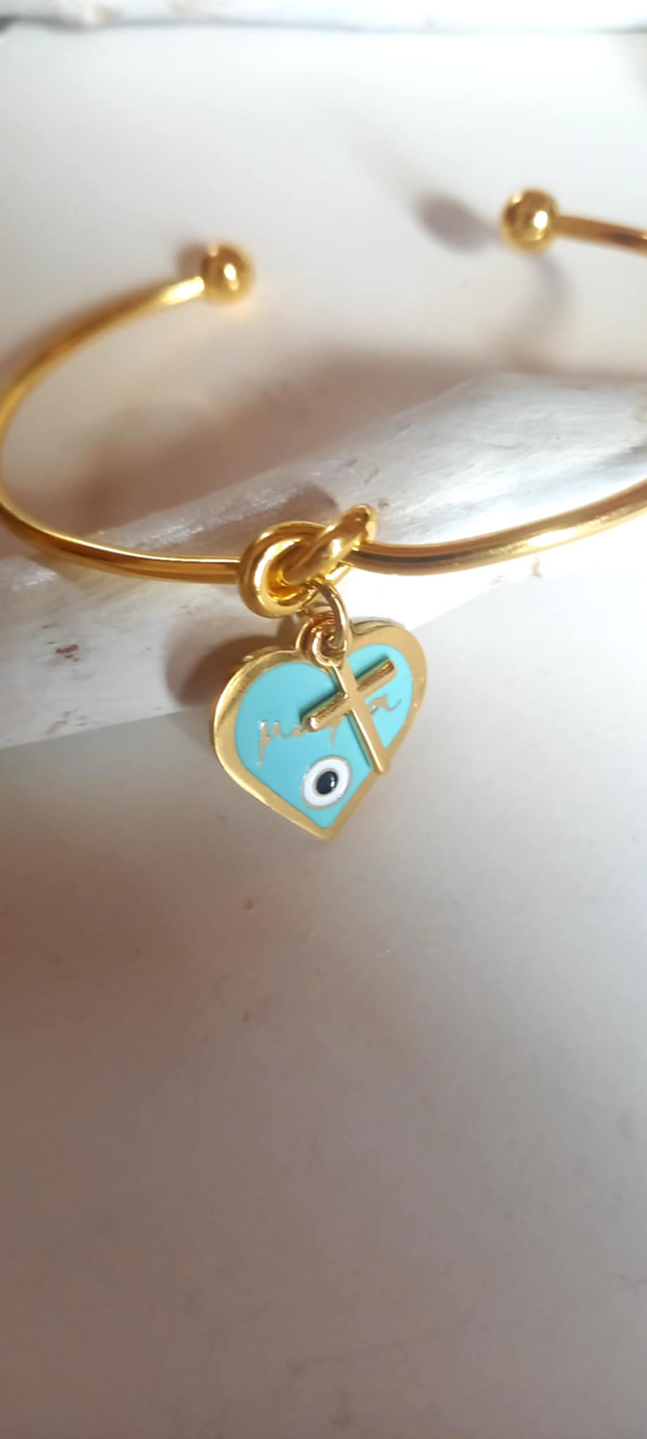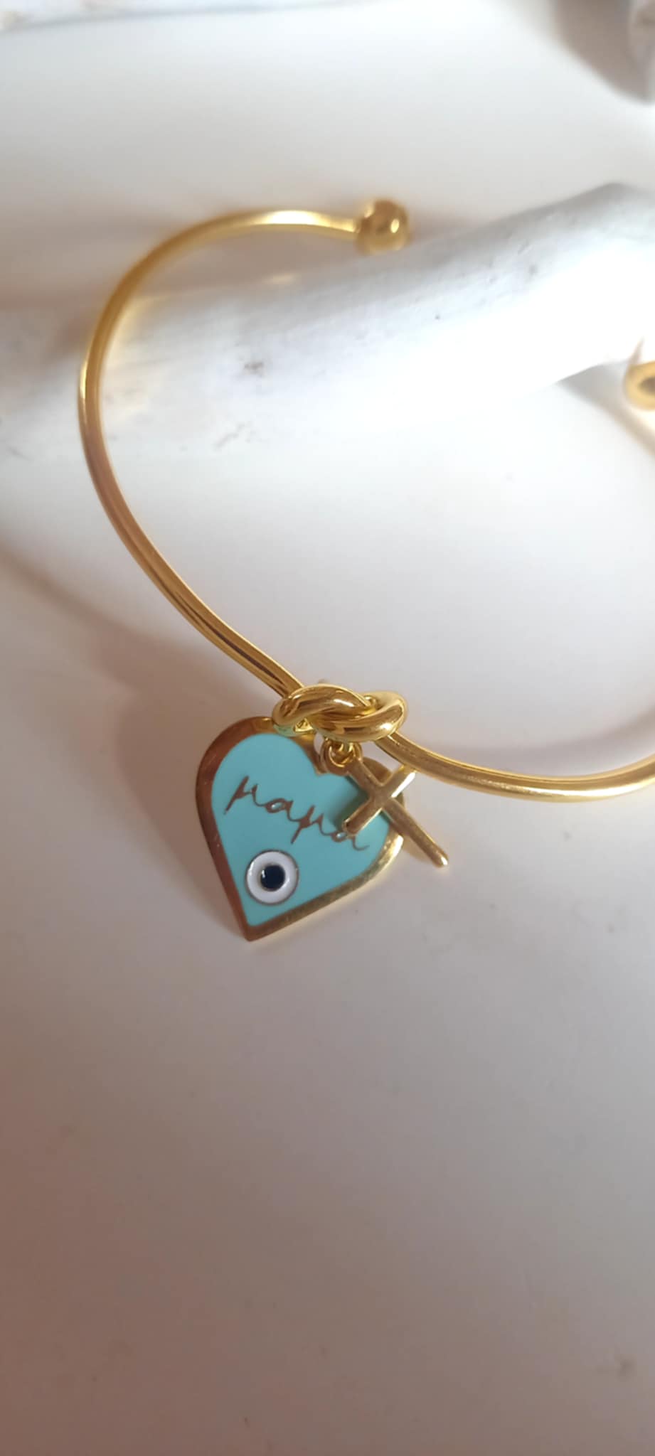 Μαρτυρικό βραχιόλι βάπτισης για τη μαμά με βέργα, ατσάλινο στοιχείο καρδιά με μάτι και σμάλτο σε άκουα χρώμα και επιχρυσωμένο σταυρουδάκι.