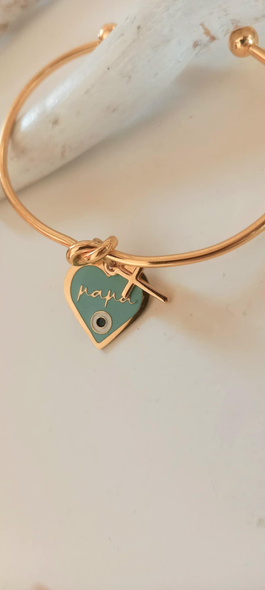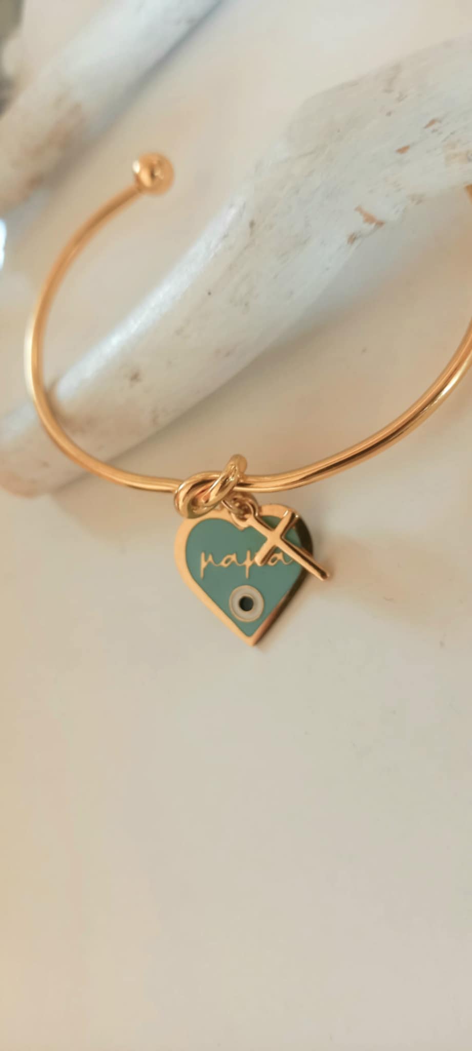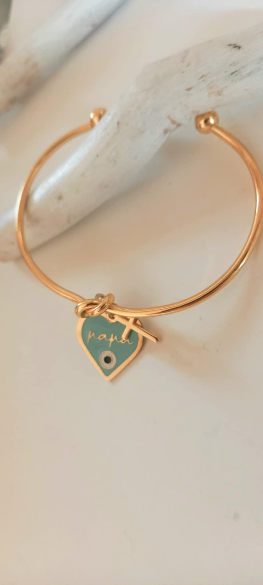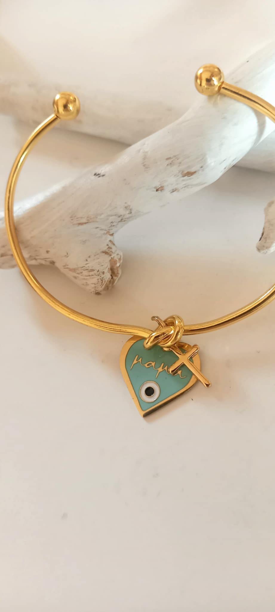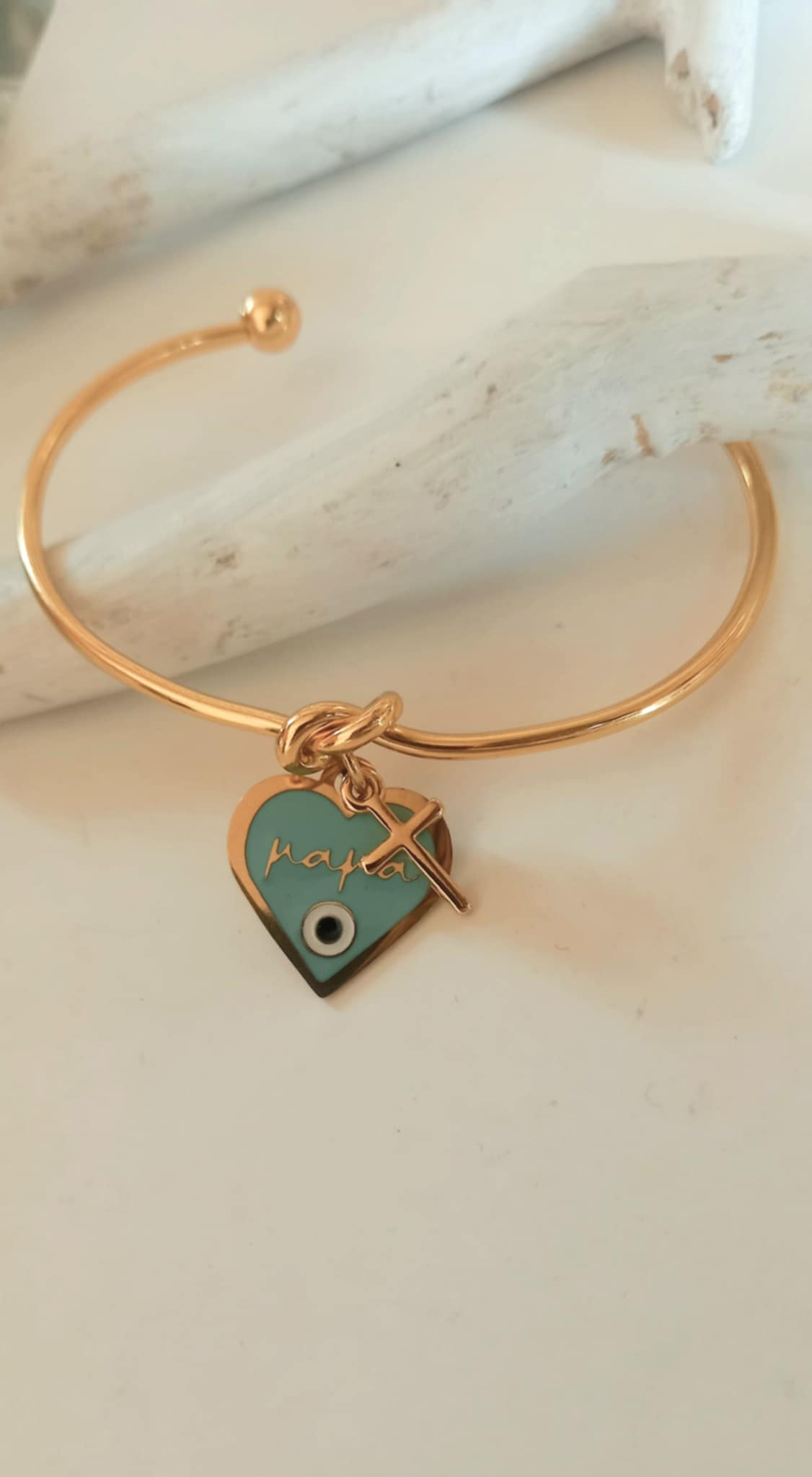Μαρτυρικό βραχιόλι βάπτισης για τη μαμά με βέργα, ατσάλινο στοιχείο καρδιά με μάτι και σμάλτο σε άκουα χρώμα και επιχρυσωμένο σταυρουδάκι.