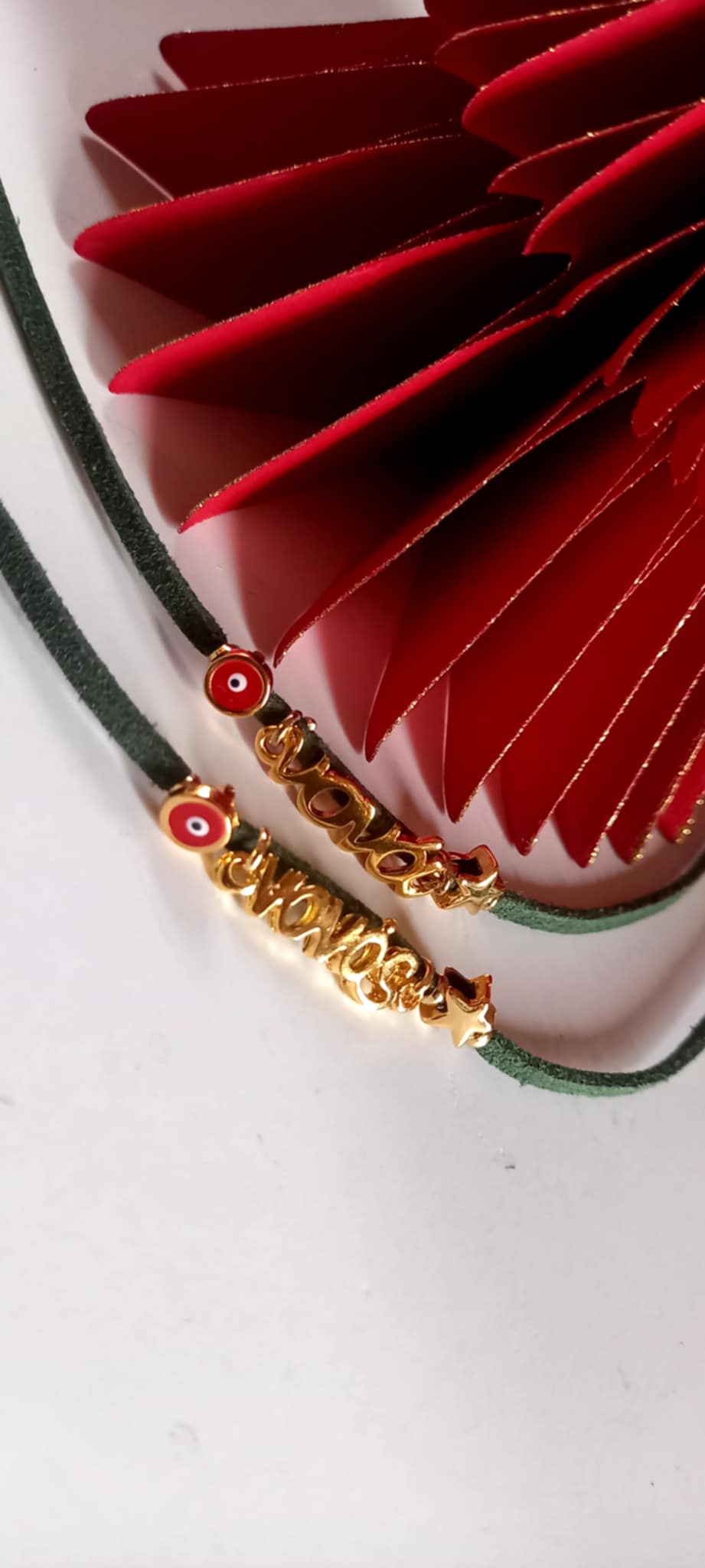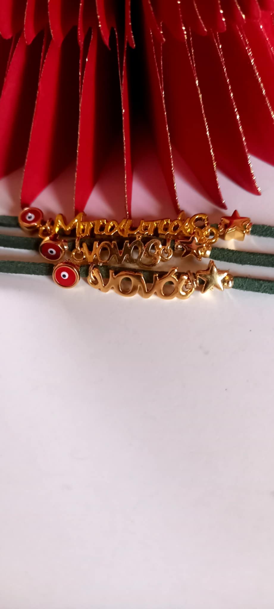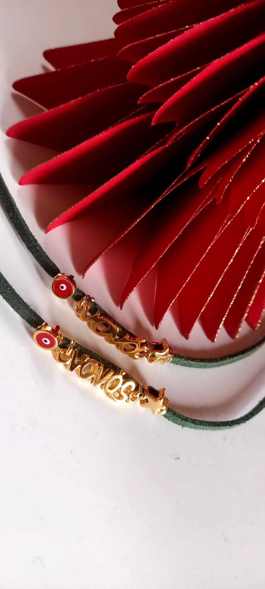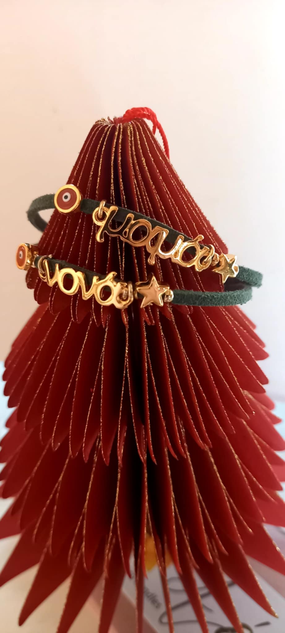 Χειροποίητο μαρτυρικό βραχιόλι - γούρι για μαμά, νονά, μπαμπά και νονό, με καστόρι σε πράσινο χρώμα, επιχρυσωμένο στοιχείο μαμά ή νονά, επιχρυσωμένο αστεράκι και μάτι με σμάλτο σε κόκκινο χρώμα.