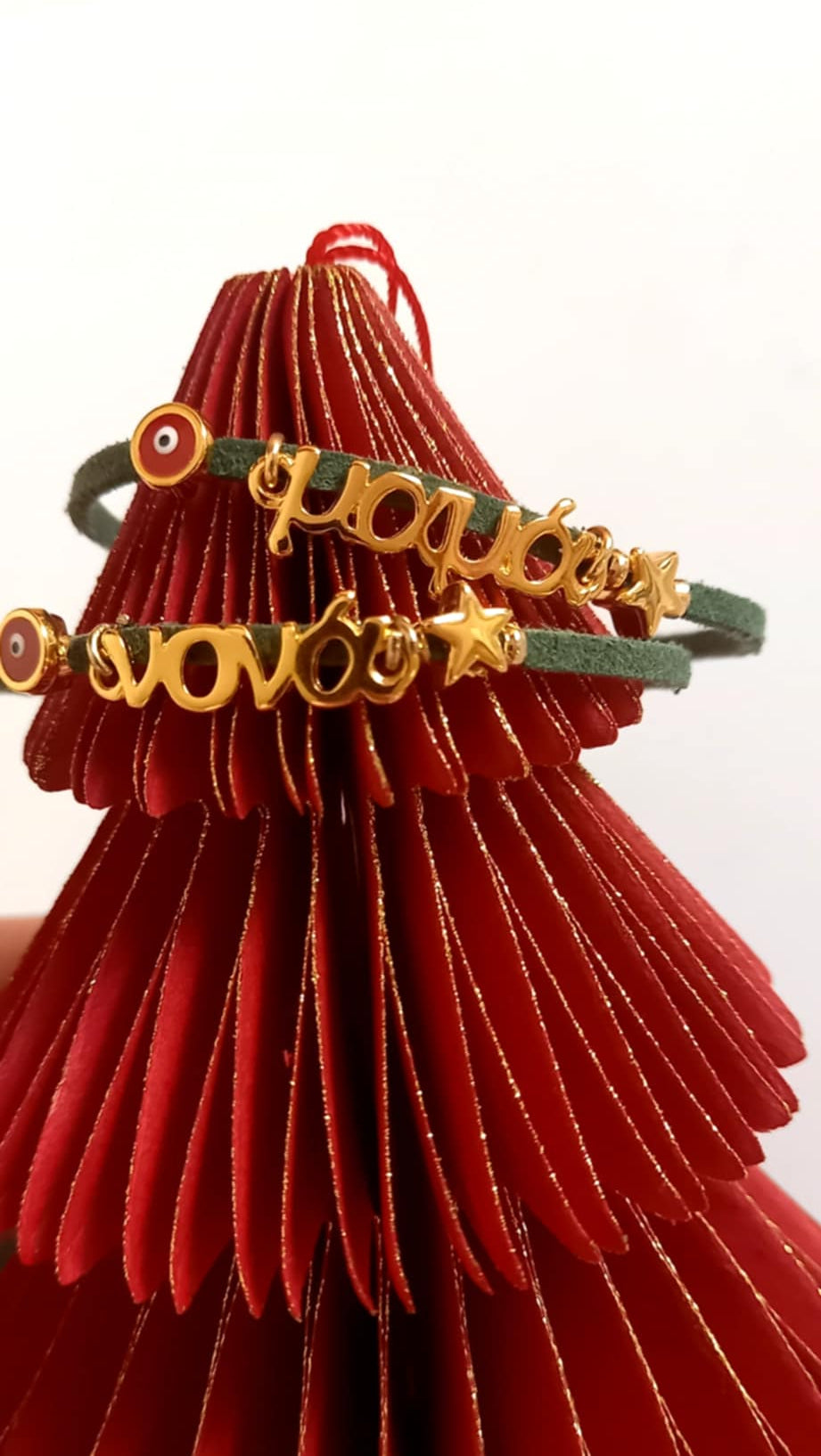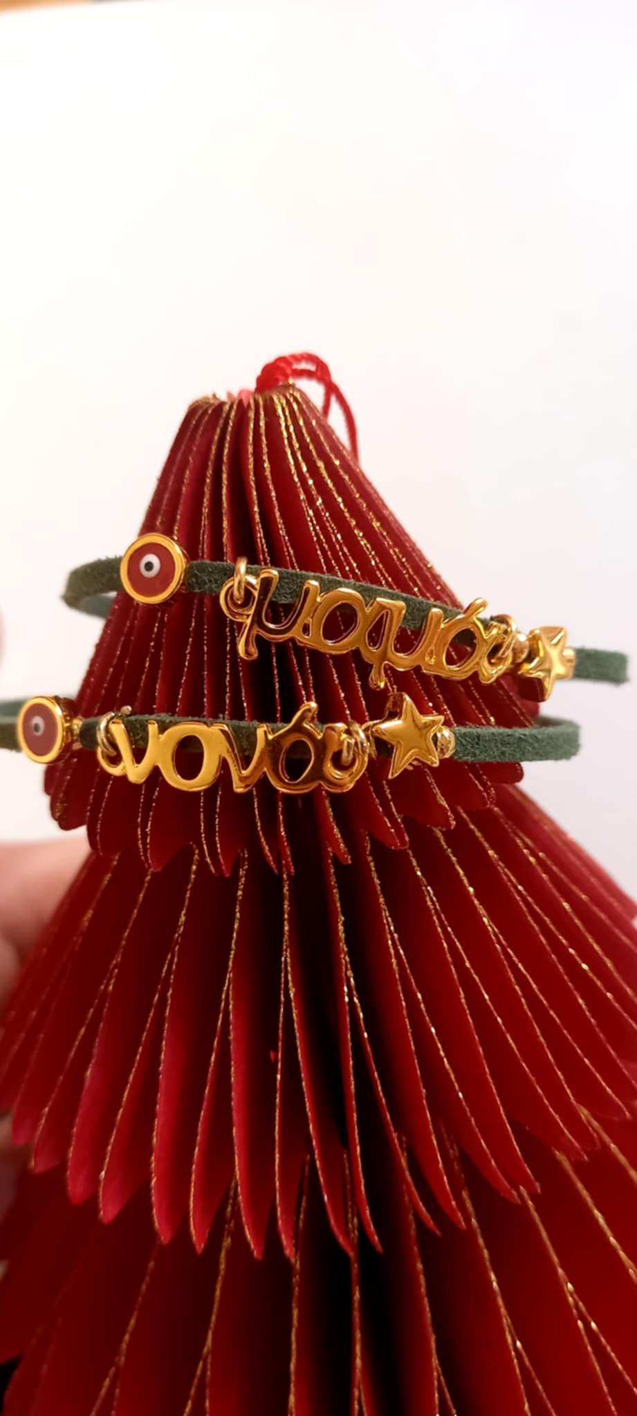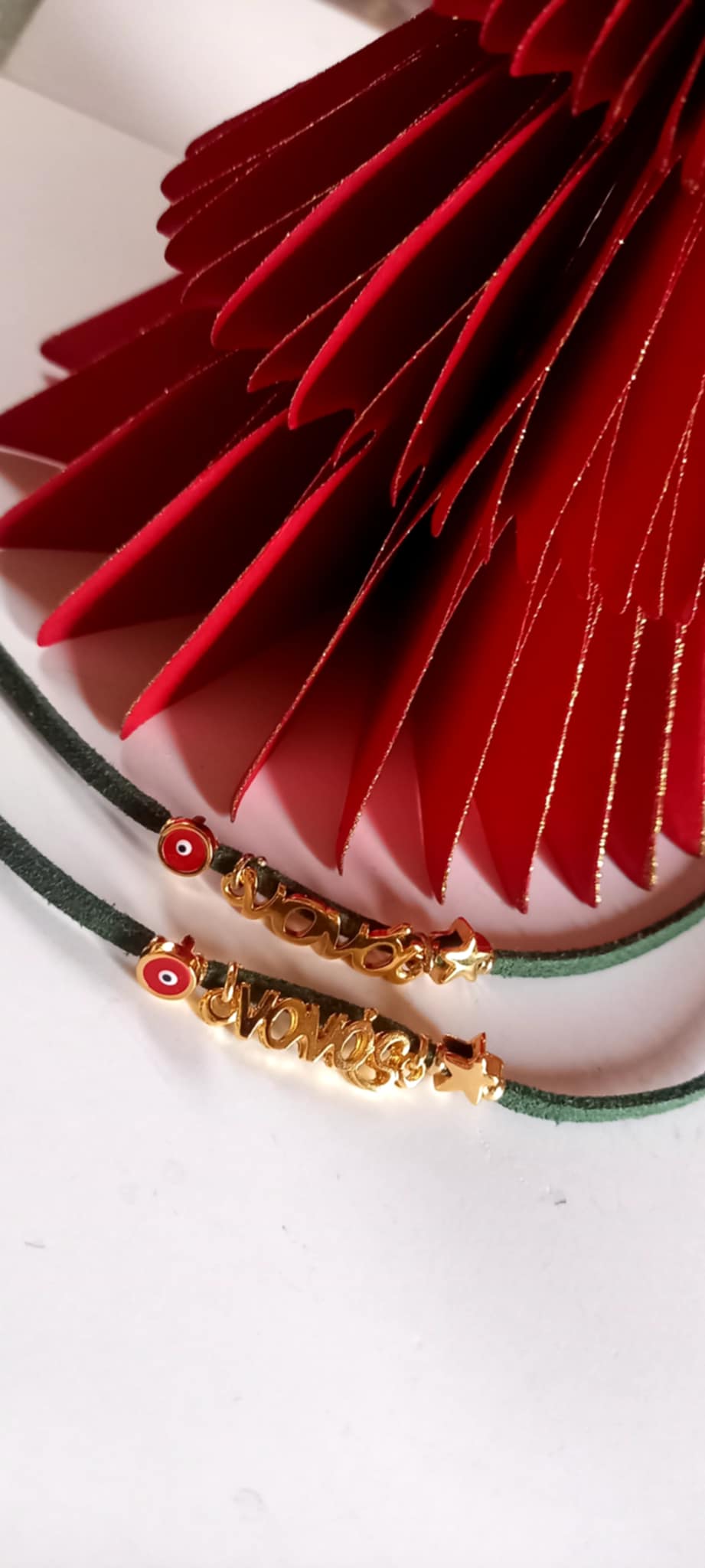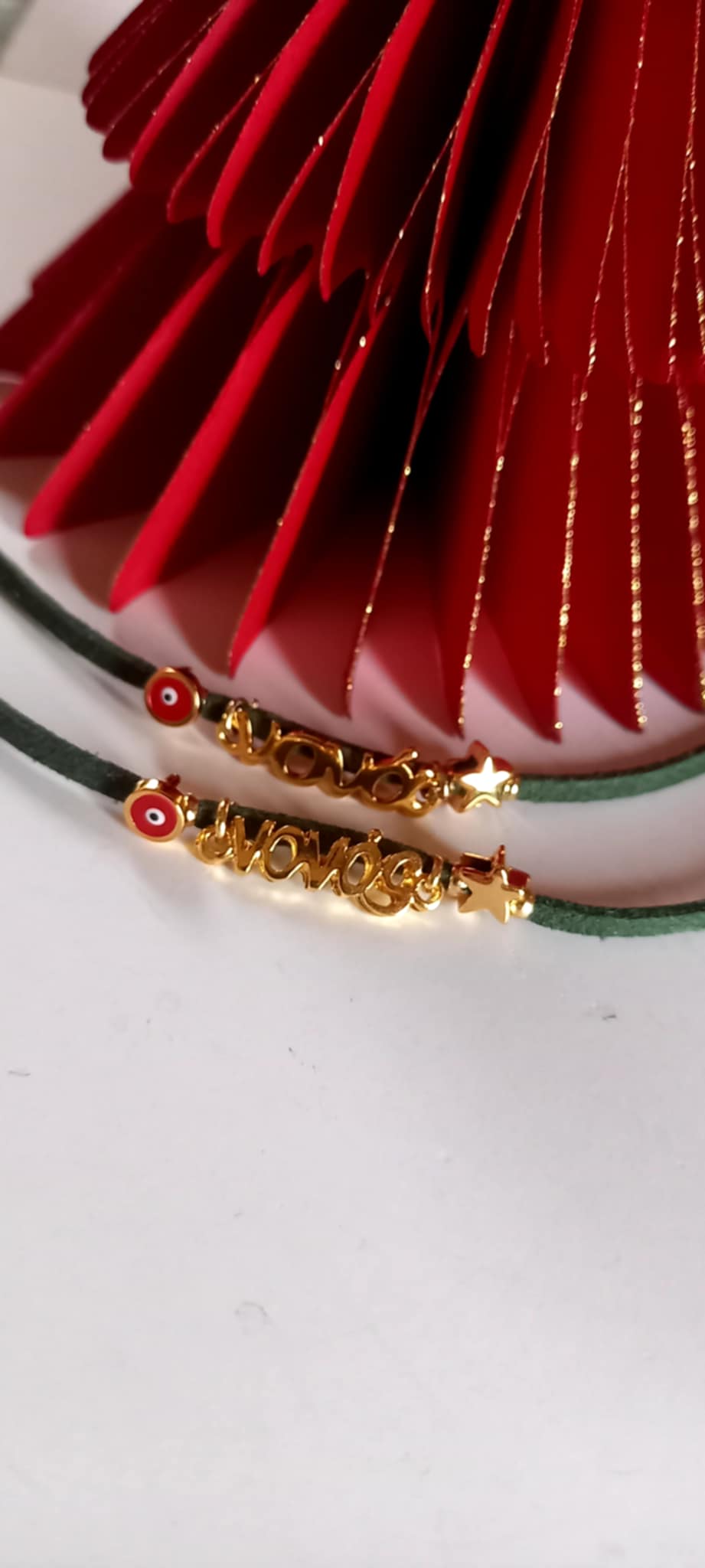 Χειροποίητο μαρτυρικό βραχιόλι - γούρι για μαμά, νονά, μπαμπά και νονό, με καστόρι σε πράσινο χρώμα, επιχρυσωμένο στοιχείο μαμά ή νονά, επιχρυσωμένο αστεράκι και μάτι με σμάλτο σε κόκκινο χρώμα.