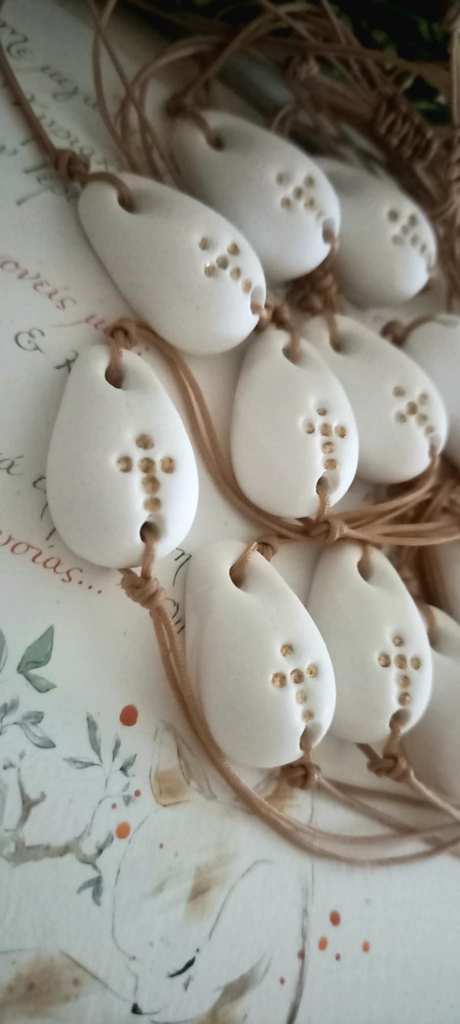 Χειροποίητο μαρτυρικό βραχιόλι με υφή πορσελάνης και χαραγμένο σταυρό σε χρυσό χρώμα, δεμένο με κερωμένο κορδόνι στο χρώμα της άμμου.
