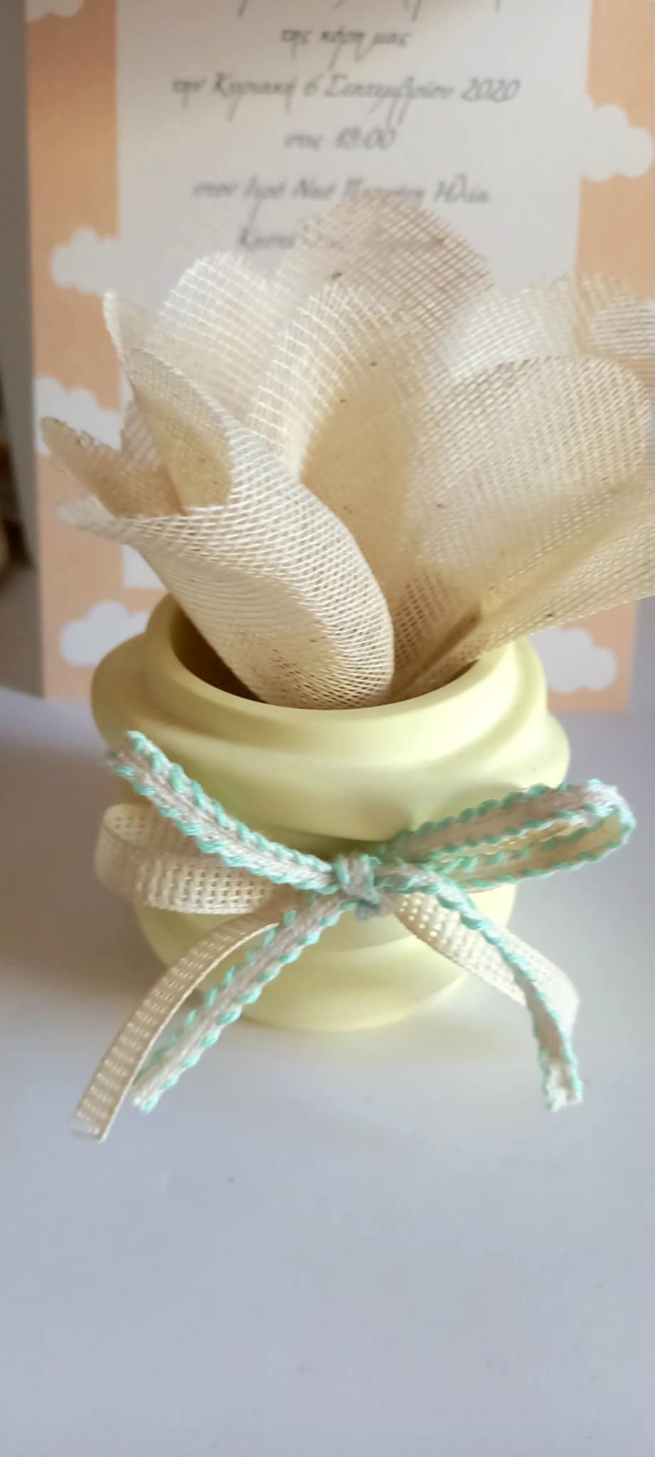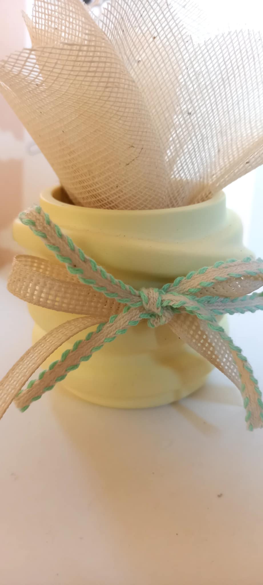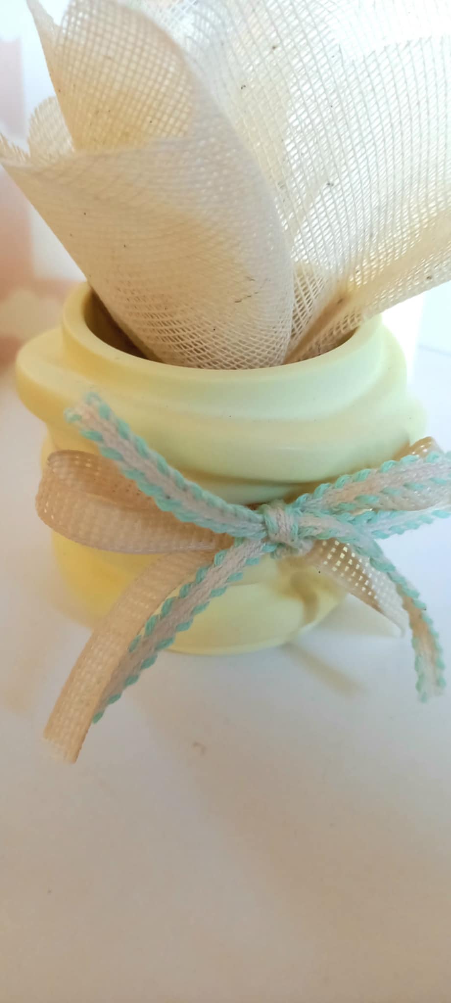 Μπομπονιέρα βάπτισης βαζάκι ρεσώ με βελούδινη υφή πορσελάνης σε απαλό κίτρινο χρώμα, με κορδέλες στο χρώμα της μέντας.