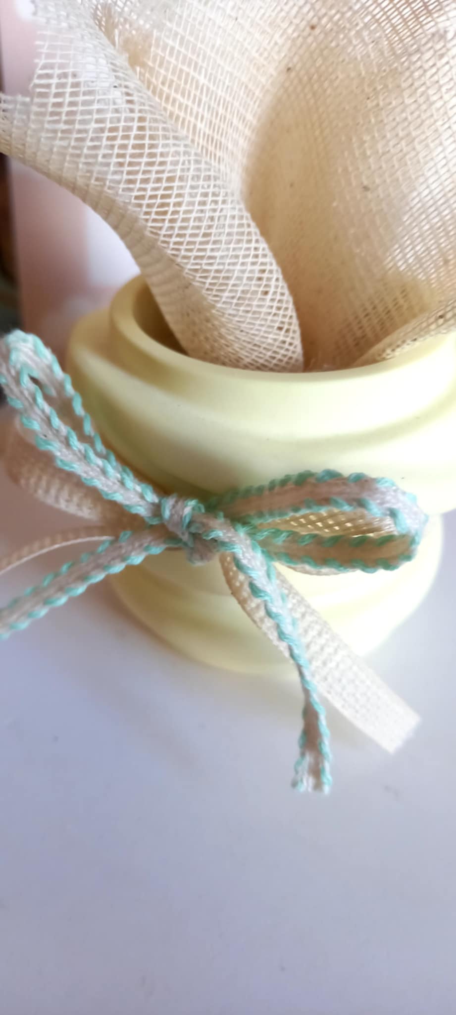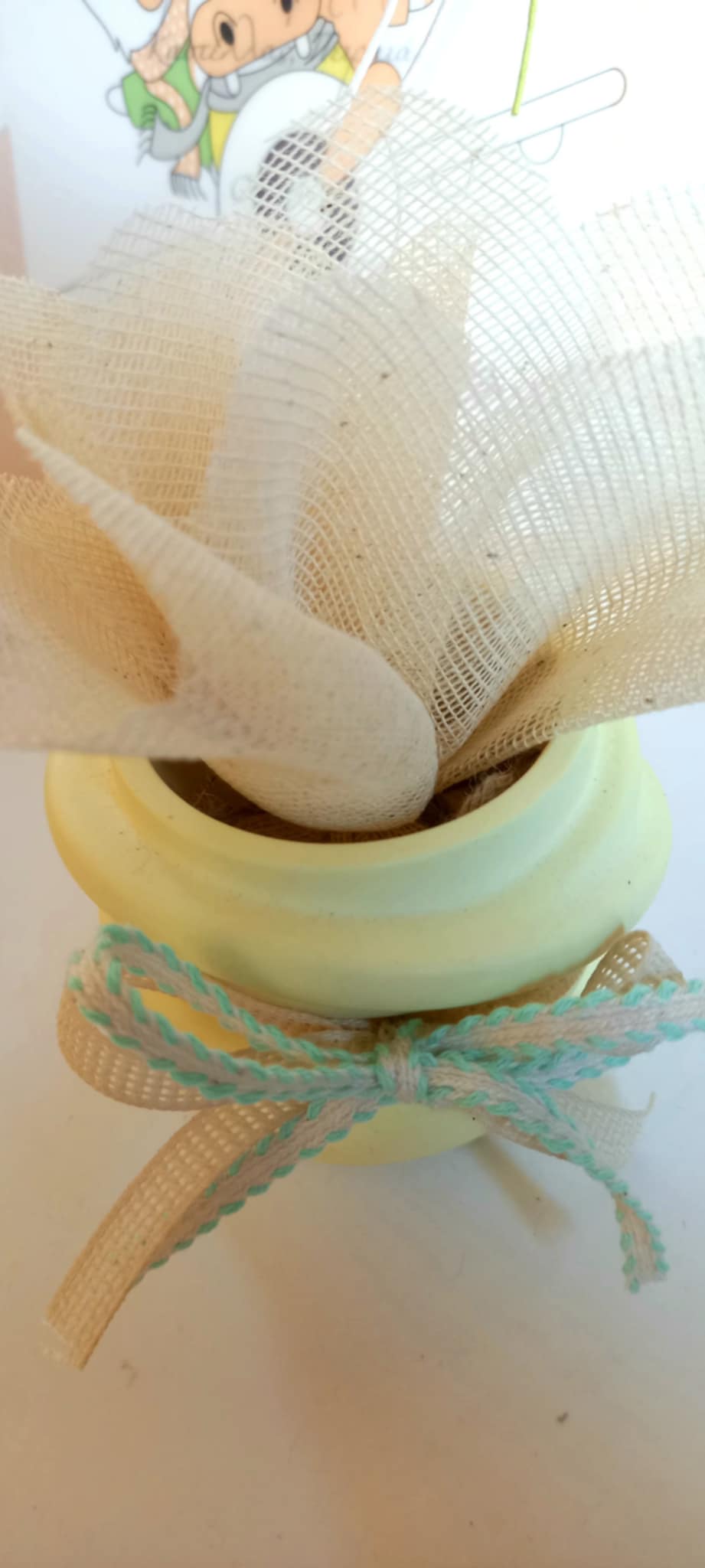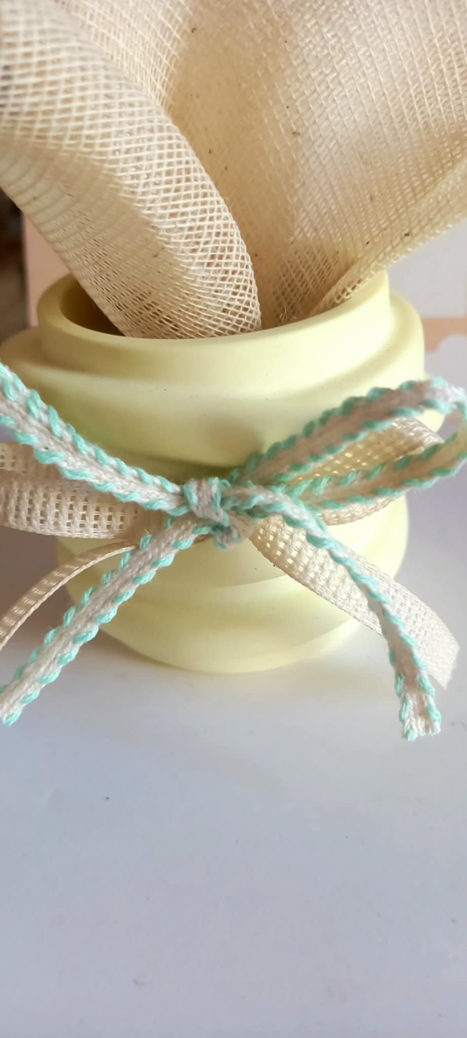 Μπομπονιέρα βάπτισης βαζάκι ρεσώ με βελούδινη υφή πορσελάνης σε απαλό κίτρινο χρώμα, με κορδέλες στο χρώμα της μέντας.