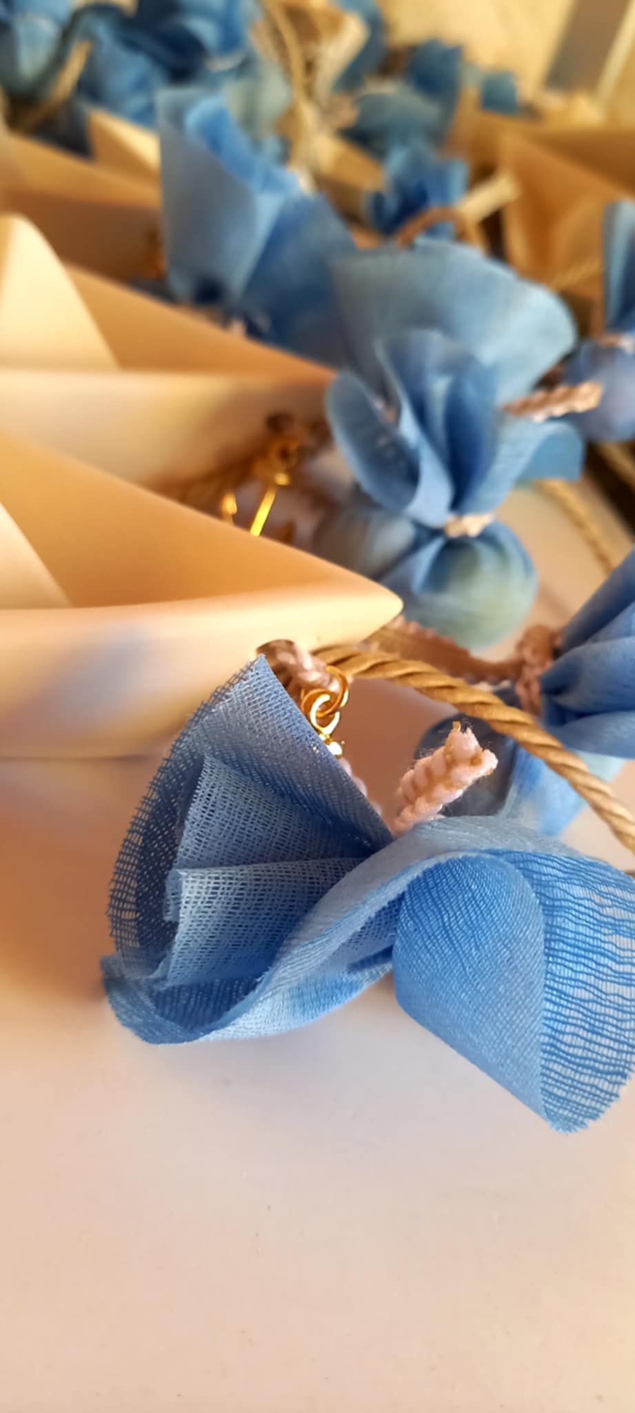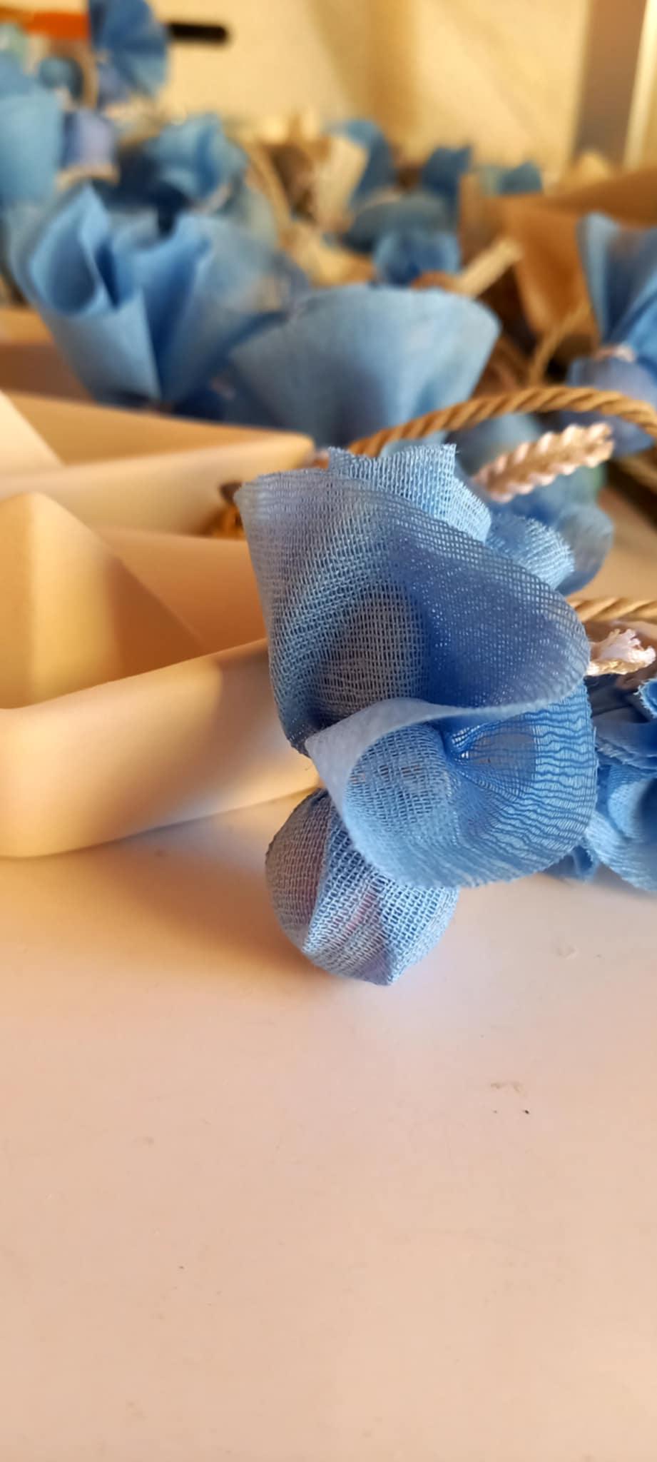 Περιλαμβάνει τρία κουφέτα Χατζηγιαννάκη τυλιγμένα σε γάζα σε γαλάζιο χρώμα.