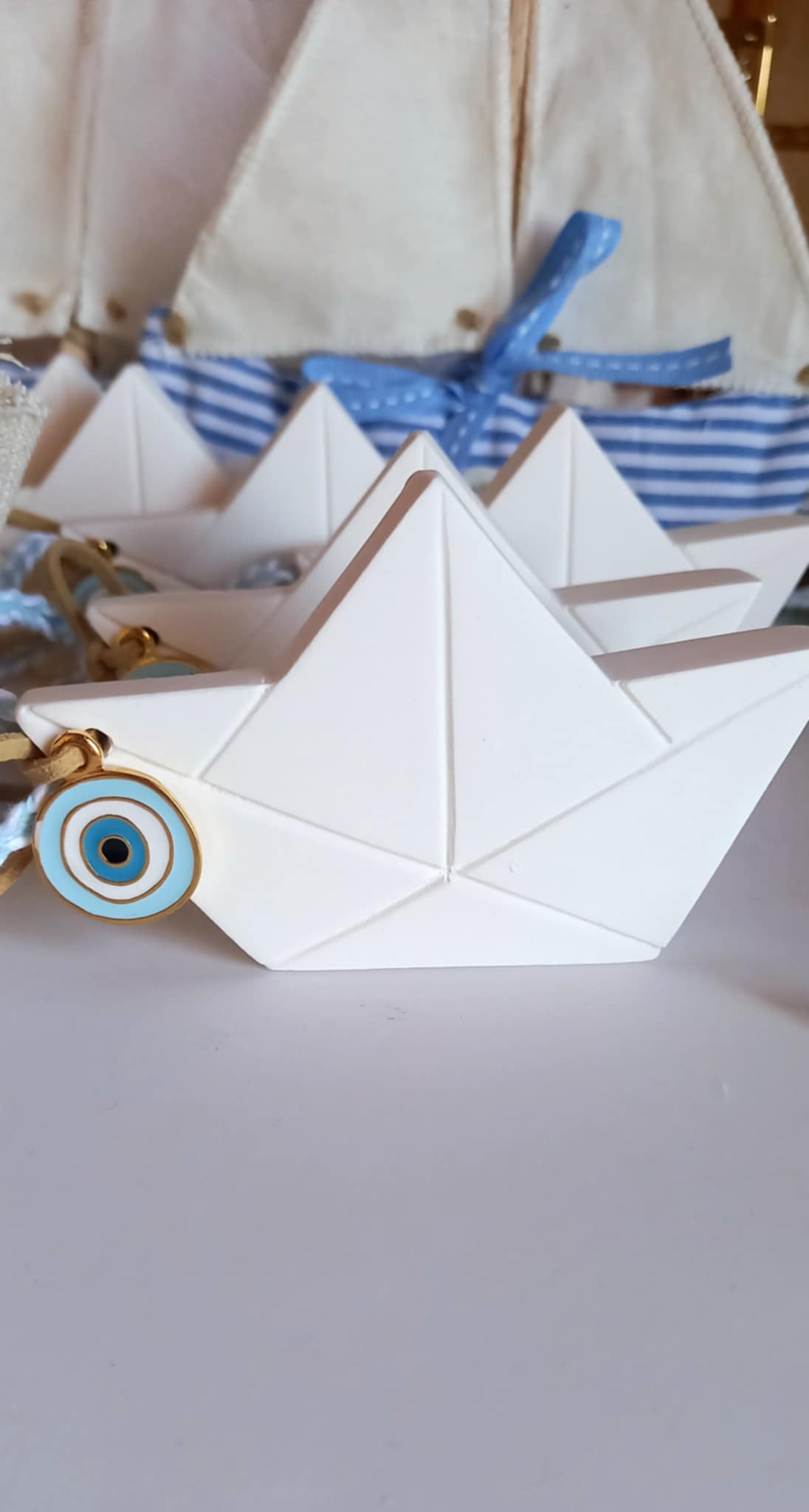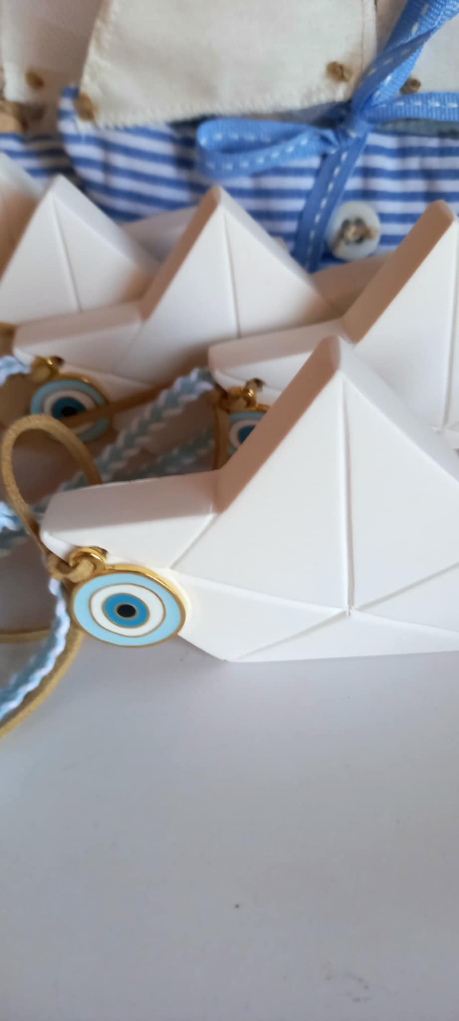 Μπομπονιέρα βάπτισης καραβάκι με υφή πορσελάνης και μάτι