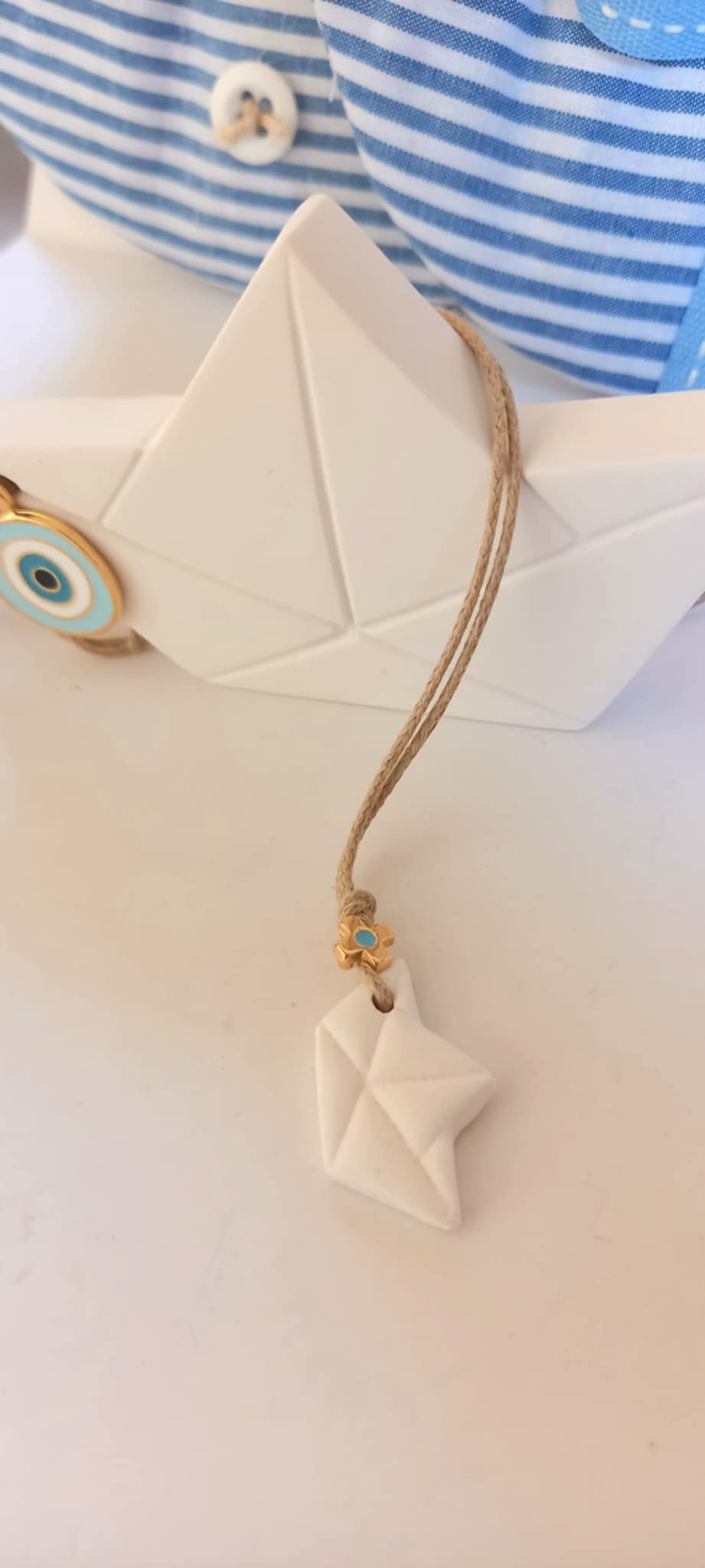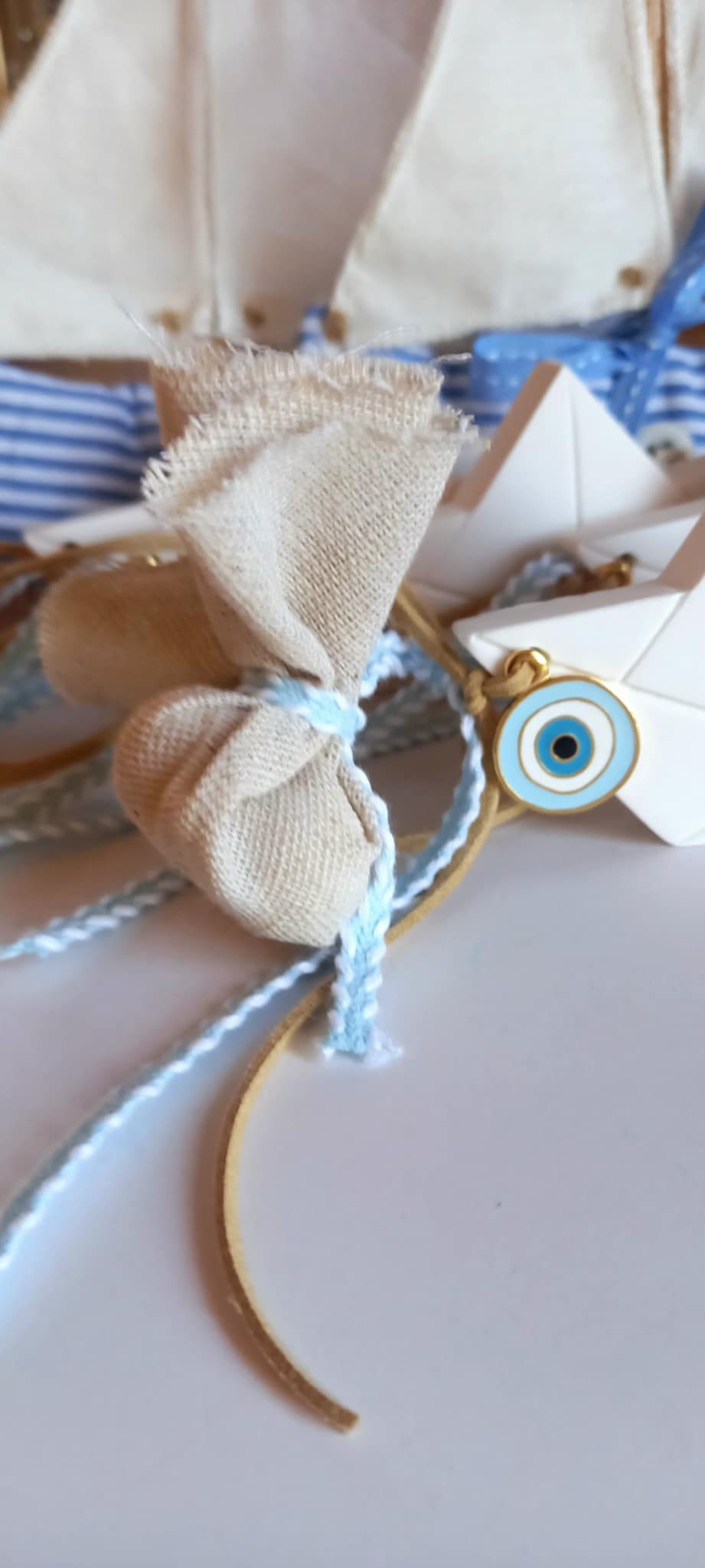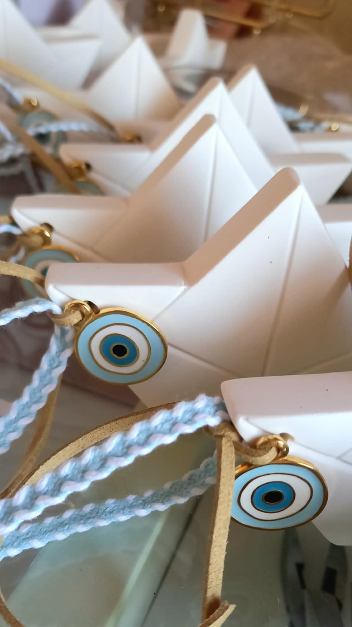Χειροποίητη μπομπονιέρα βάπτιης καραβάκι σε λευκό χρώμα με υφή πορσελάνης, επιχρυσωμένο μάτι με γαλάζιο σμάλτο, καστόρι στο χρώμα της άμμου και γαλάζια κορδέλα.
