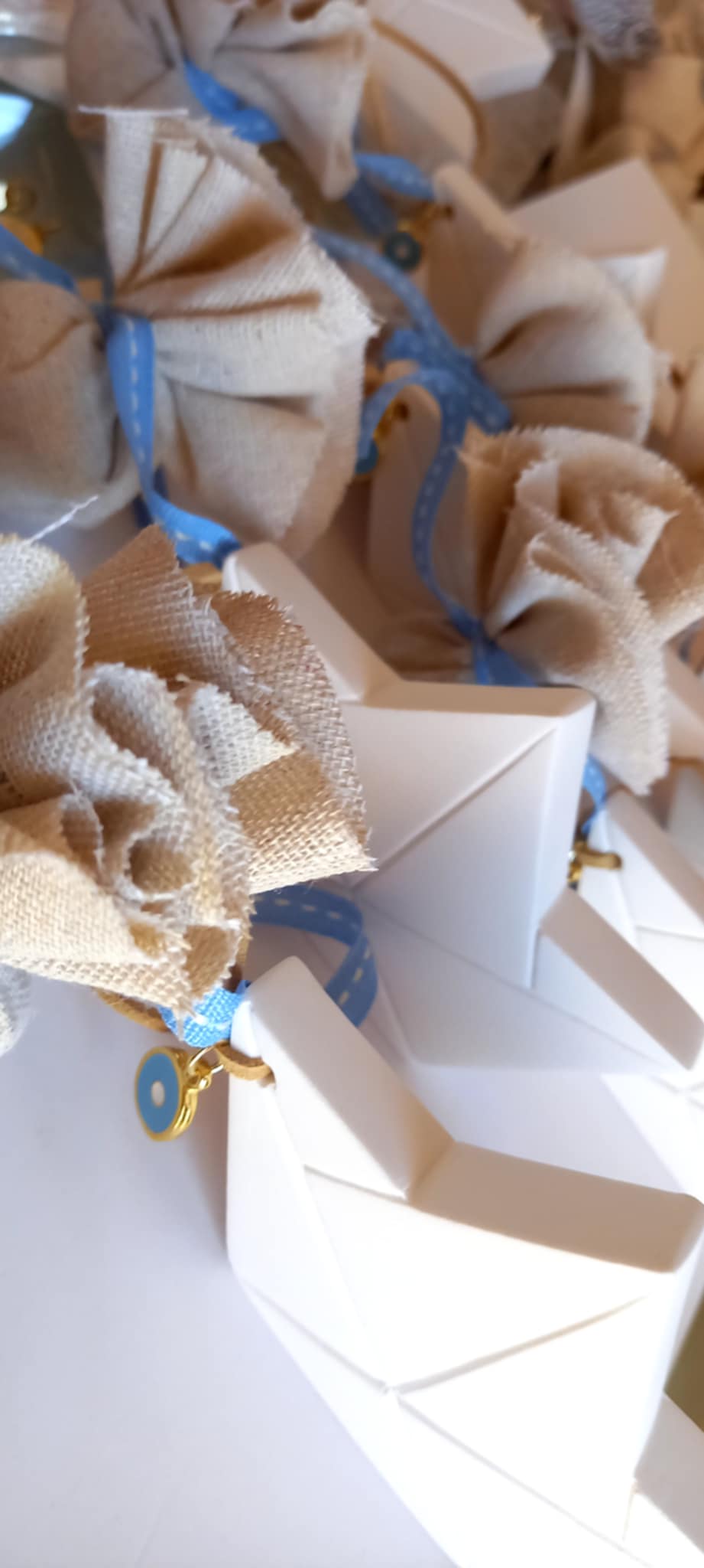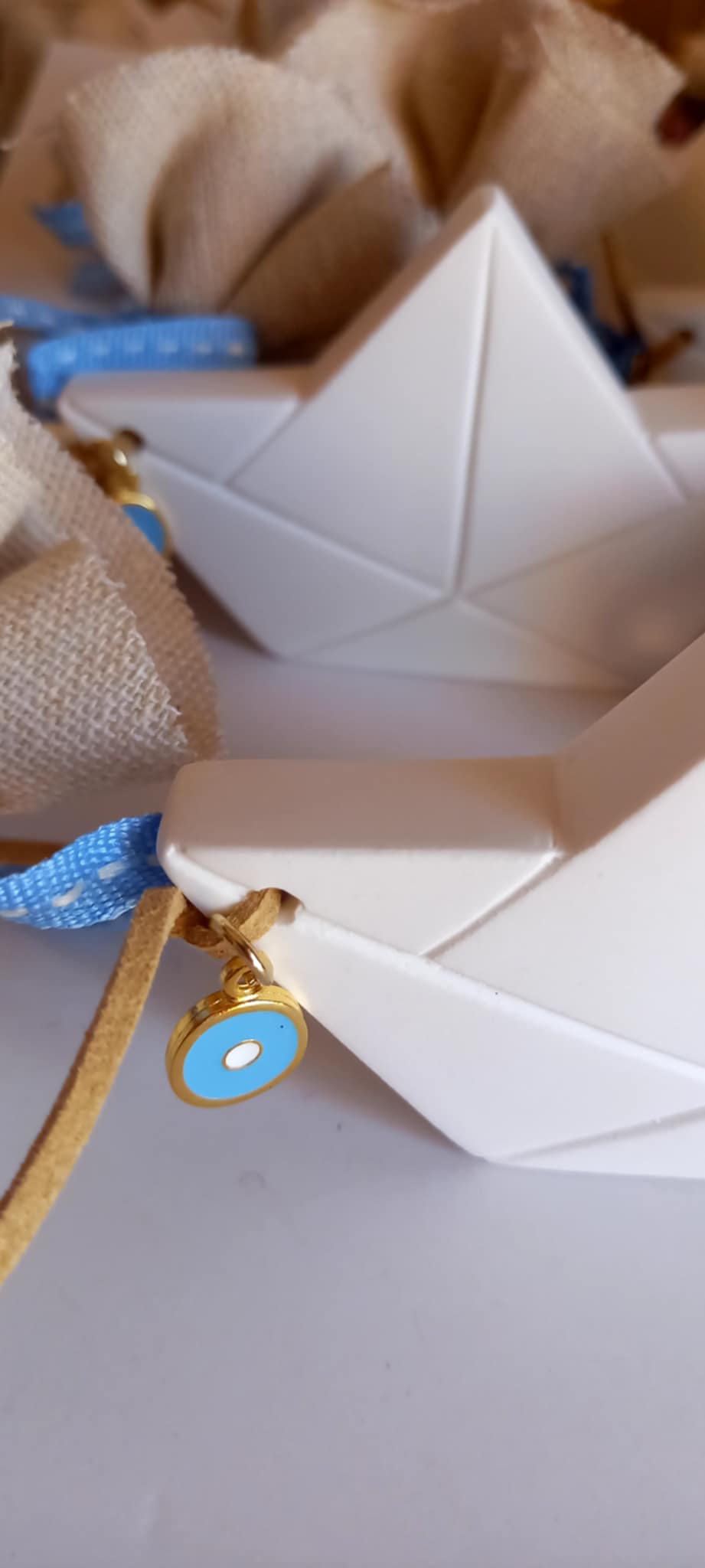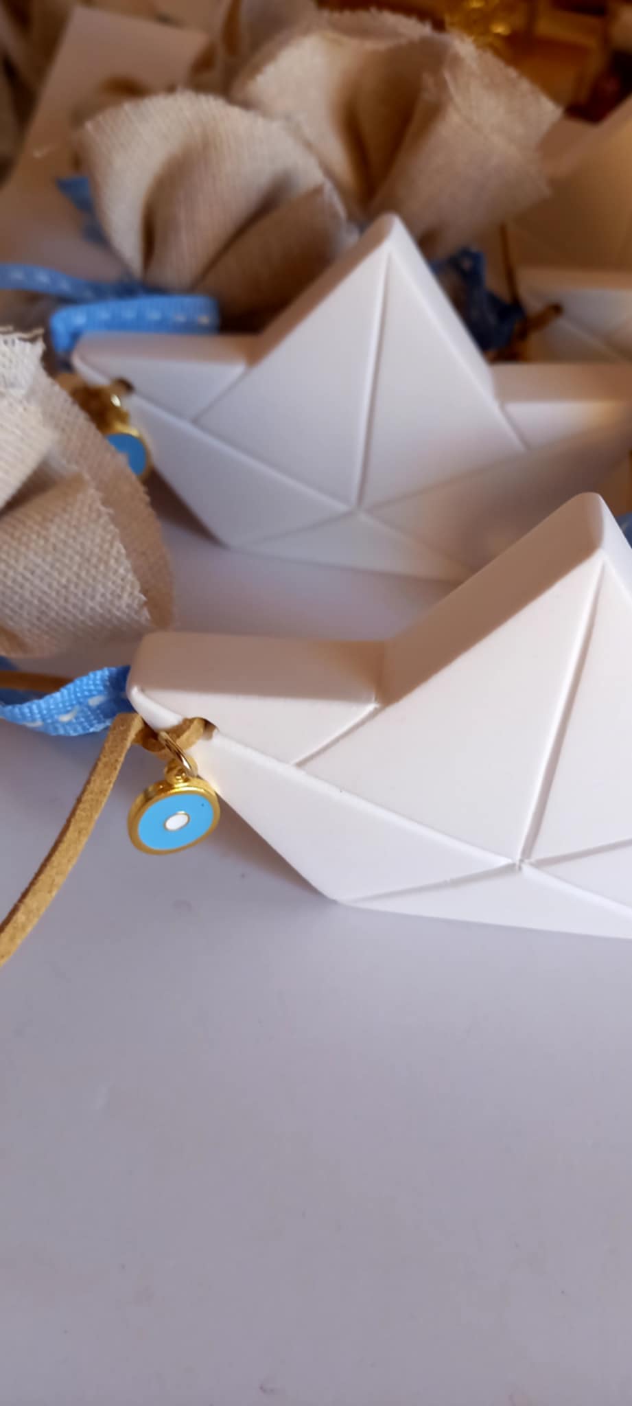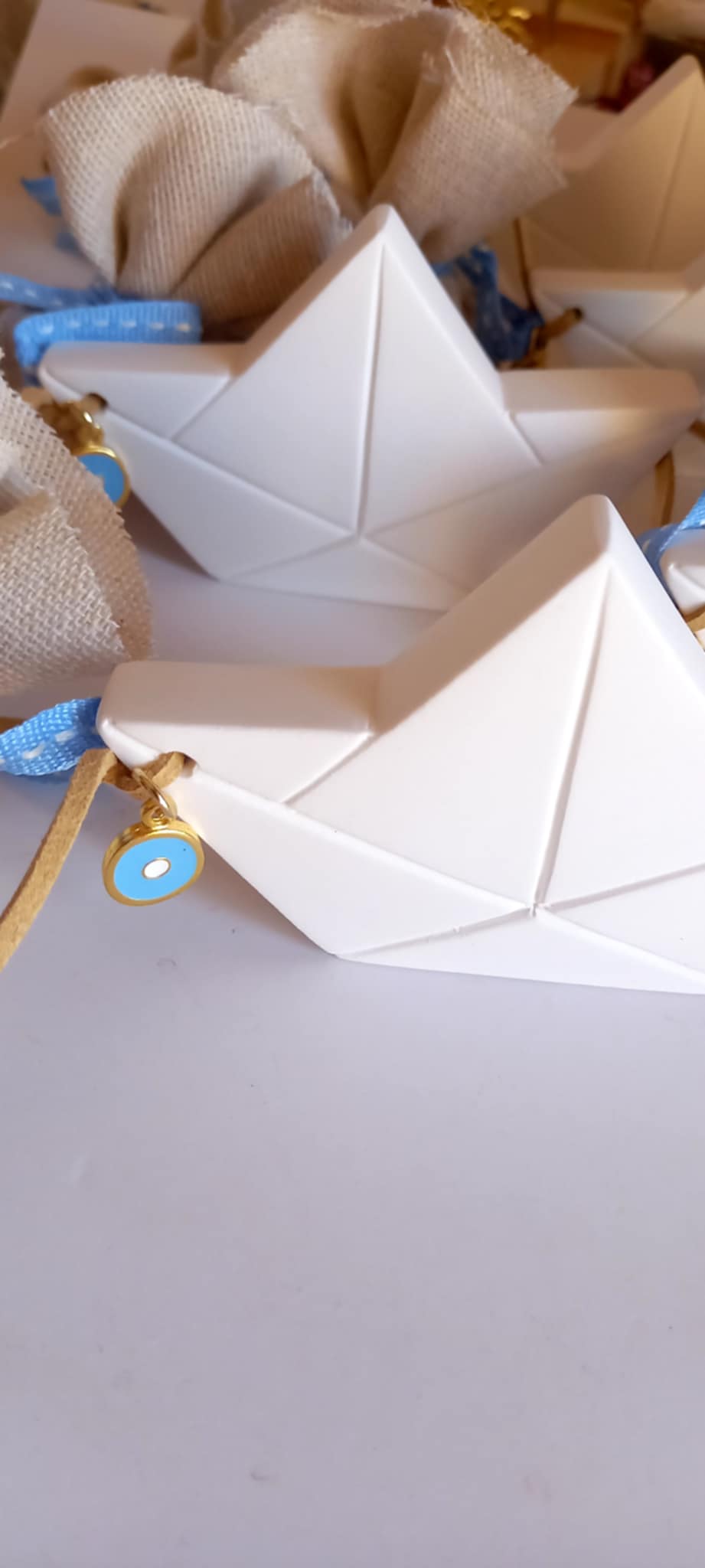 Μπομπονιέρα βάπτισης καραβάκι με υφή πορσελάνης και μάτι