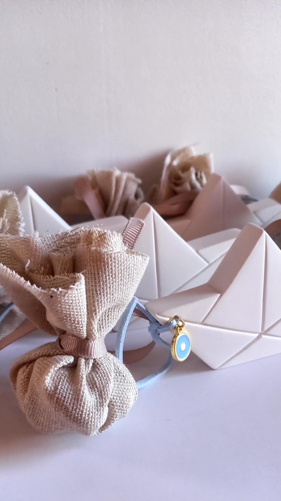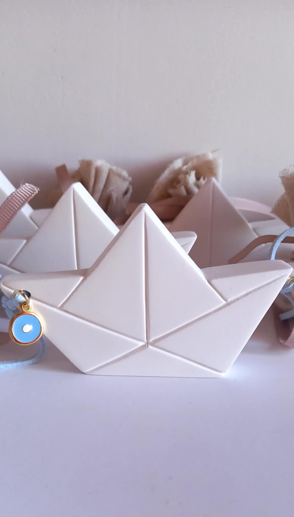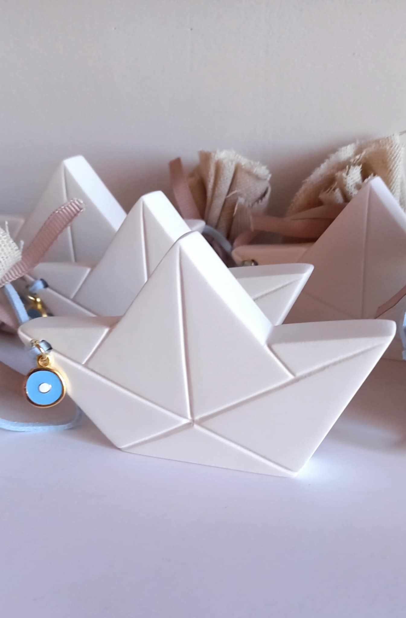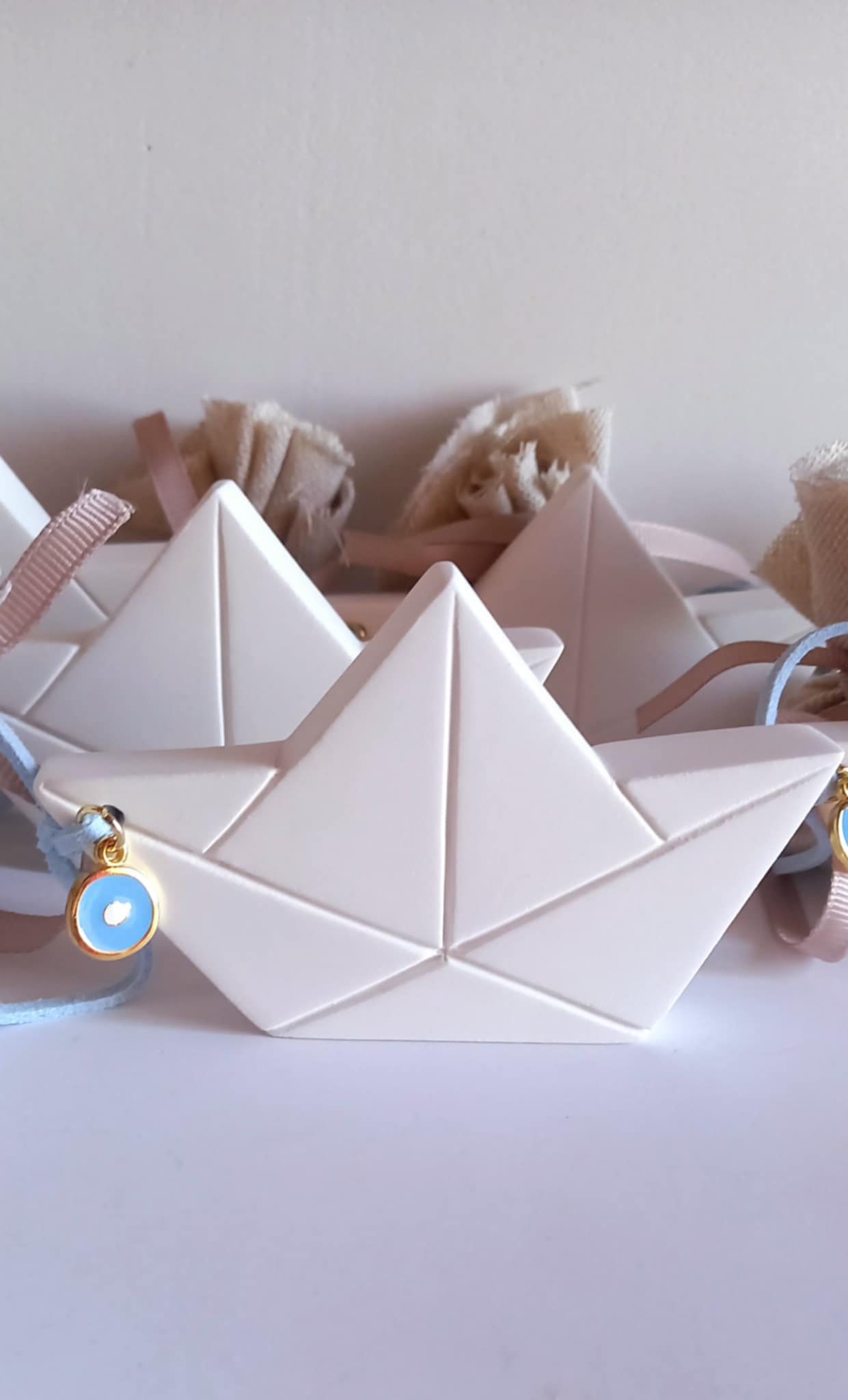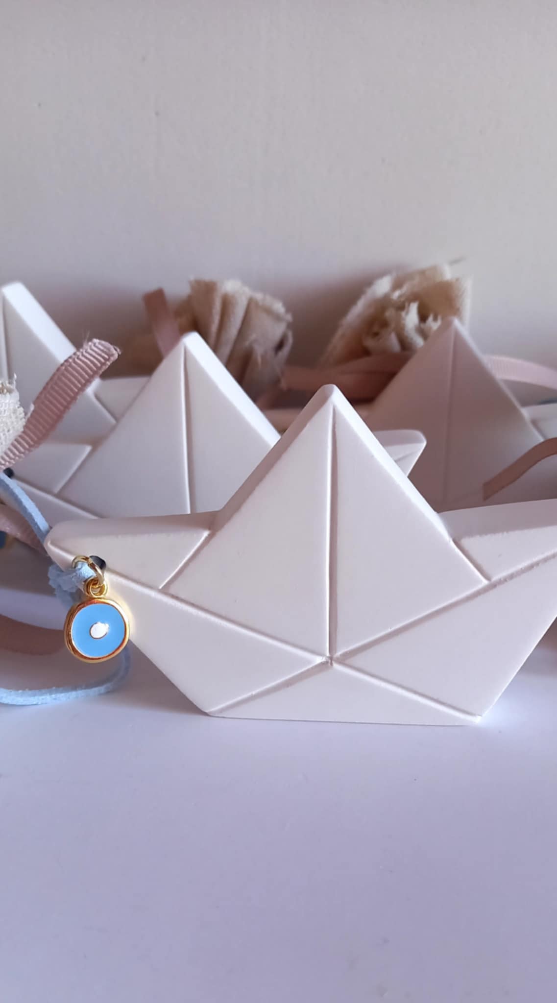 Μπομπονιέρα βάπτισης καραβάκι με υφή πορσελάνης και μάτι