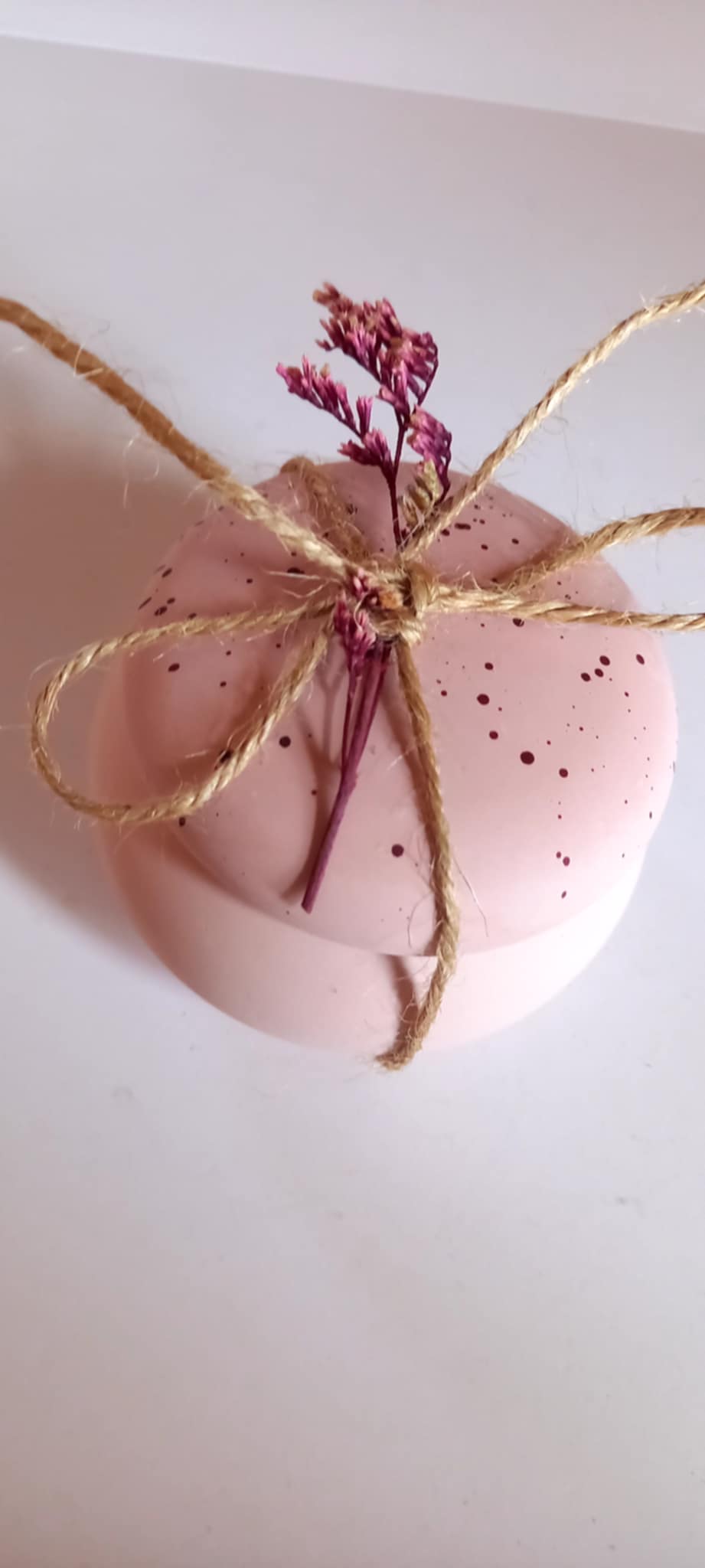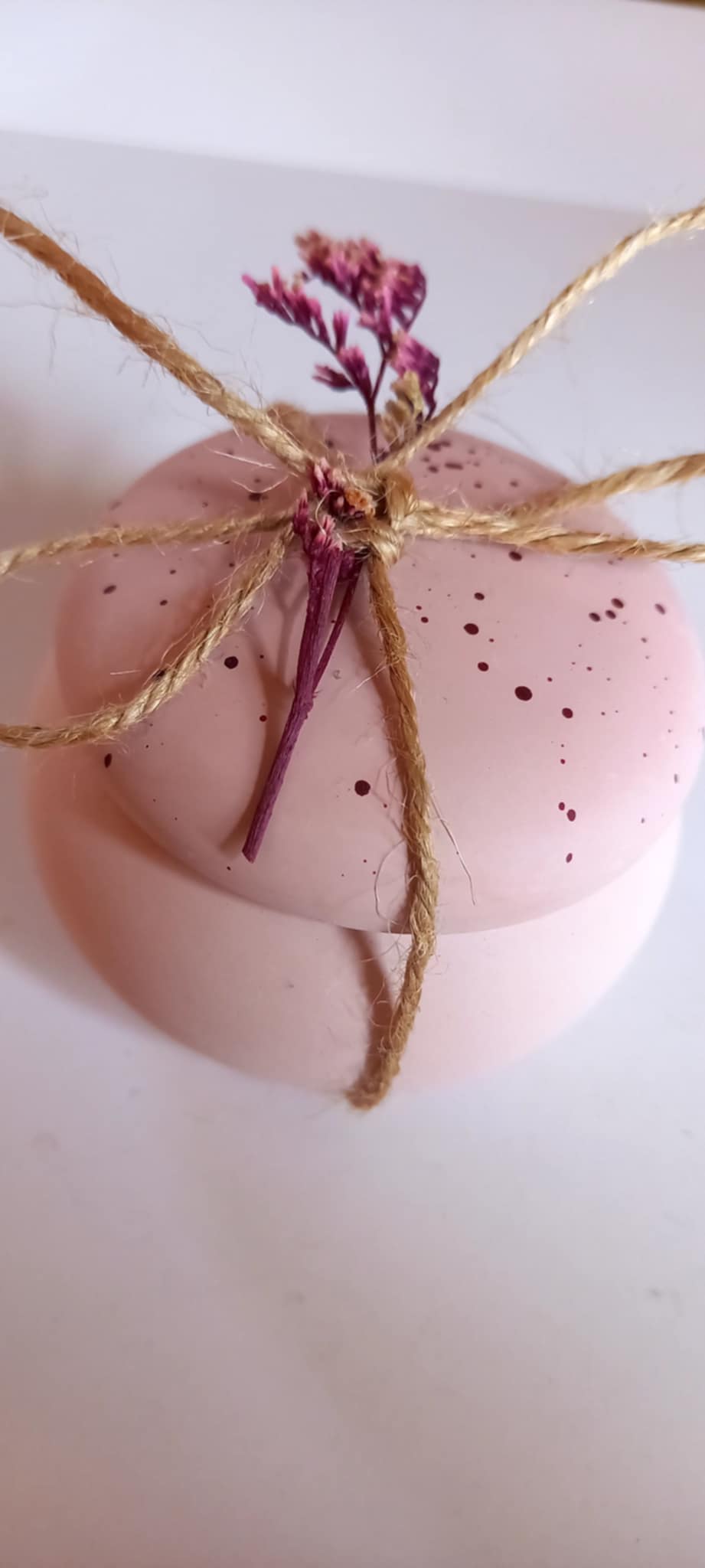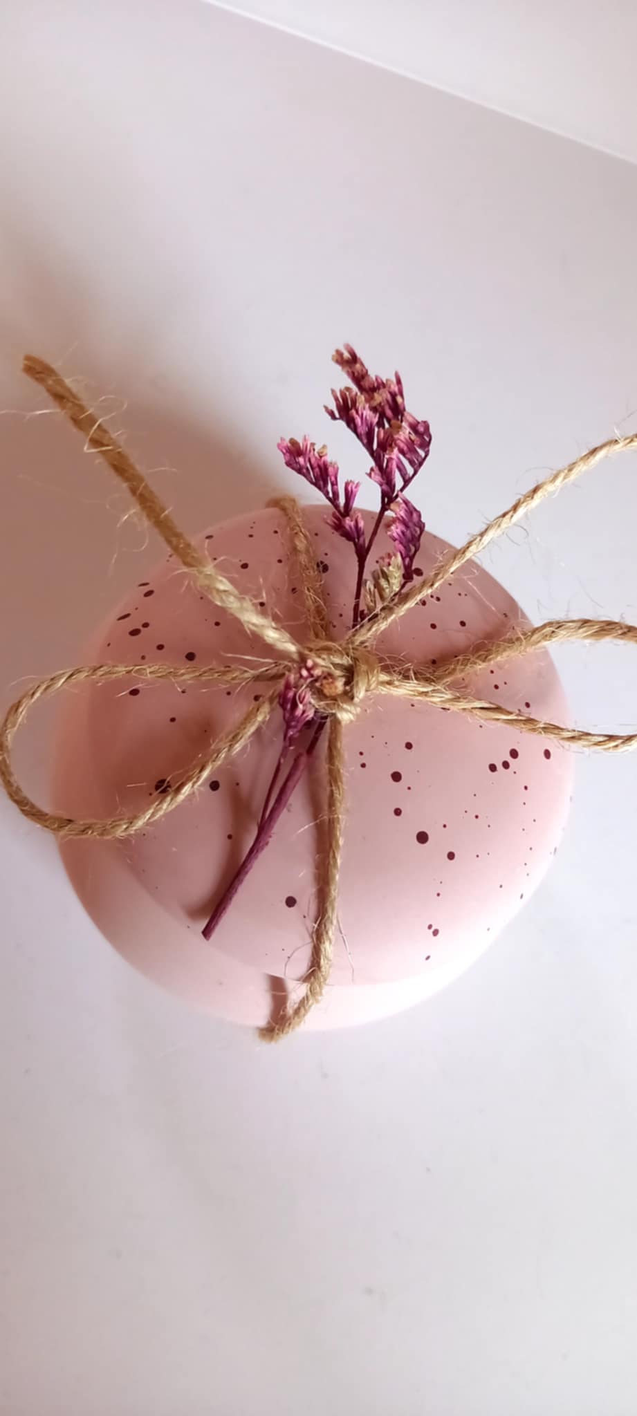 Μπομπονιέρα βάπτισης κεραμική μπιζουτιέρα σε απόχρωση baby pink με πιτσίλες, δεμένη με κορδόνι λινάτσας και αποξηραμένο λουλουδάκι.