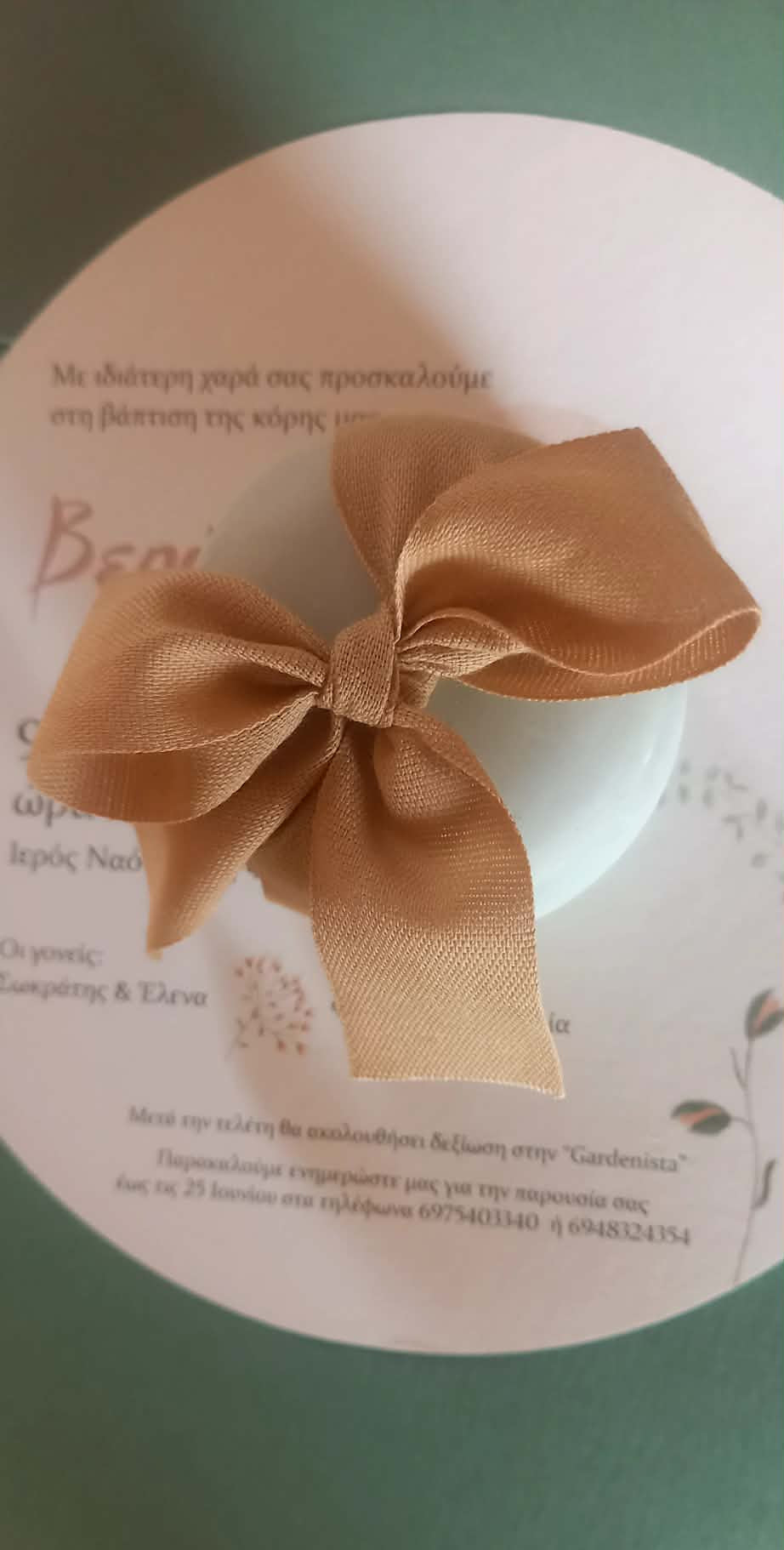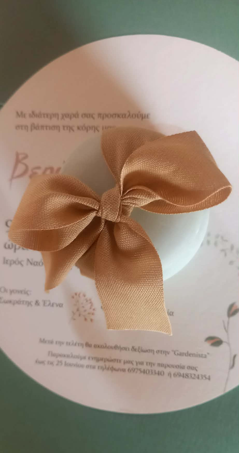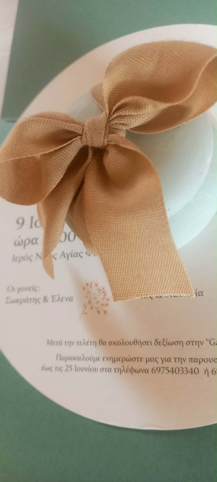 Μπομπονιέρα βάπτισης κεραμική μπιζουτιέρα σε γλυκό χρώμα μέντας, δεμένη σε φιόγκο με βαμβακερή κορδέλα σε μπεζ απόχρωση.