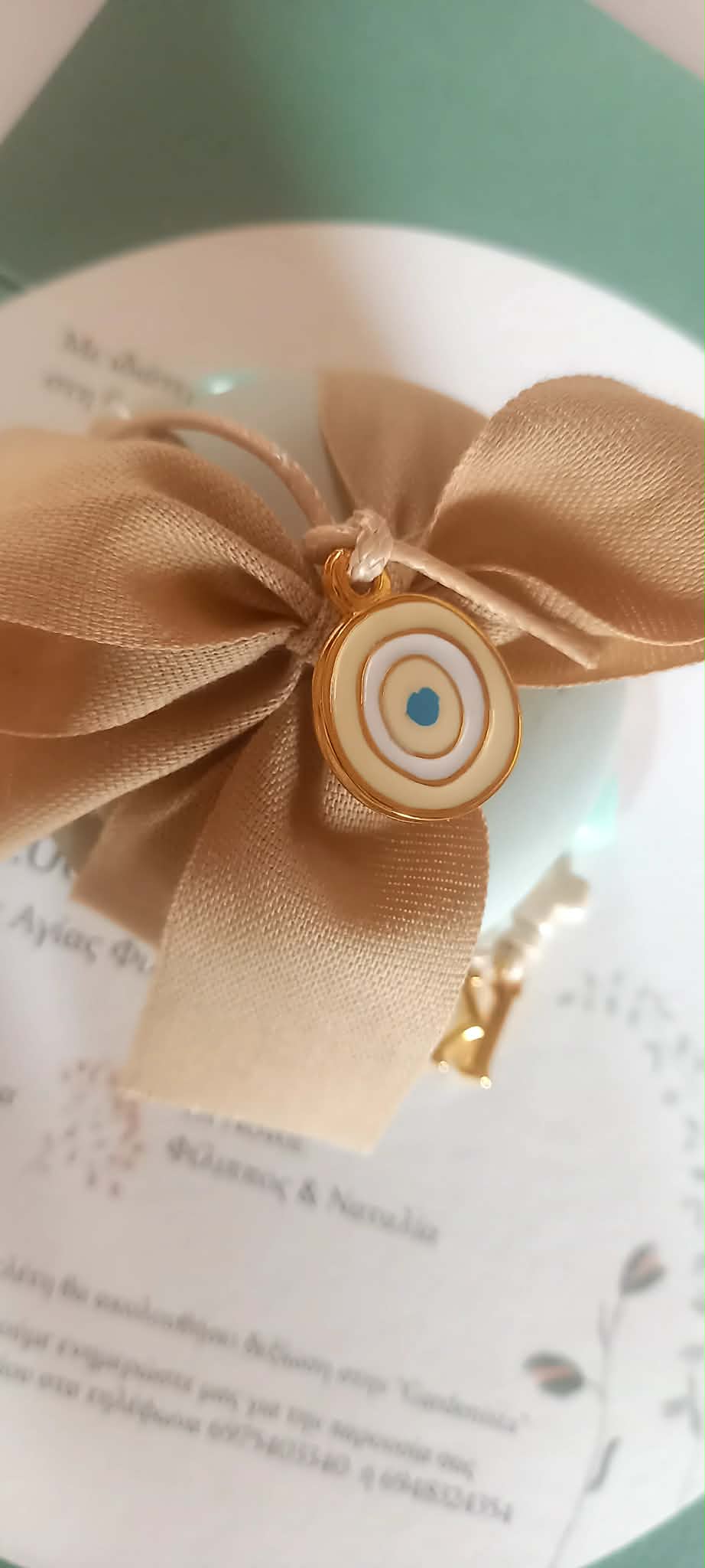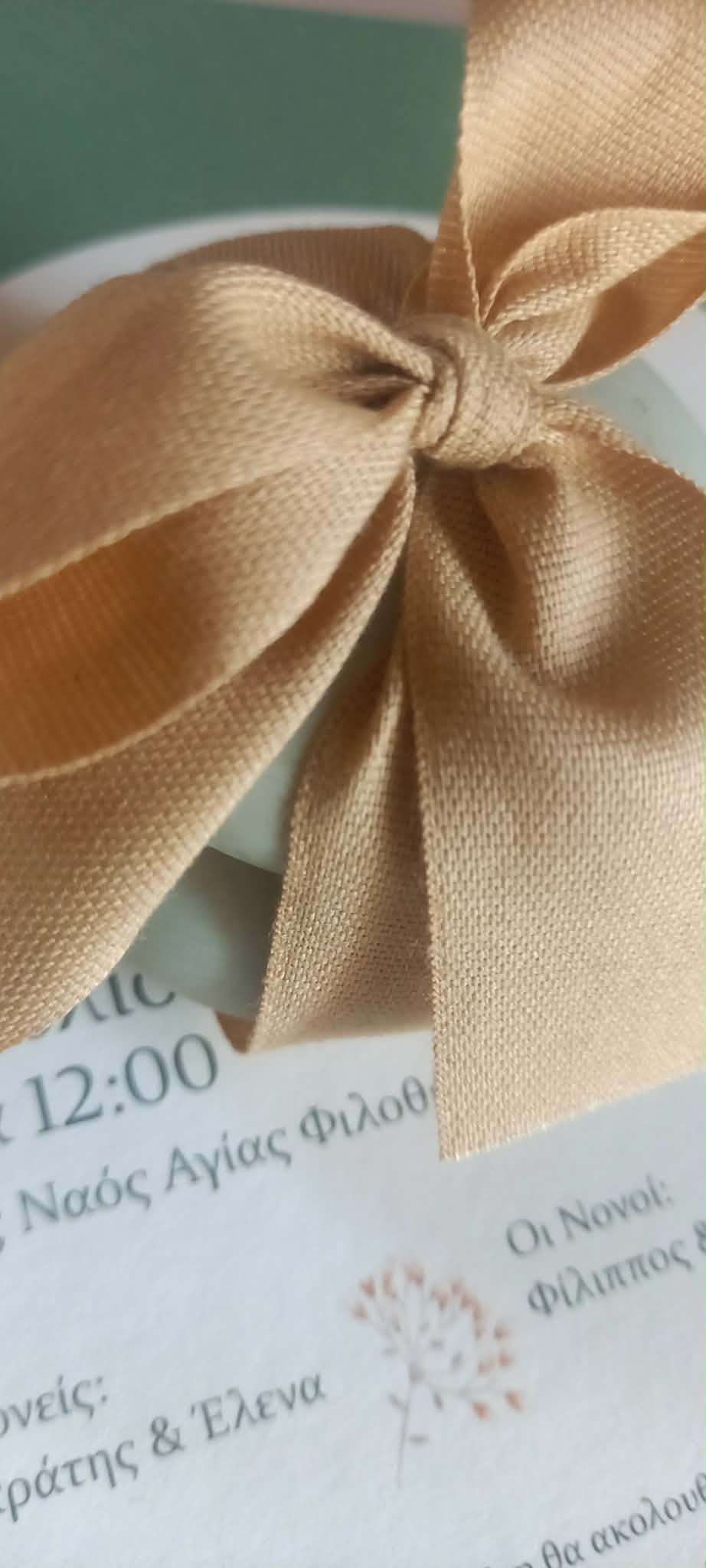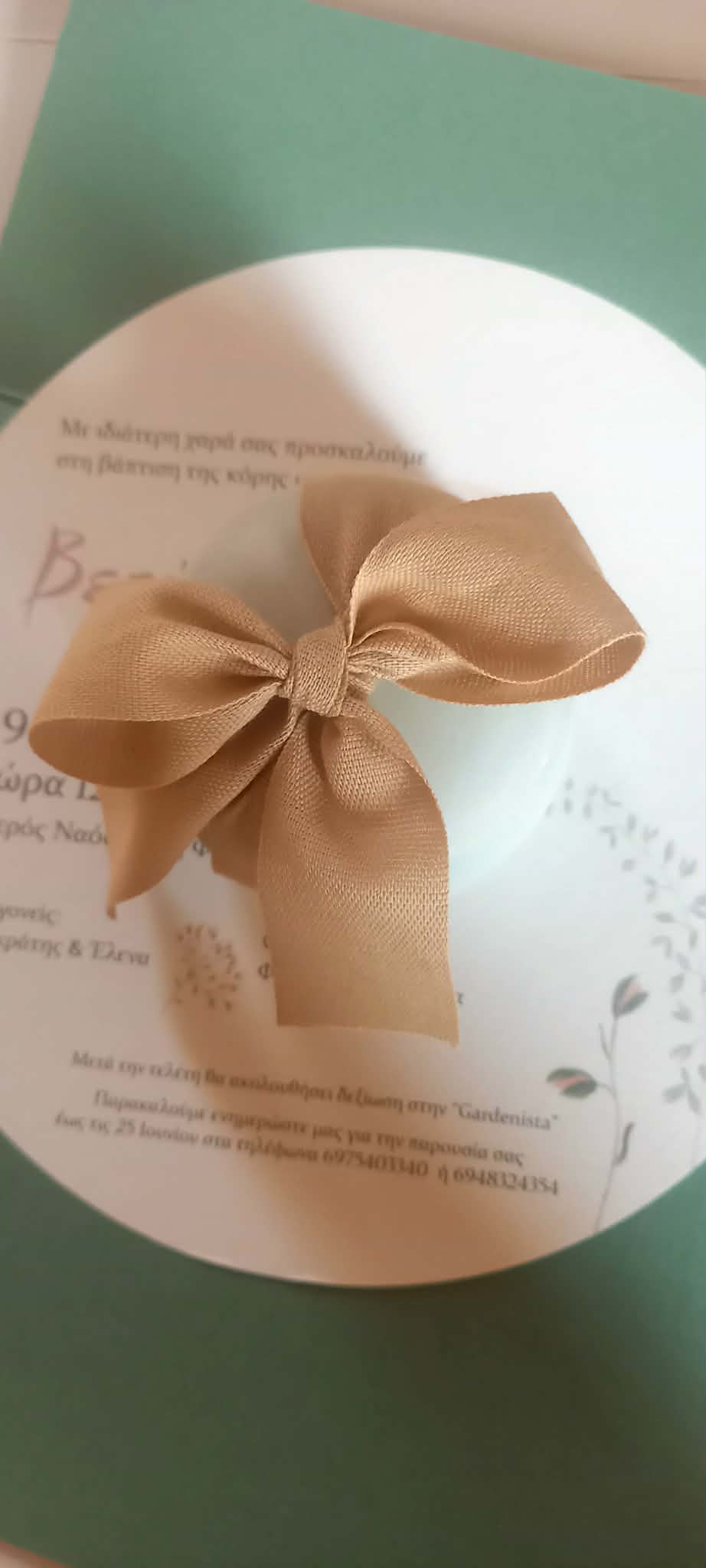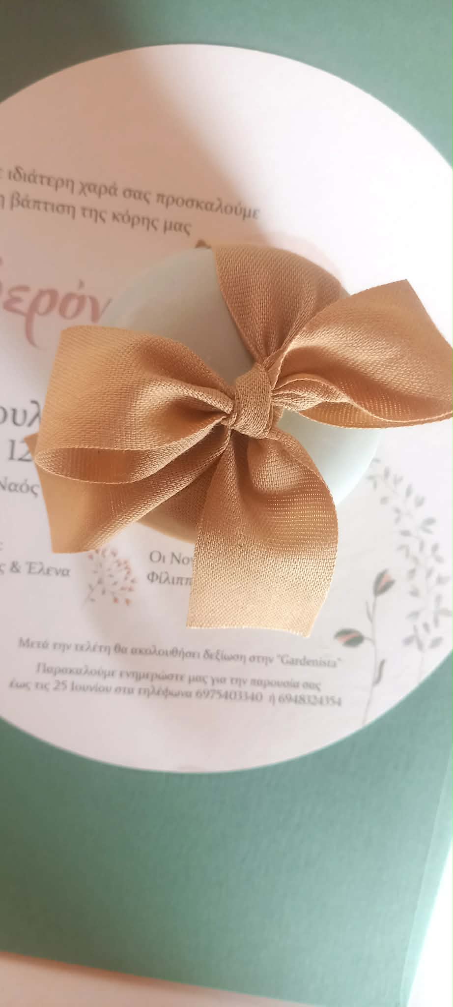 Μπομπονιέρα βάπτισης κεραμική μπιζουτιέρα σε γλυκό χρώμα μέντας, δεμένη σε φιόγκο με βαμβακερή κορδέλα σε μπεζ απόχρωση.