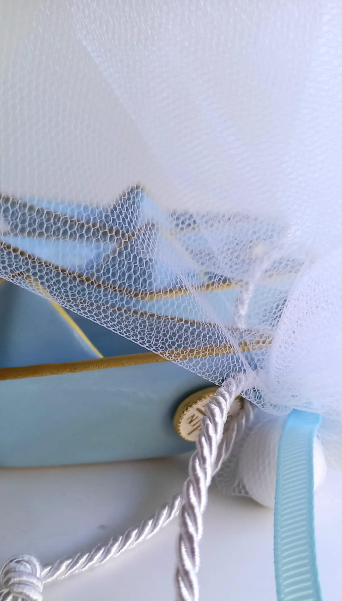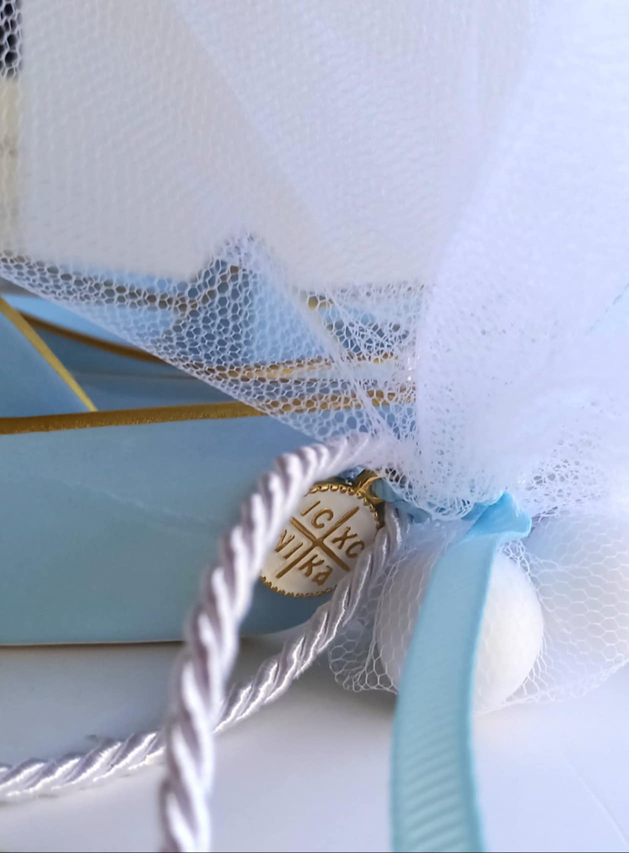 Μπομπονιέρα βάπτισης κεραμικό καράβι σε απόχρωση baby blue με χρυσό φινίρισμα, κορδόνι σε λευκό χρώμα, κωνσταντινάτο φλουρί με λευκό σμάλτο και το όνομα του παιδιού γραμμένο με χρυσό χρώμα.