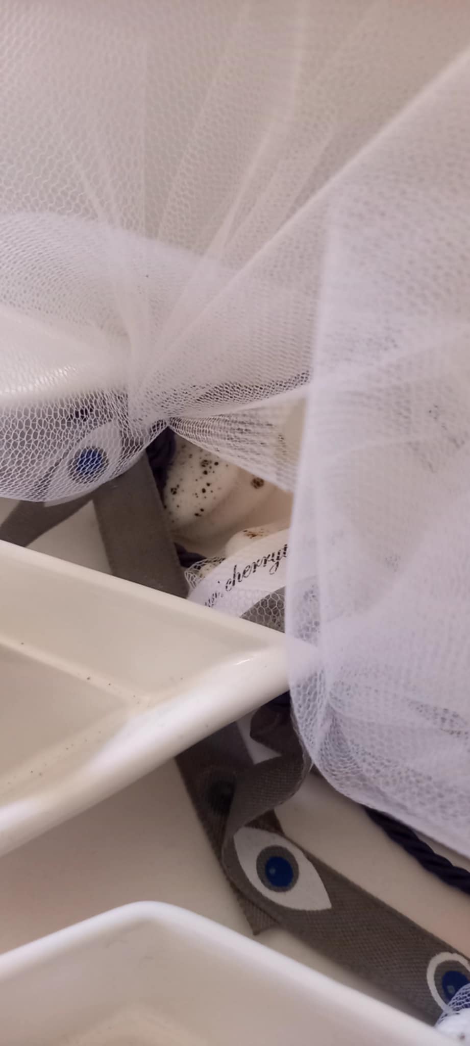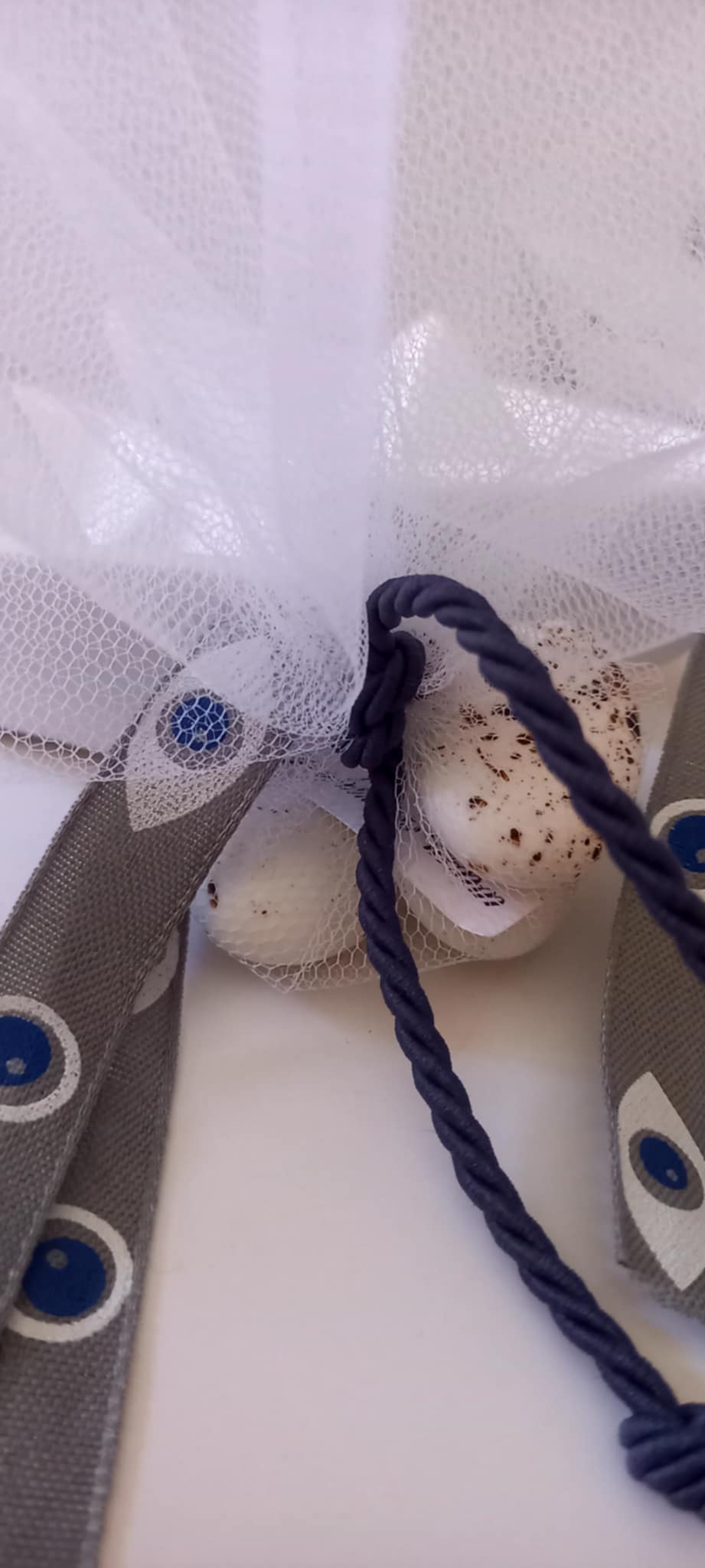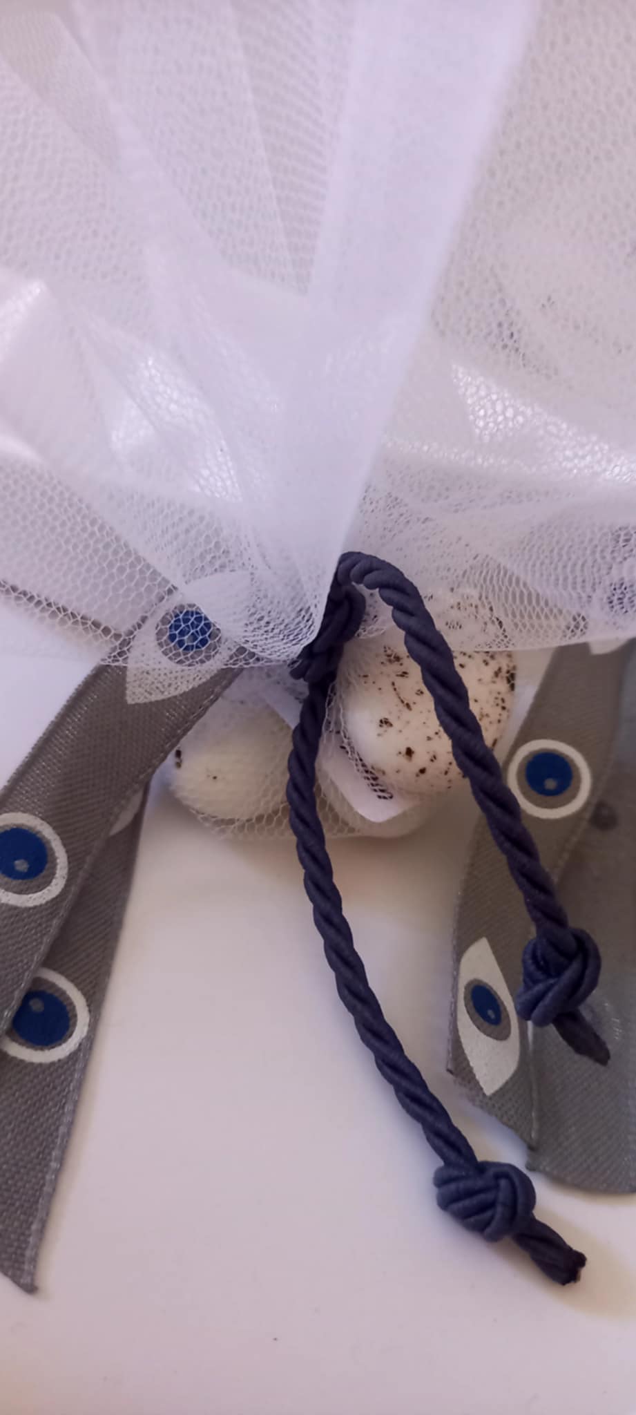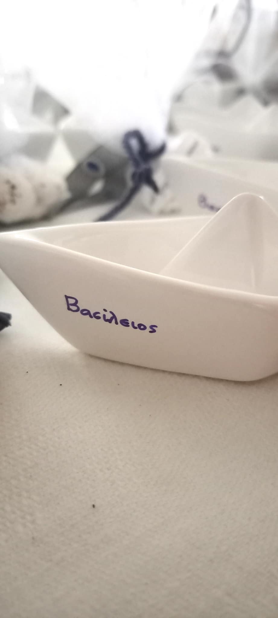 Χειροποίητη μπομπονιέρα βάπτισης καραβάκι σε λευκό χρώμα με το όνομα του παιδιού γραμμένο χειρόγραφα με μπλε χρώμα, κορδέλα γκρο με μάτια και στριφτό σχοινί σε απόχρωση navy blue.