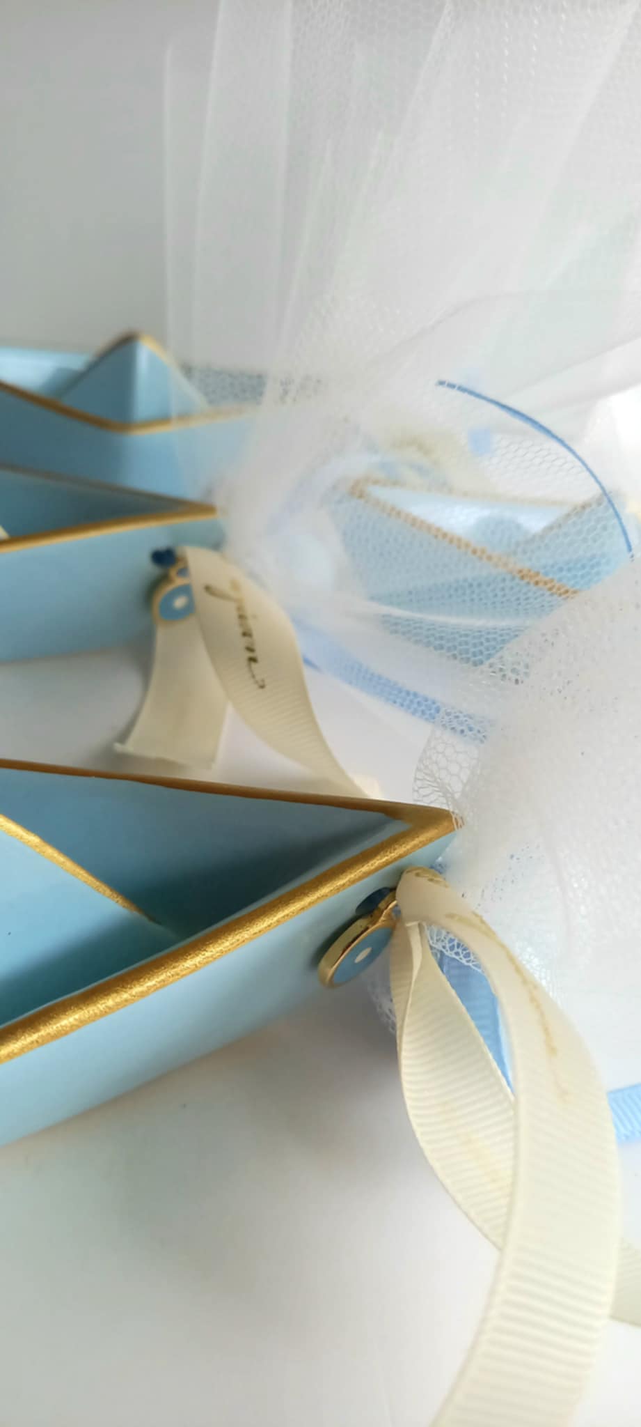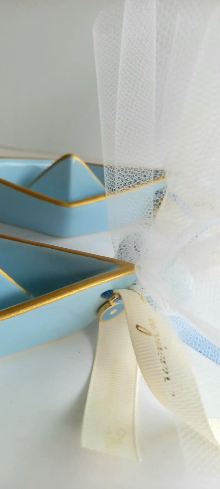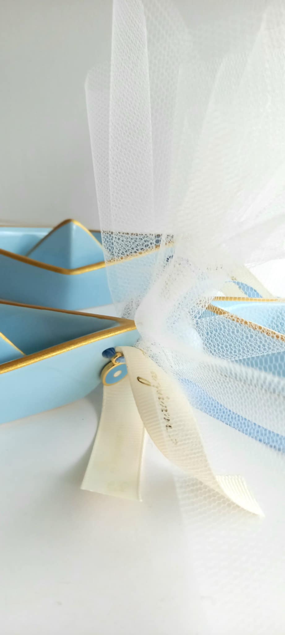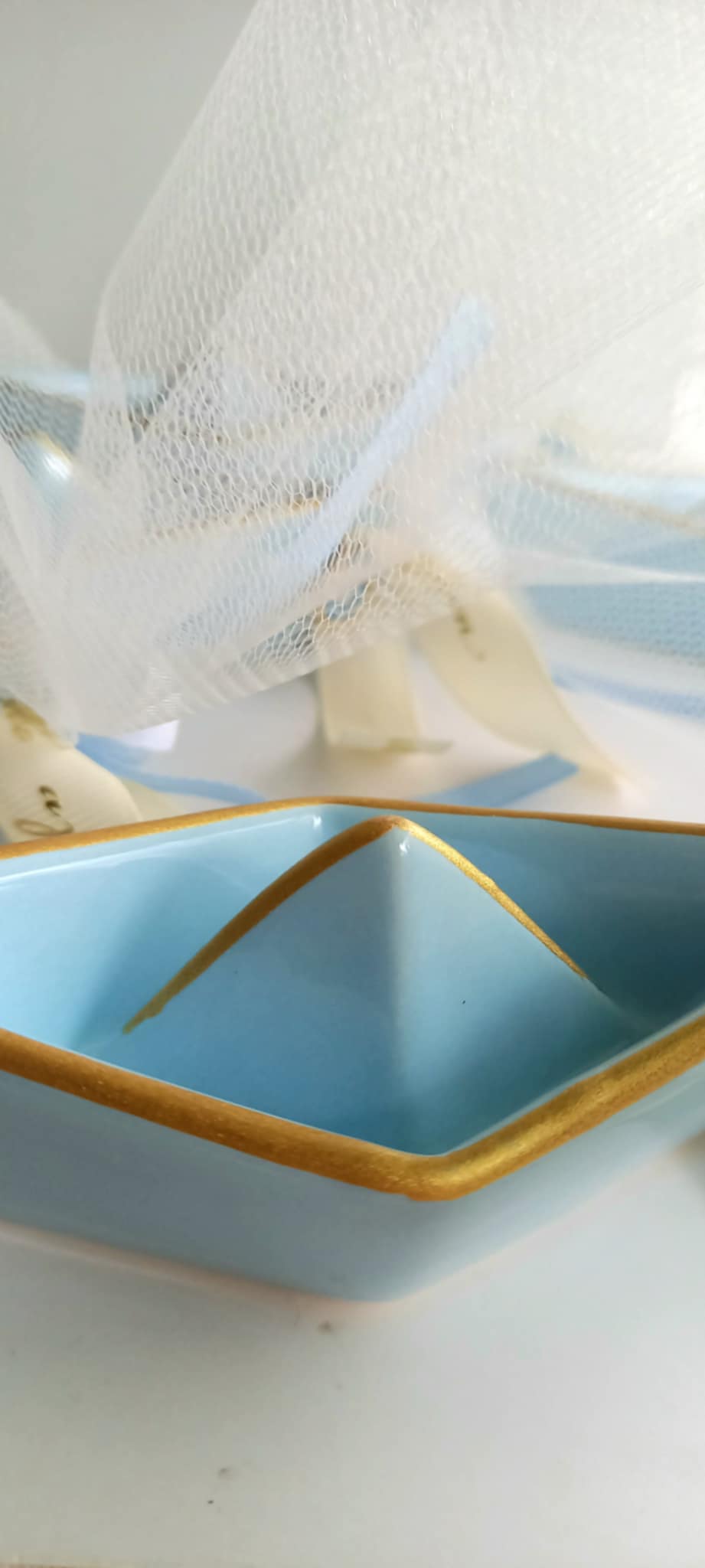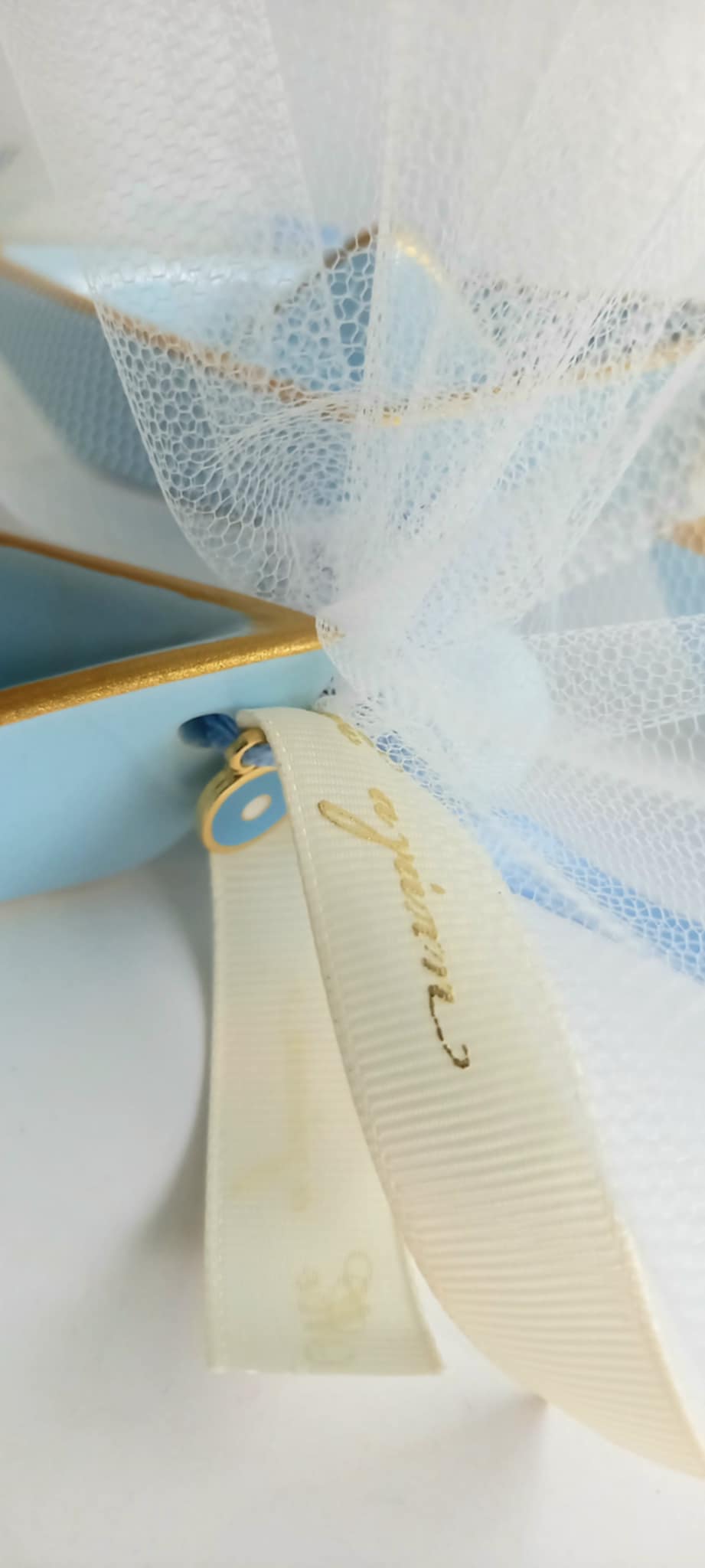 Μπομπονιέρα βάπτισης κεραμικό καραβάκι σε απόχρωση baby blue με κορδέλα με χρυσοτυπία "με αγάπη", λεπτή γαλάζια γκρο κορδέλα και επιχρυσωμένο ματάκι με γαλάζιο σμάλτο.