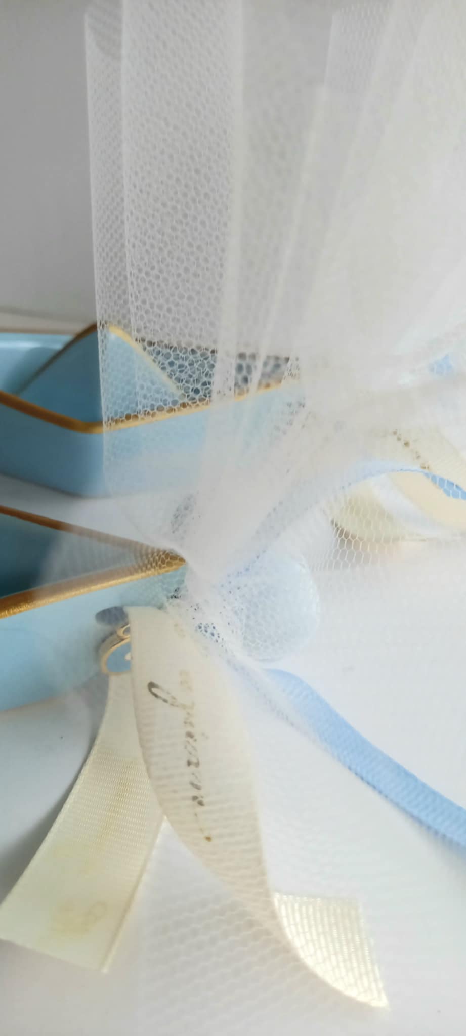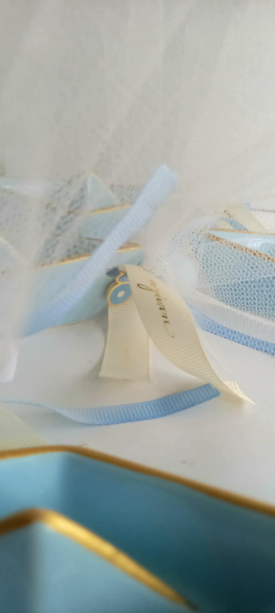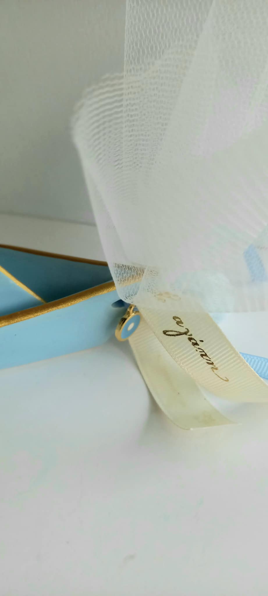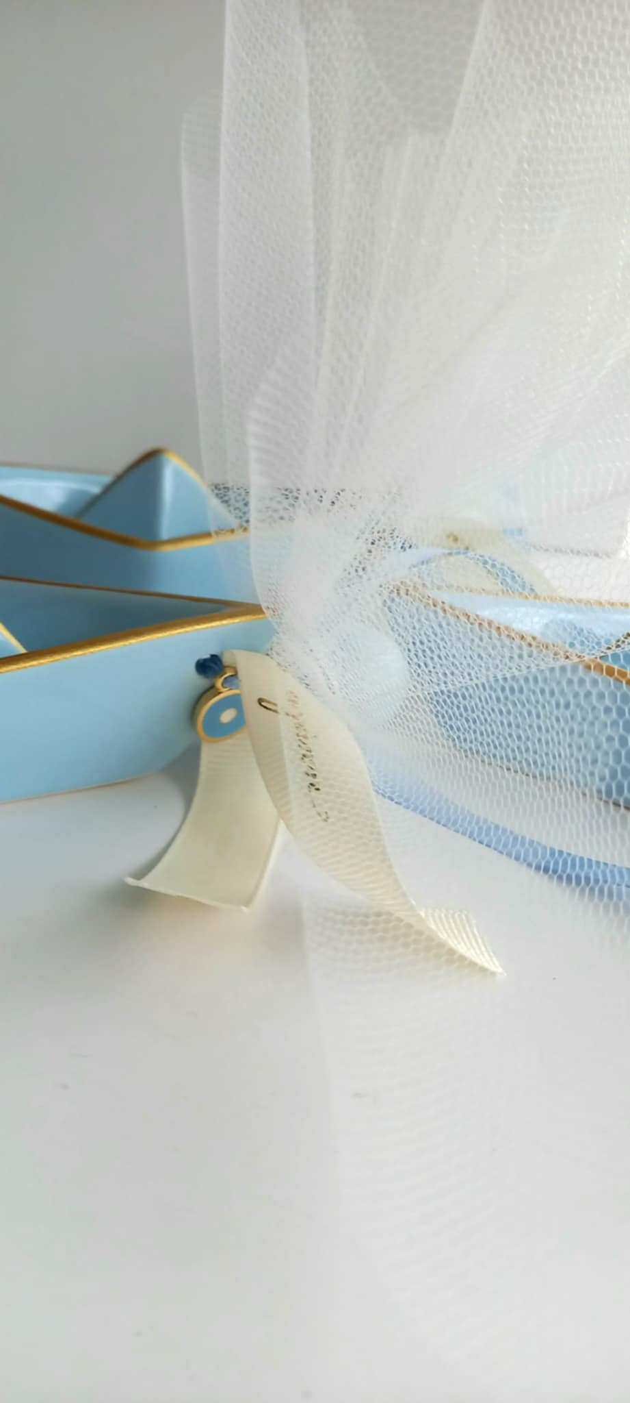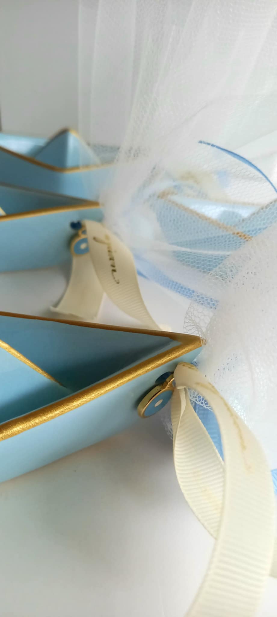 Μπομπονιέρα βάπτισης κεραμικό καραβάκι σε απόχρωση baby blue με κορδέλα με χρυσοτυπία "με αγάπη", λεπτή γαλάζια γκρο κορδέλα και επιχρυσωμένο ματάκι με γαλάζιο σμάλτο.