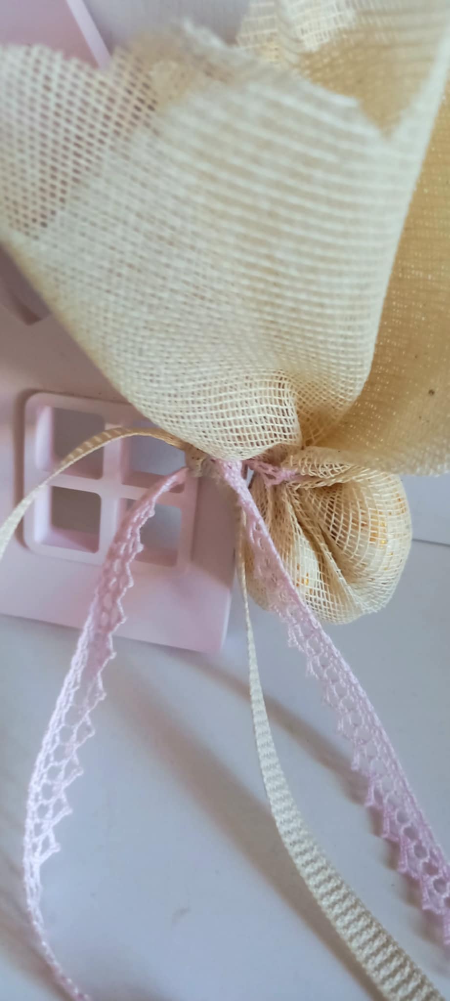 Περιλαβάνει τρία κουφέτα crispy Χατζηγιαννάκη τυλιγμένα σε γάζα και δεμένα με κορδέλες σε αποχρώσεις του ροζ.