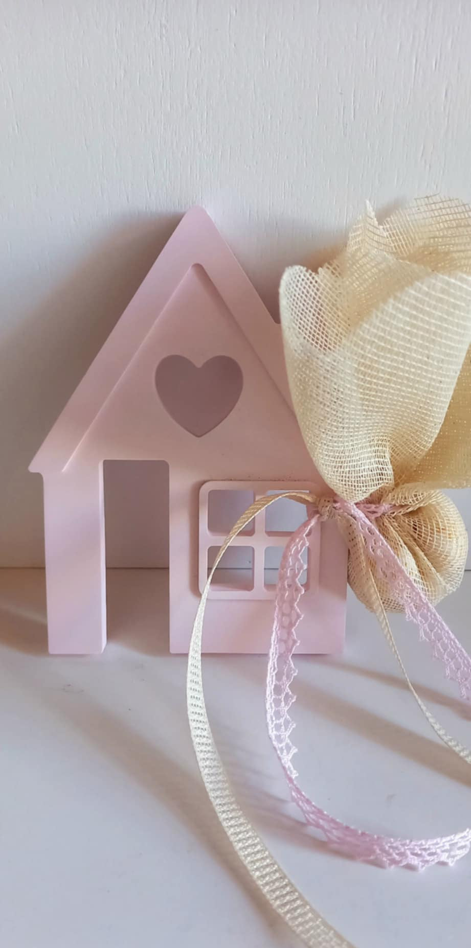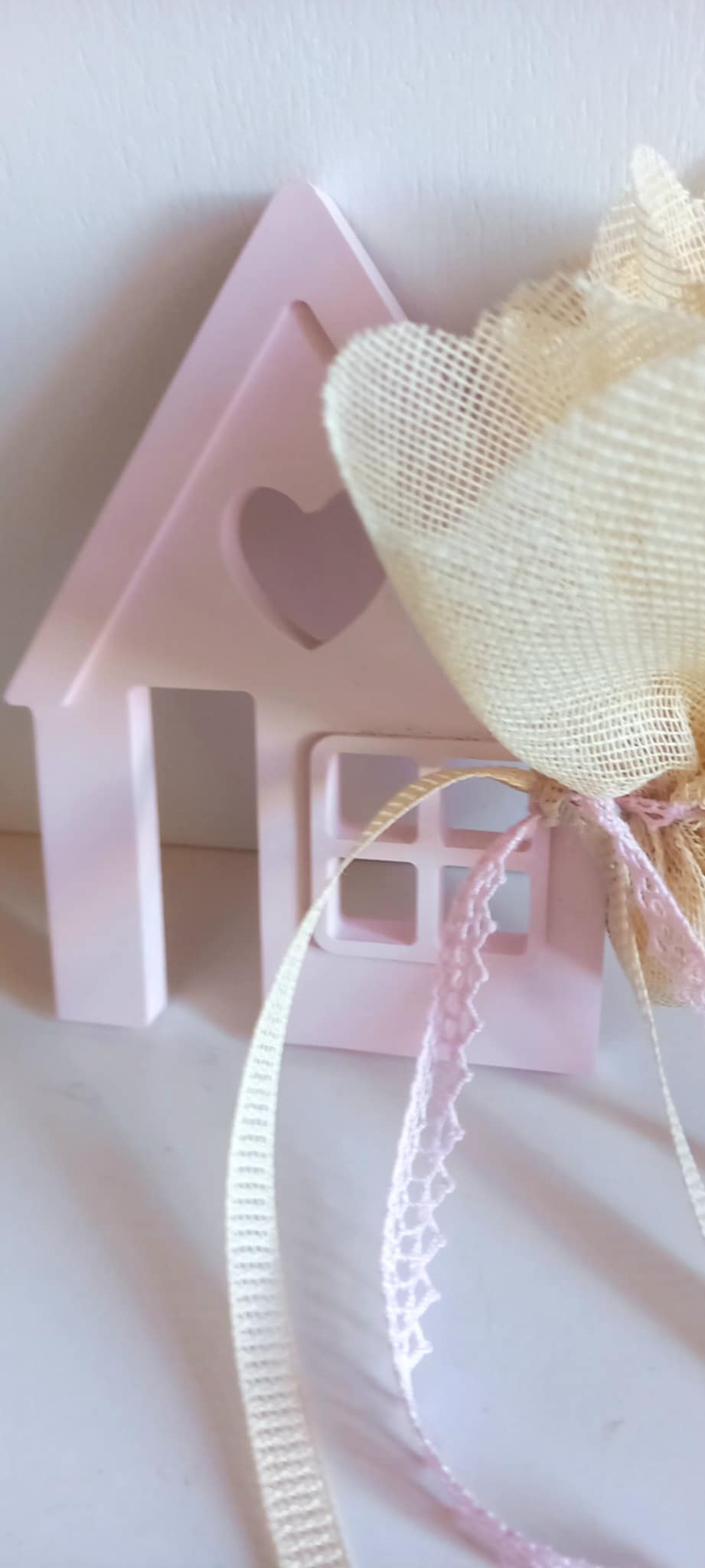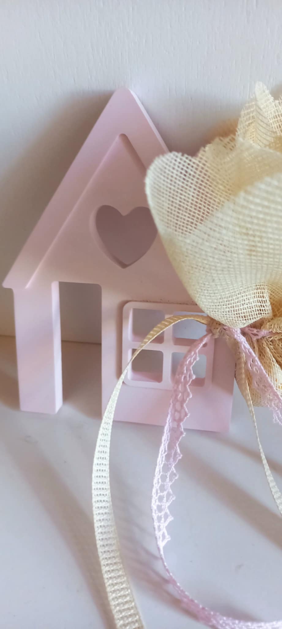 Μπομπονιέρα βάπτισης κεραμικό παραμυθνέιο σπιτάκι με καρδούλα σε απόχρωση baby pink.