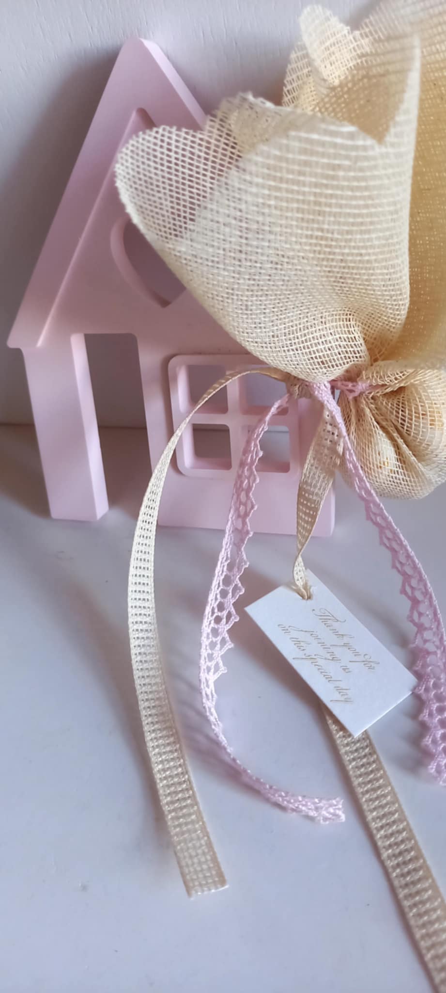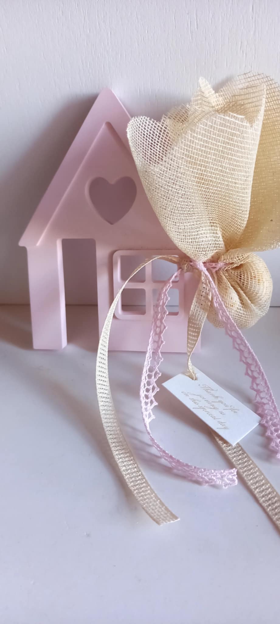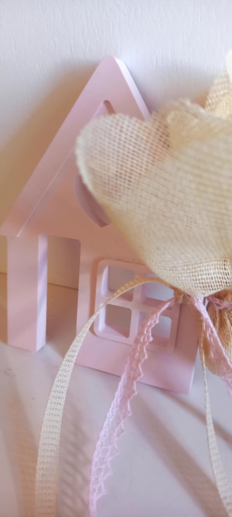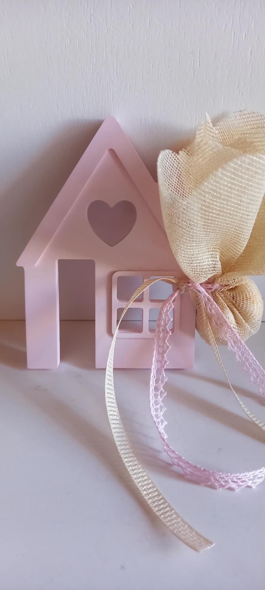 Μπομπονιέρα βάπτισης κεραμικό παραμυθνέιο σπιτάκι με καρδούλα σε απόχρωση baby pink.