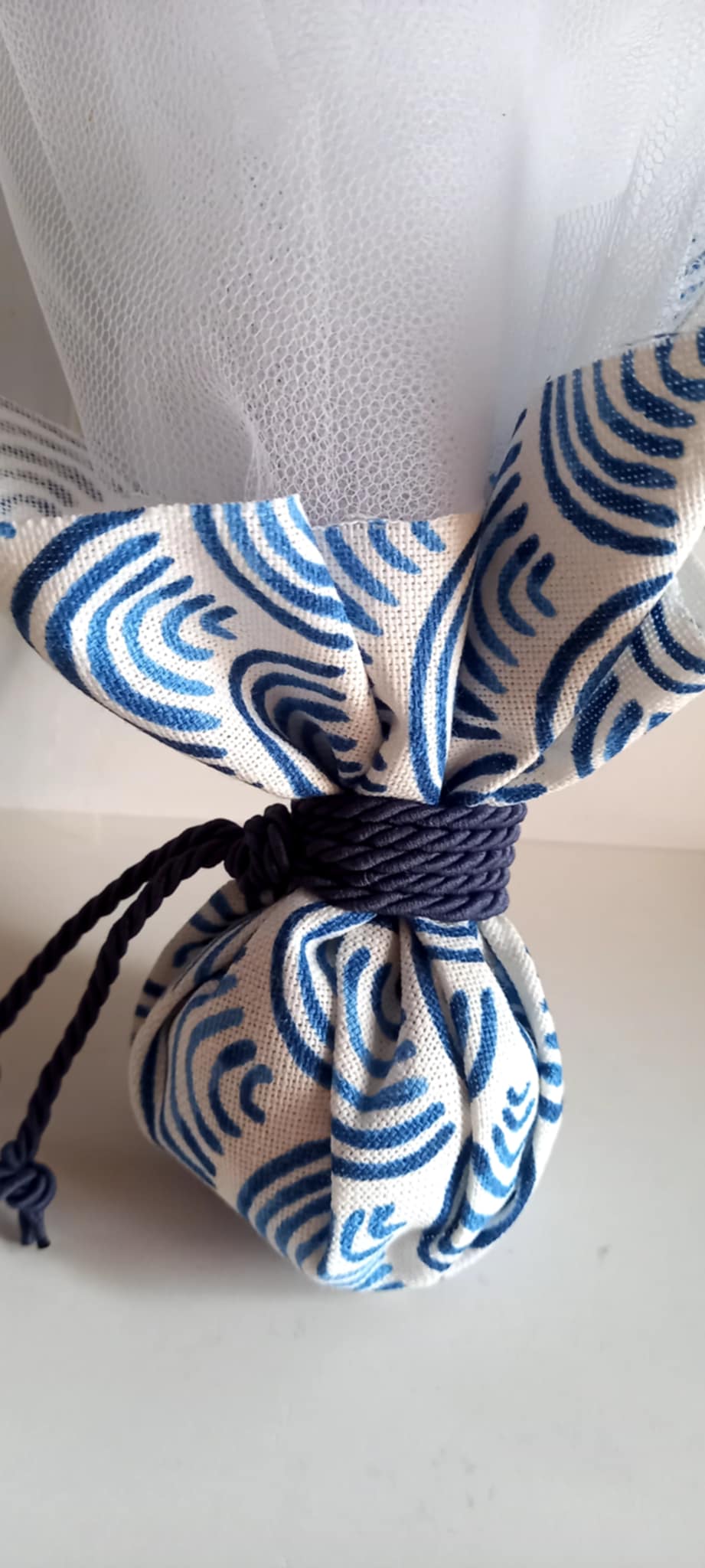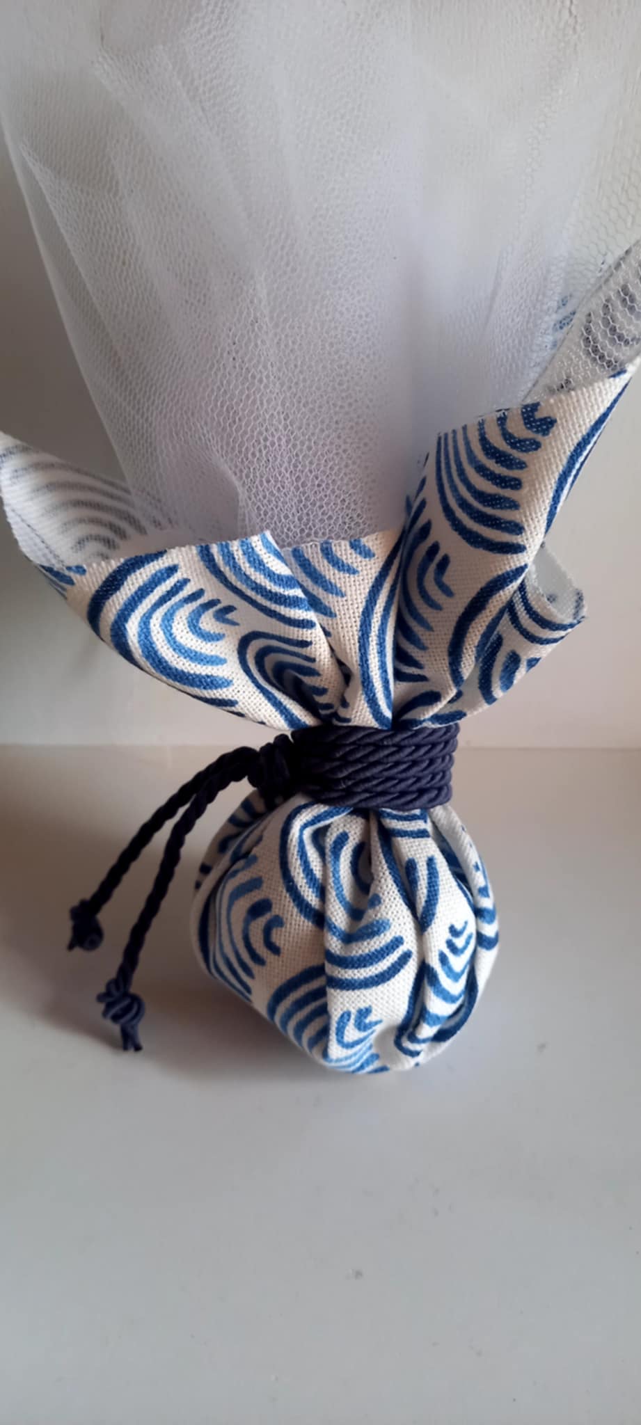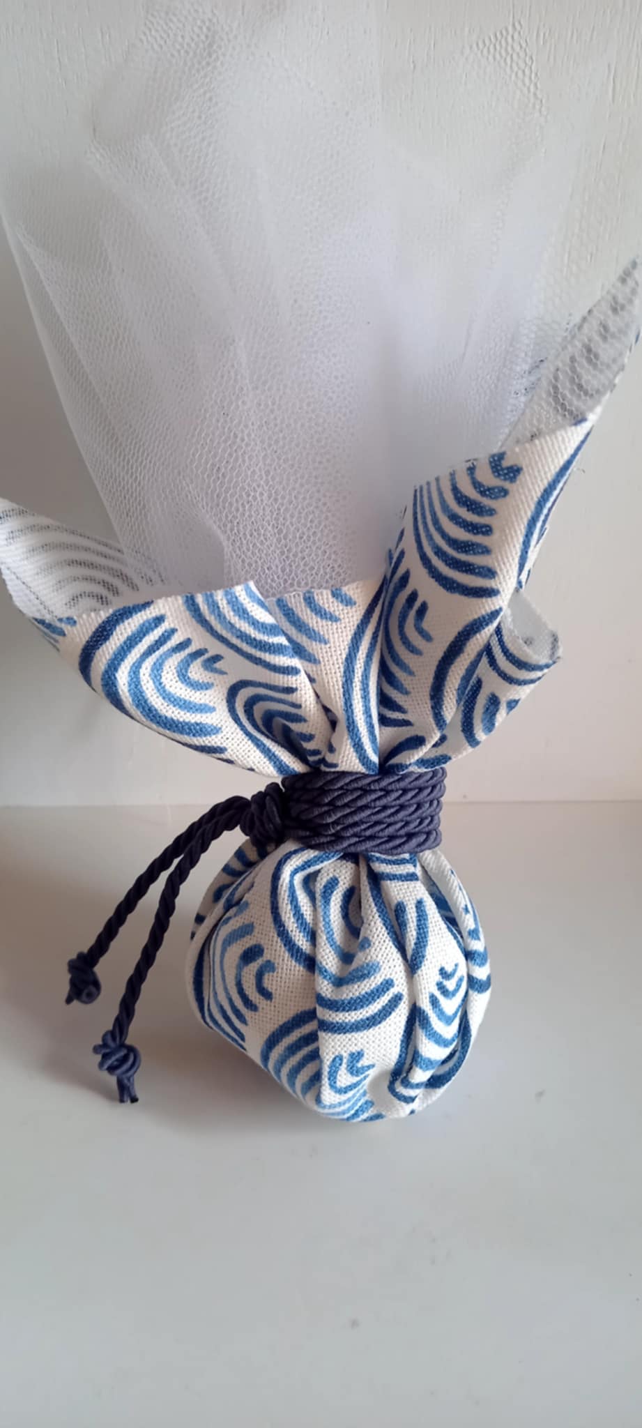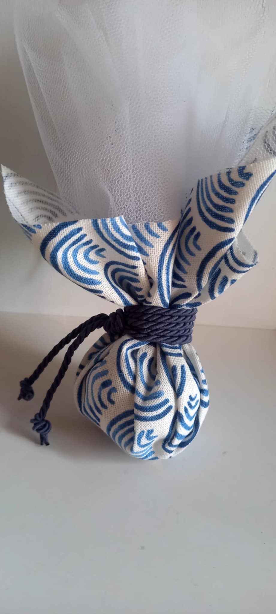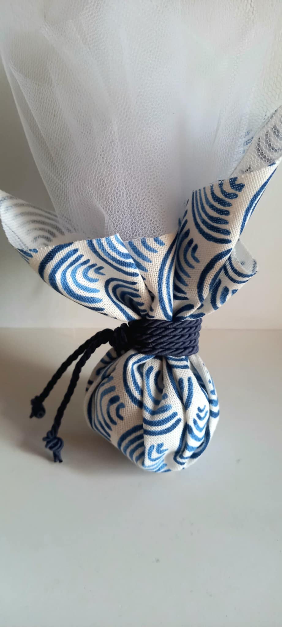 Μπομπονιέρα βάπτισης με βαμβακερό ύφασμα με μπλε μοτίβο, στριφτό κορδόνι σε απόχρωση navy blue και λευκό τούλι.