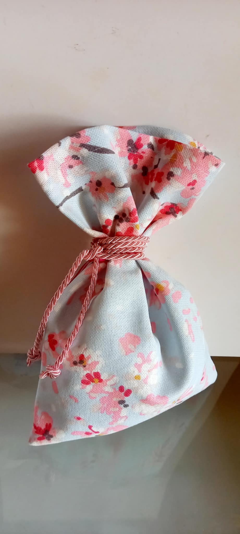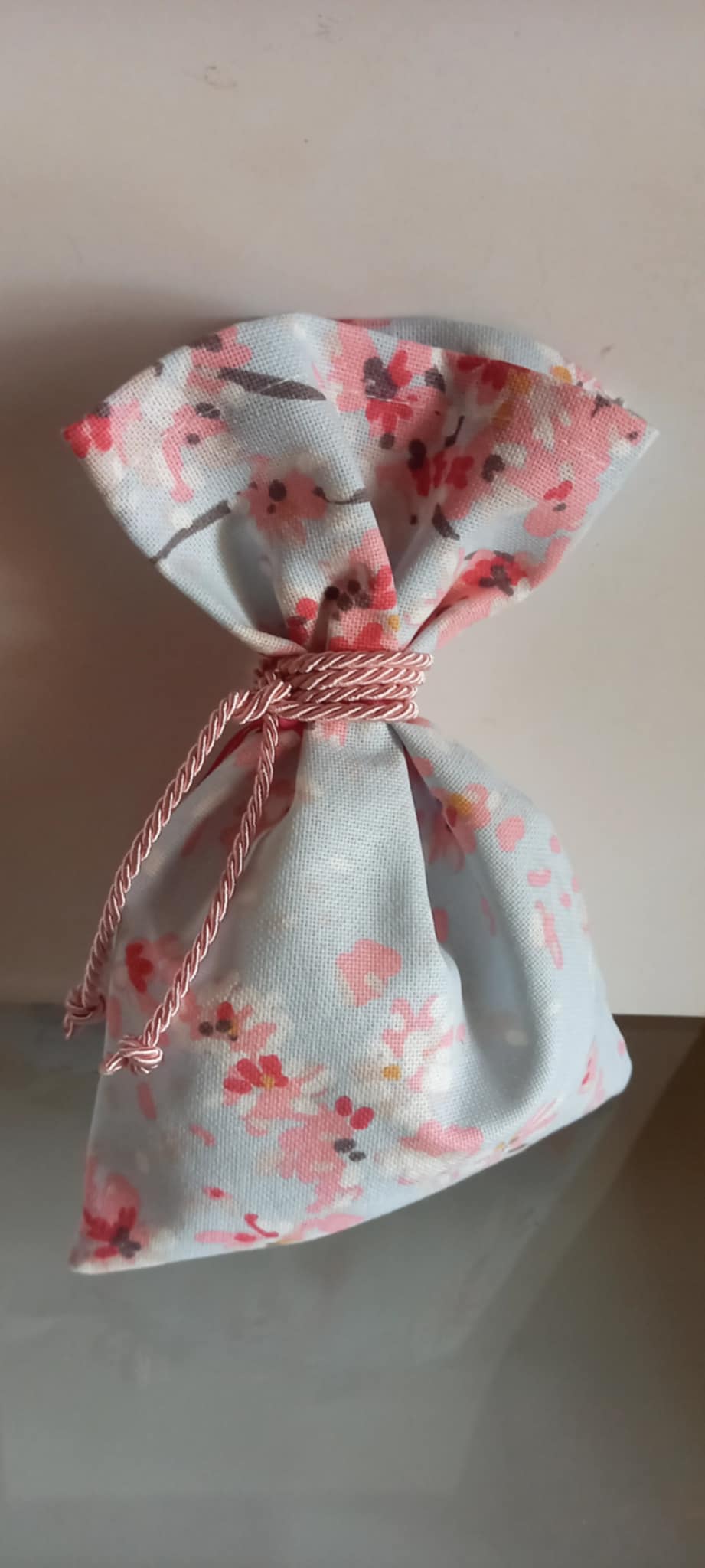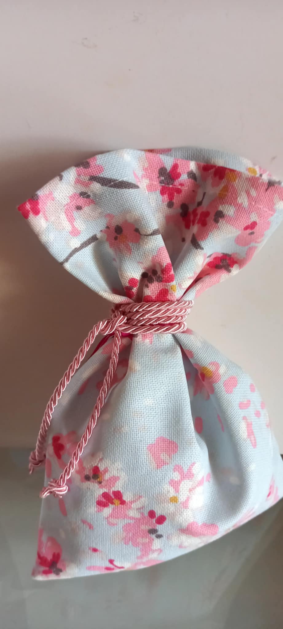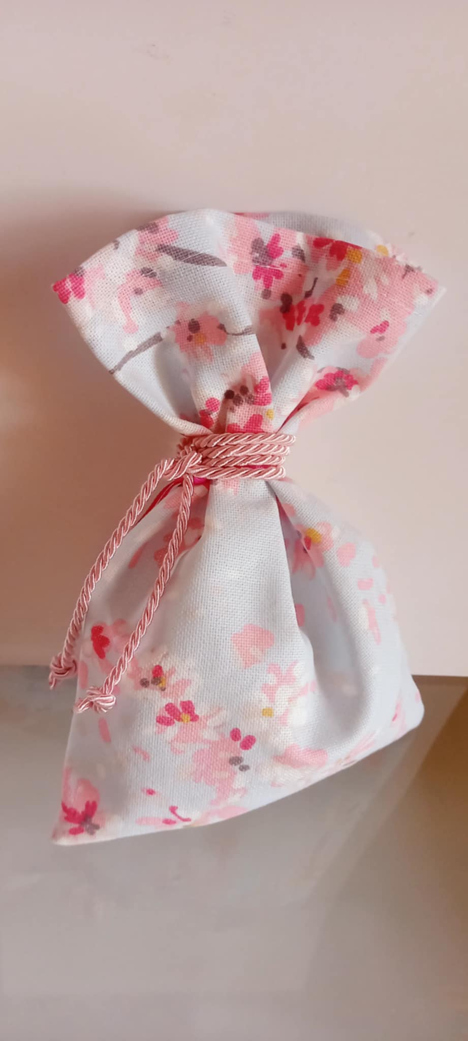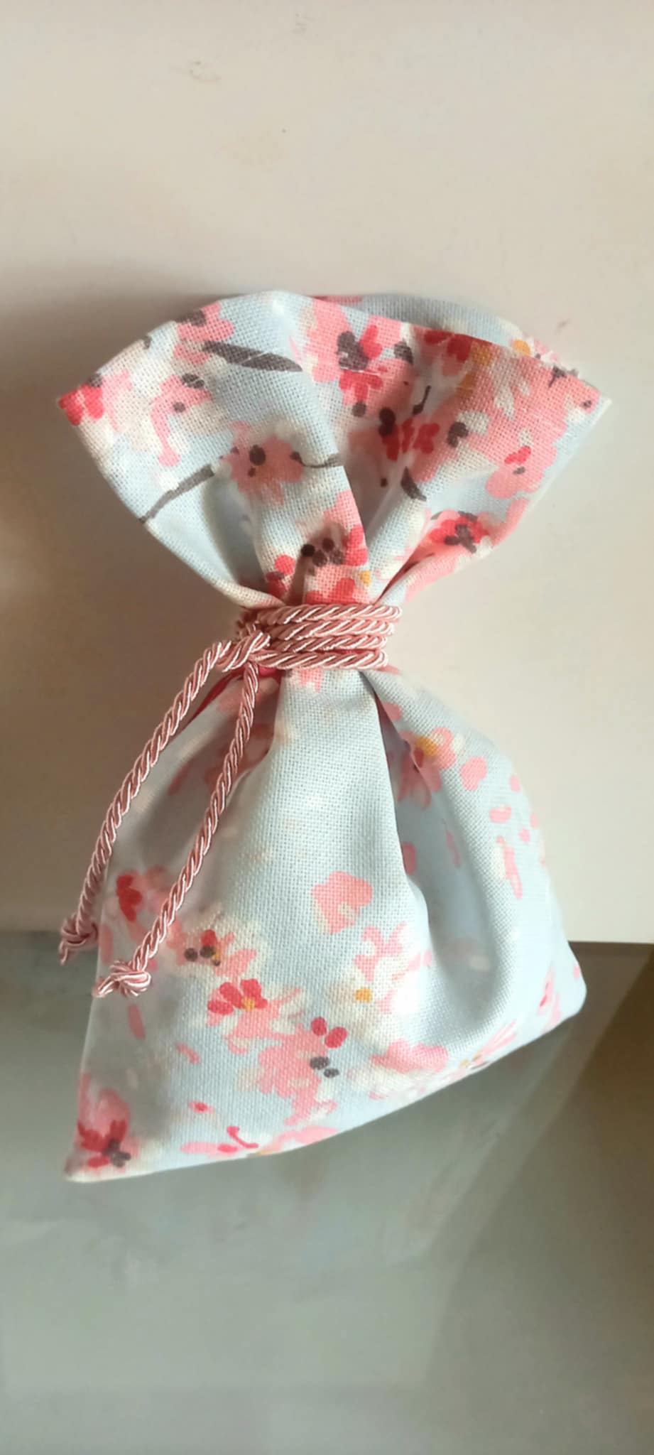 Μπομπονιέρα βάπτισης βαμβακερό πουγκί με φλοράλ μοτίβο σε παλ αποχρώσεις, δεμένη με στριφτό κορδόνι σε απόχρωση σάπιου μήλου.