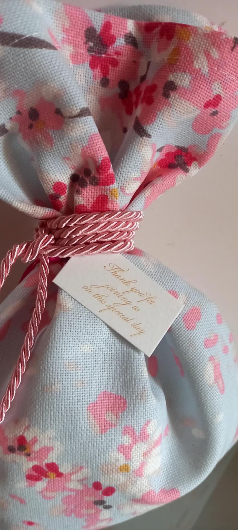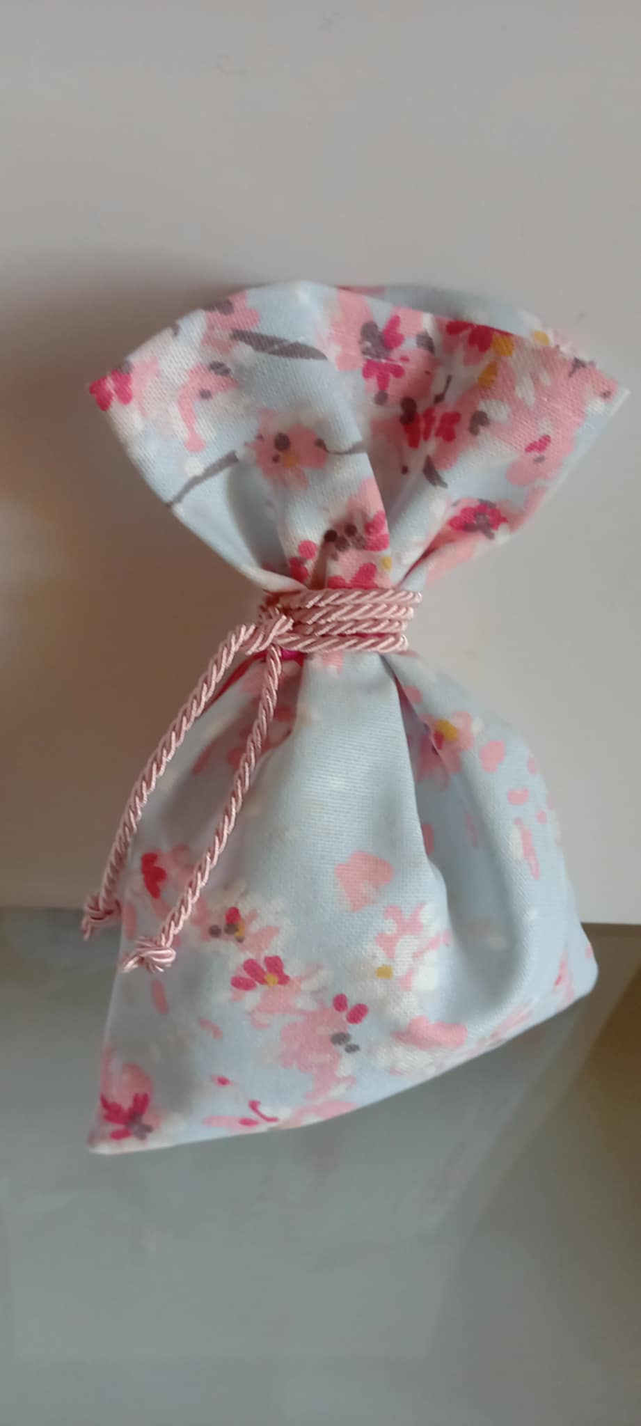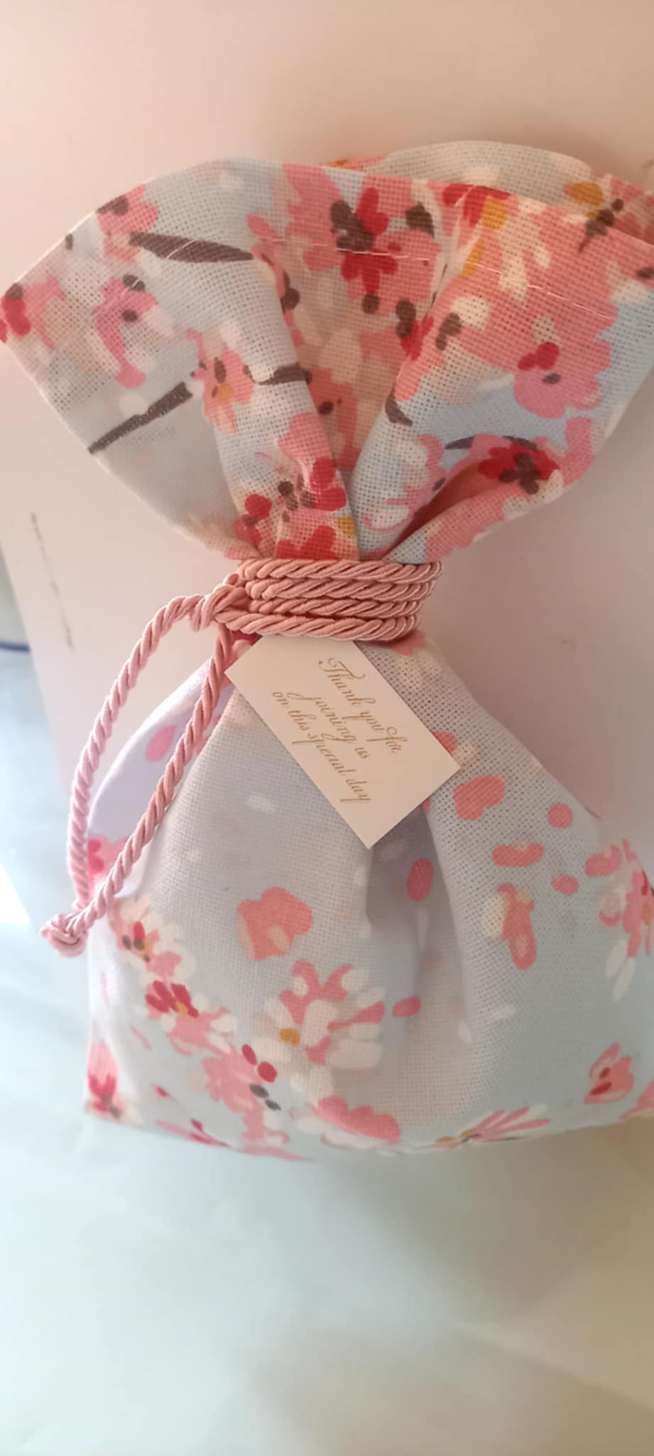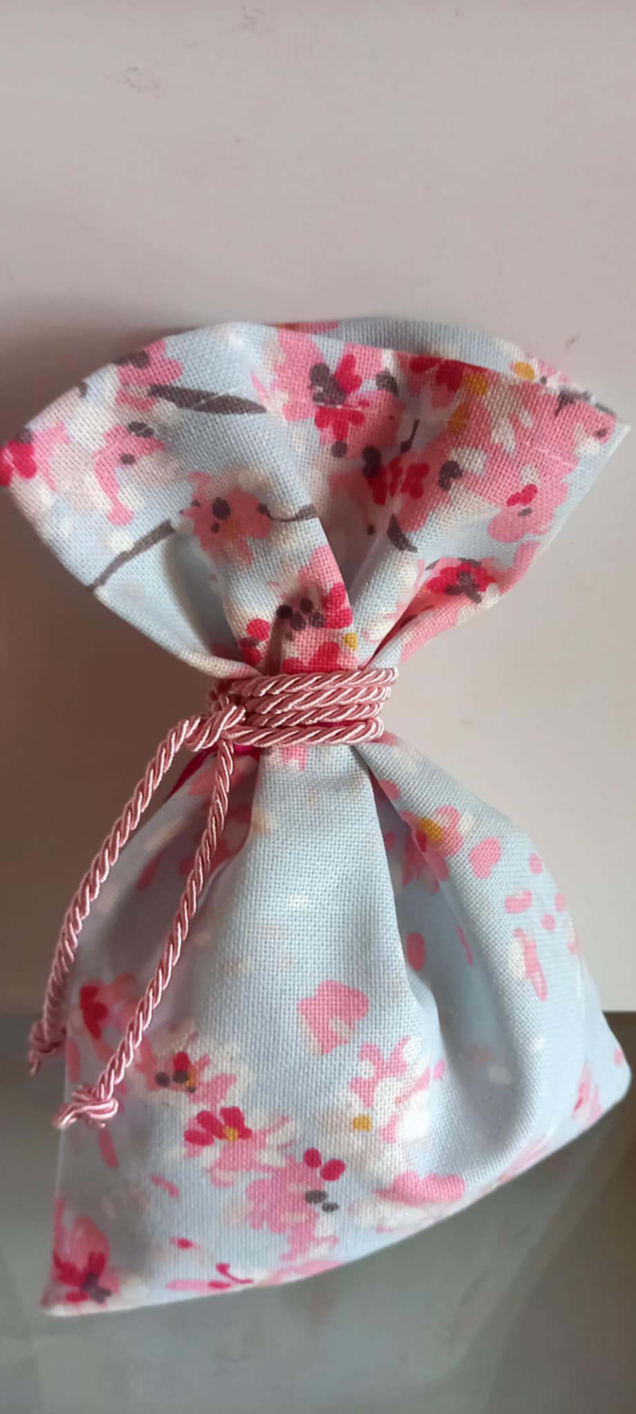 Μπομπονιέρα βάπτισης βαμβακερό πουγκί με φλοράλ μοτίβο σε παλ αποχρώσεις, δεμένη με στριφτό κορδόνι σε απόχρωση σάπιου μήλου.