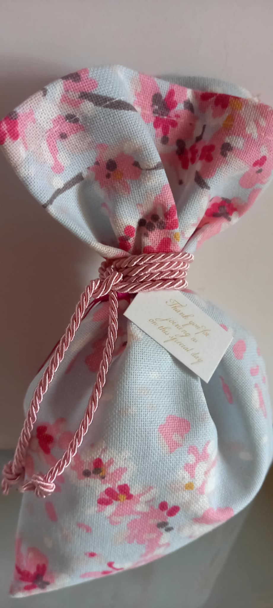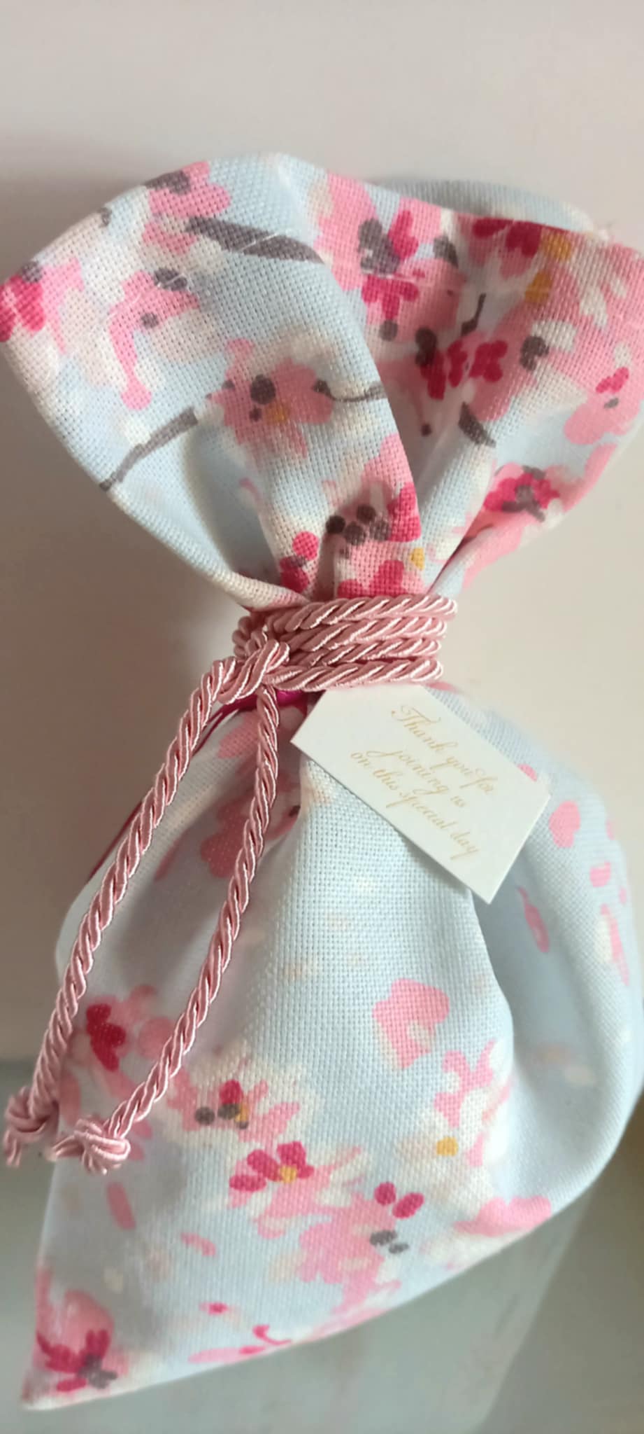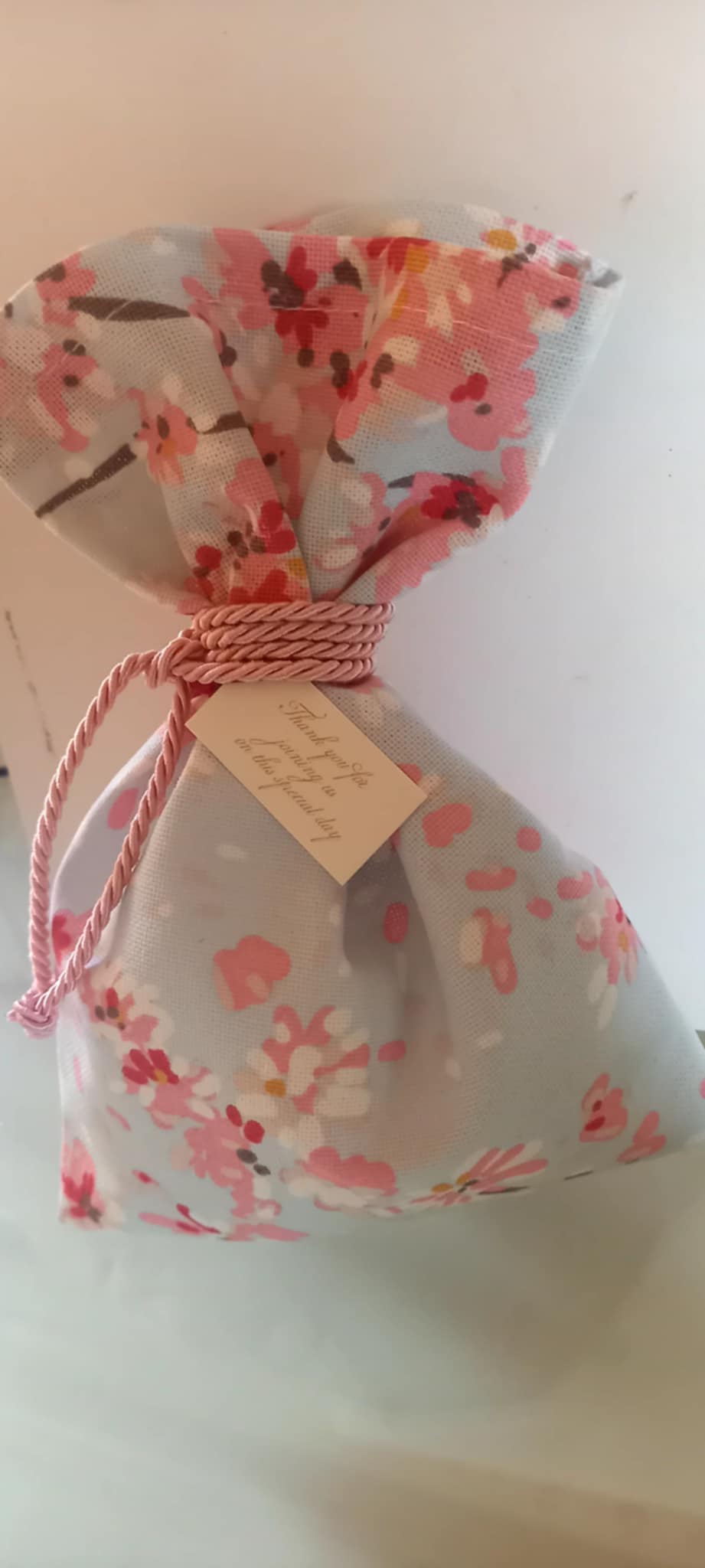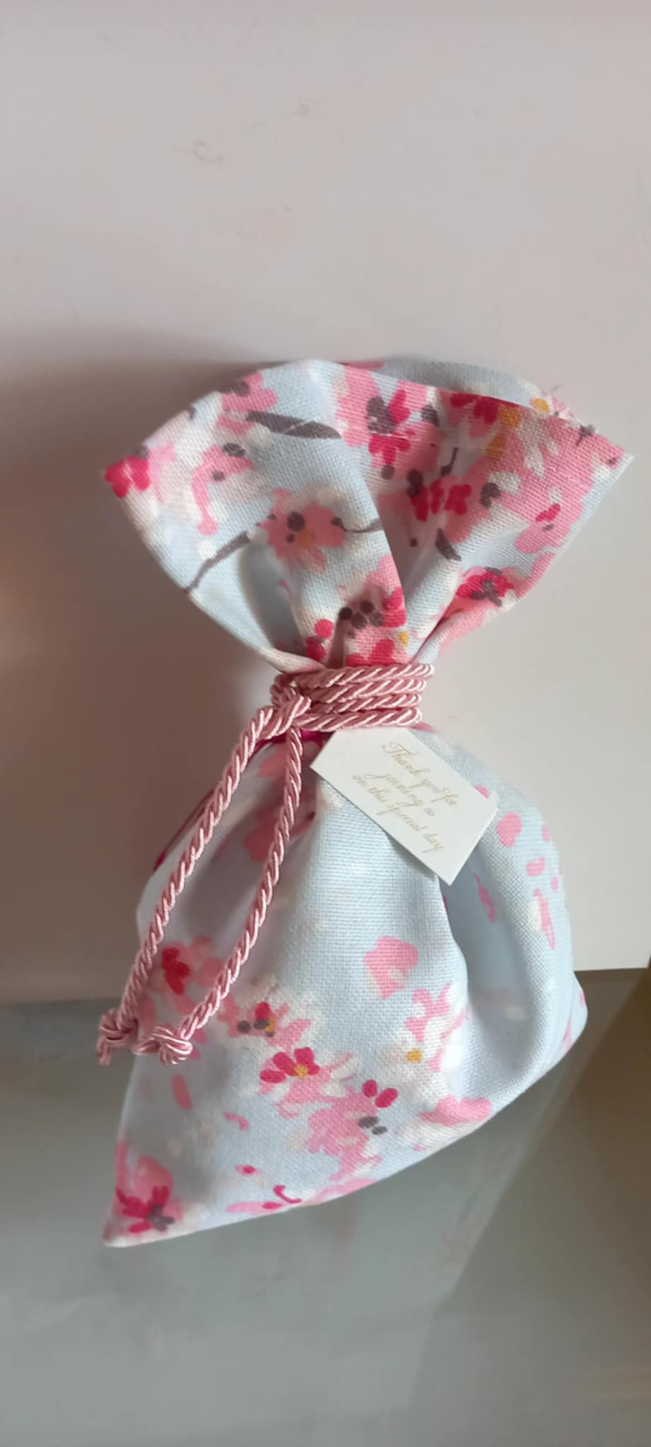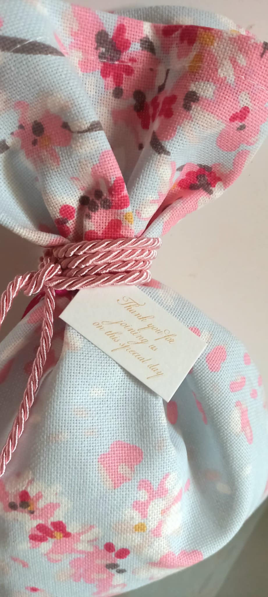 Μπομπονιέρα βάπτισης βαμβακερό πουγκί με φλοράλ μοτίβο σε παλ αποχρώσεις, δεμένη με στριφτό κορδόνι σε απόχρωση σάπιου μήλου.