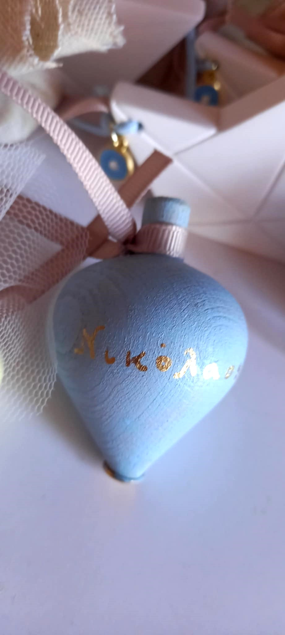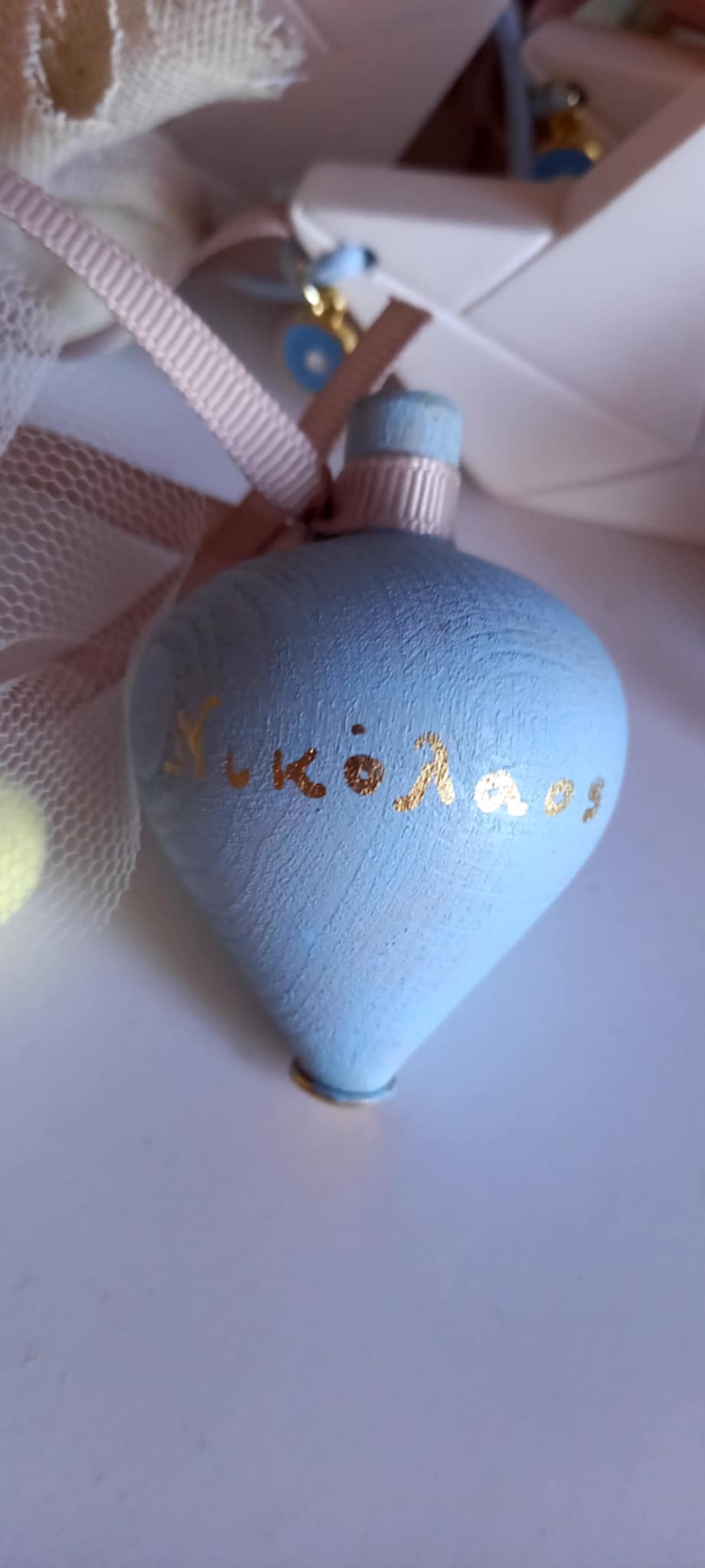 Μπομπονιέρα βάπτισης ξύλινη σβούρα σε απόχρωση baby blue με κορδέλες σε μπεζ χρώμα και το όνομα του παιδιού γραμμένο με χρυσό μελάνι.