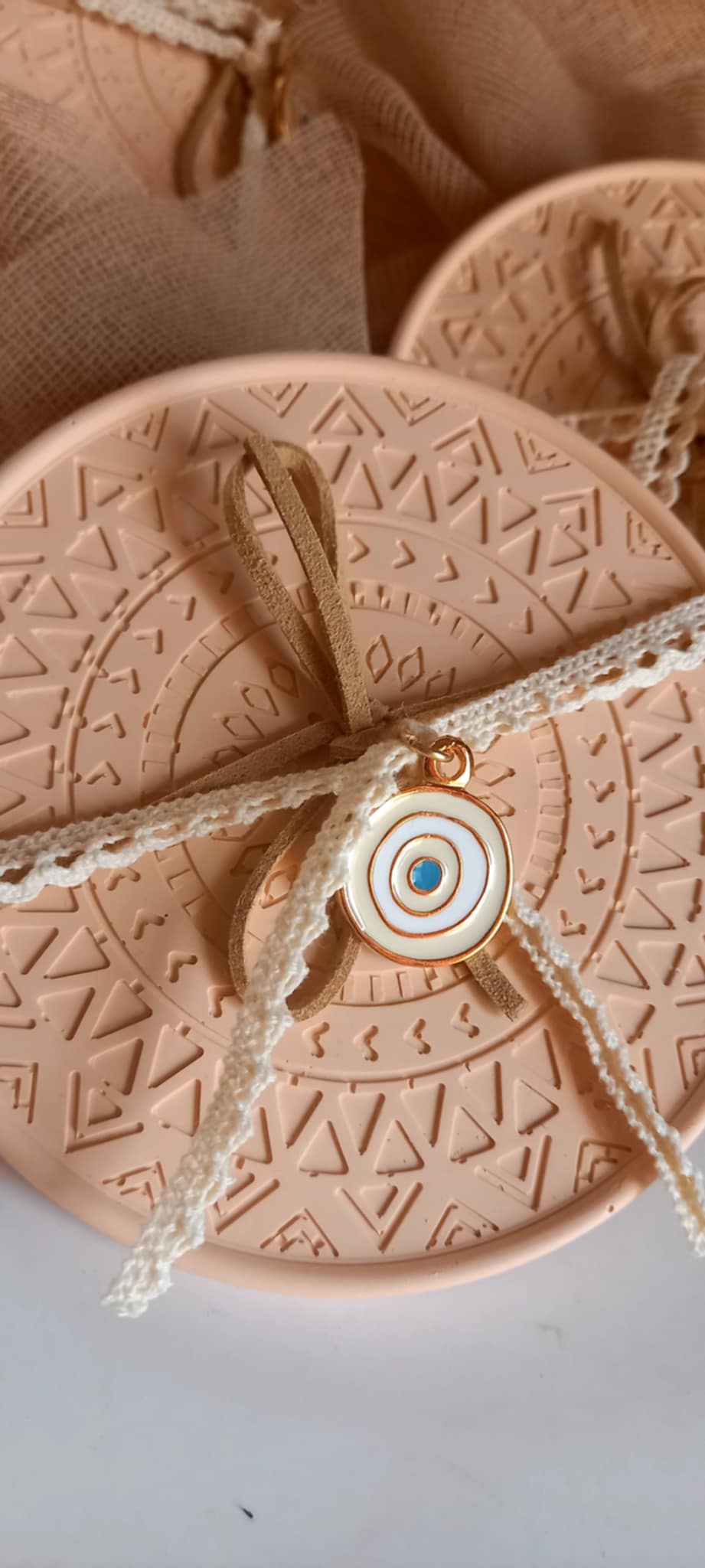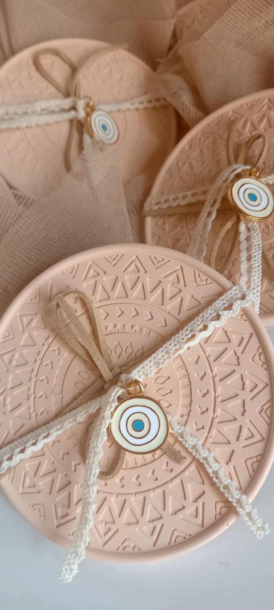 Μπομπονιέρα βάπτισης σουβέρ με υφή πορσελάνης σε στυλ boho, σε απαλό σομόν χρώμα, με επιχρυσωμένο μάτι με σμάλτο.