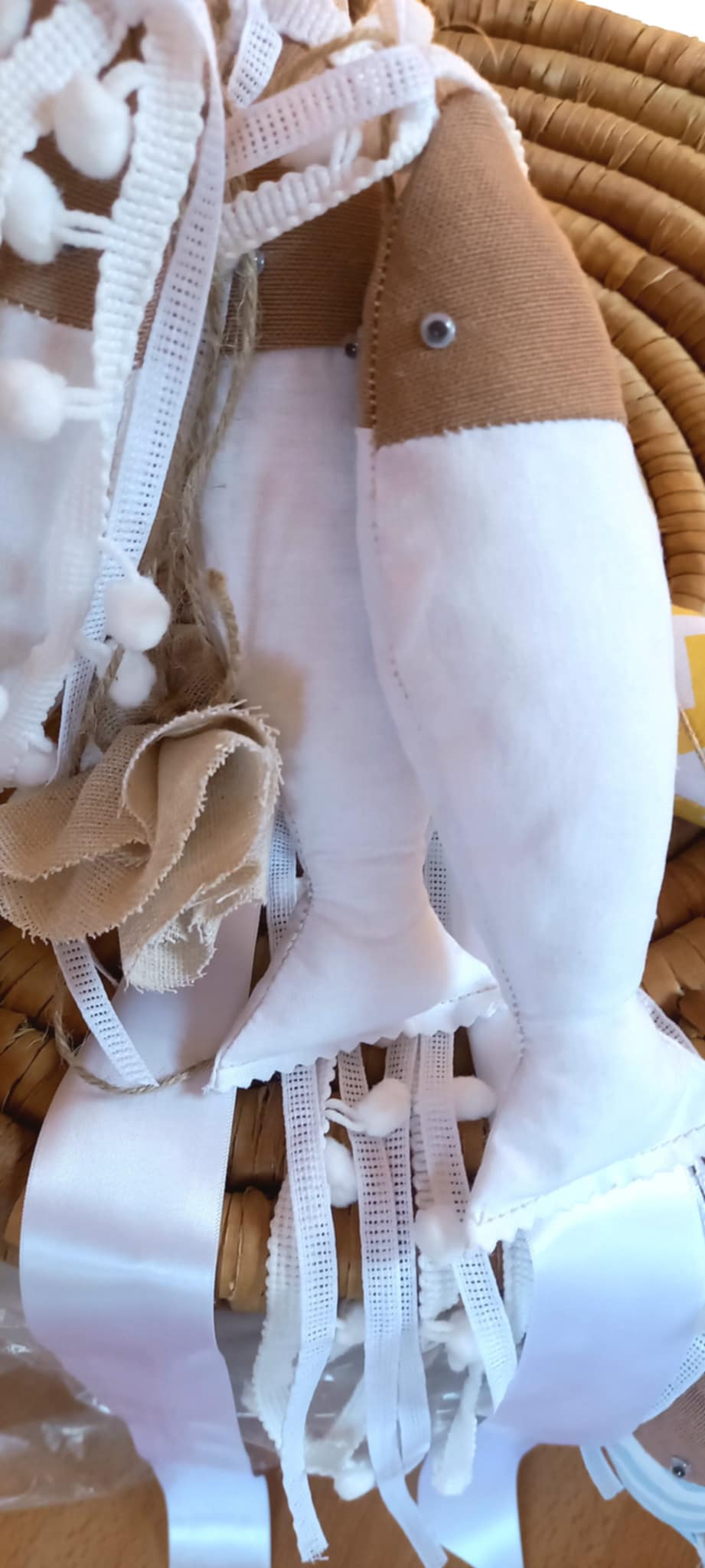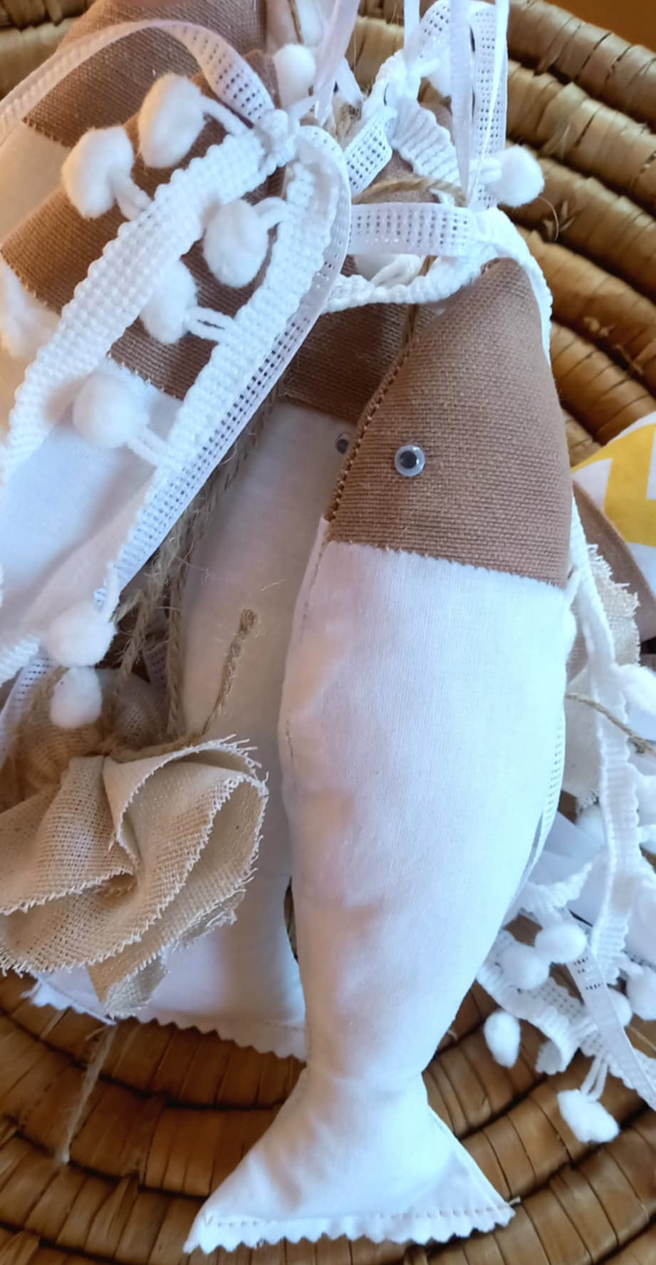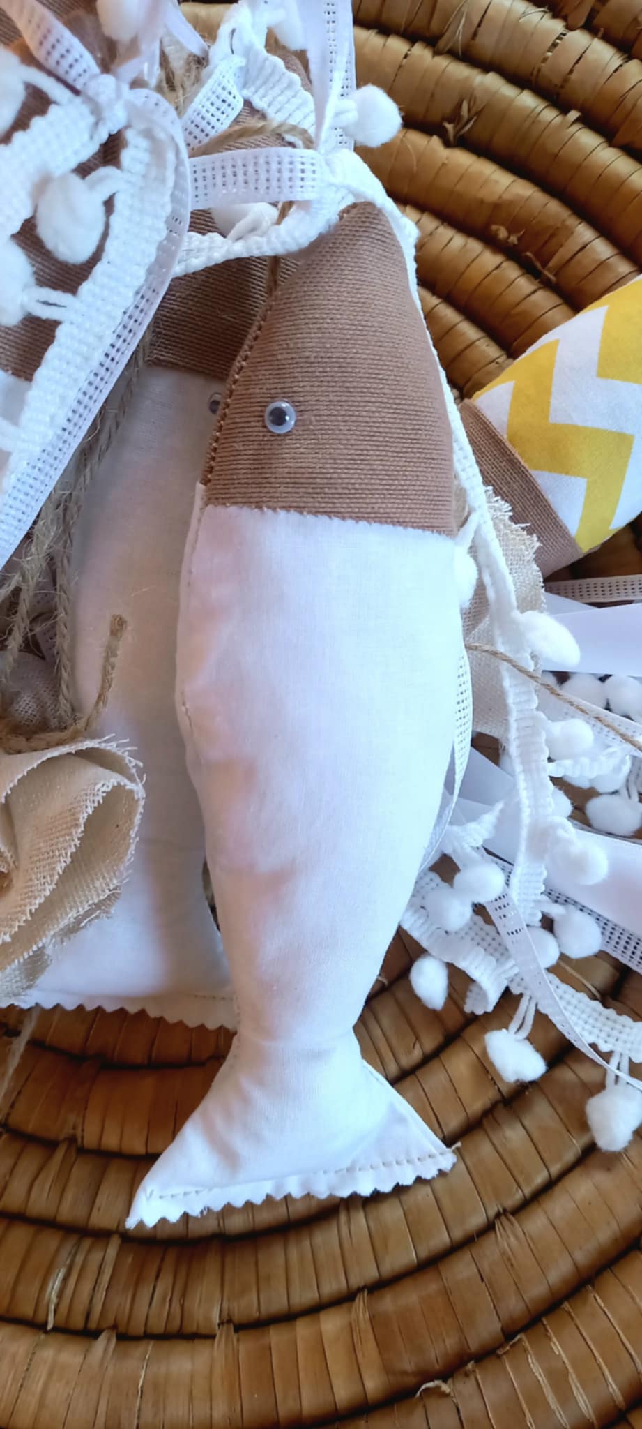 Χειροποίητη μπομπονιέρα βάπτισης ψαράκι από ύφασμα σε λευκό χρώμα.