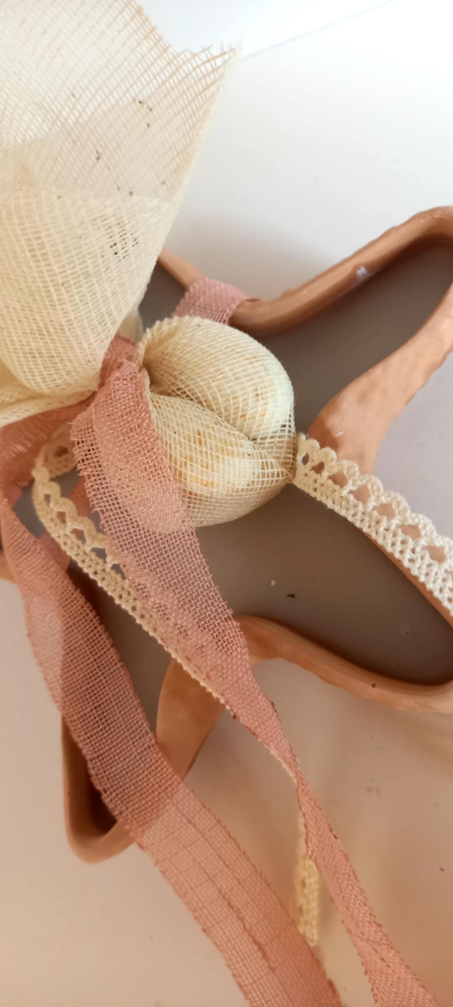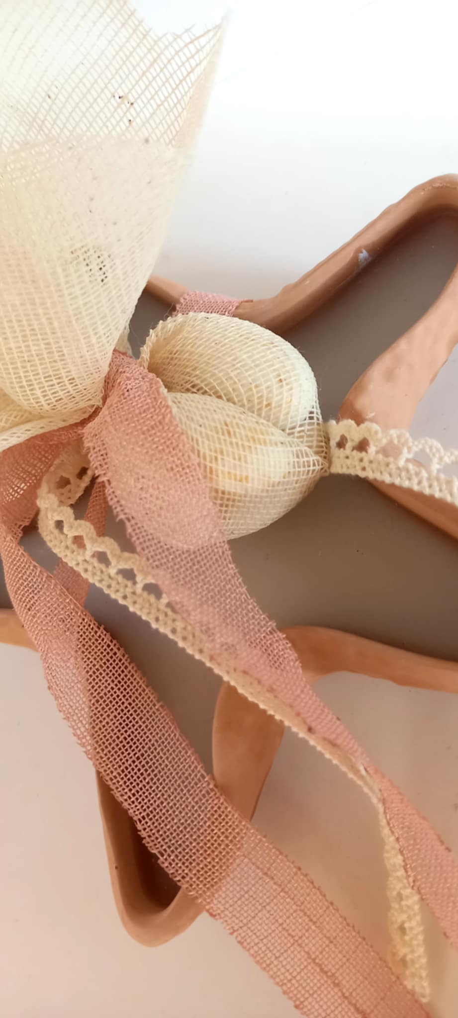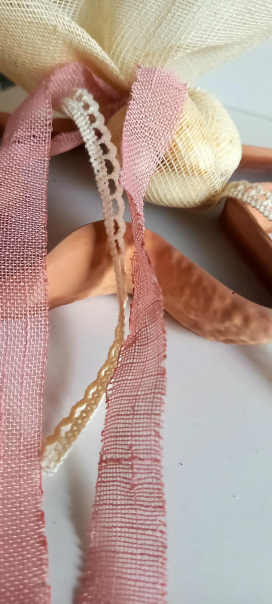Περιλαμβάνει τρία κουφέτα Χατζηγιαννάκη με γεύση straciatella τυλιγμένα σε γάζα στο χρώμα της άμμου, κορδέλα σε όμοια απόχρωση και δαντέλα.